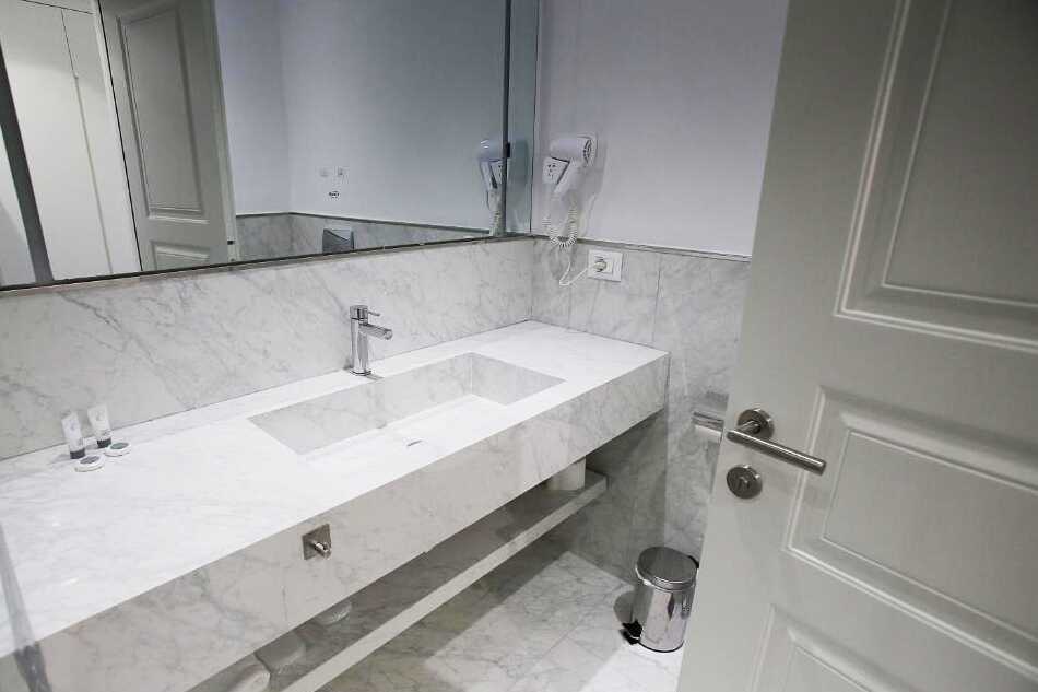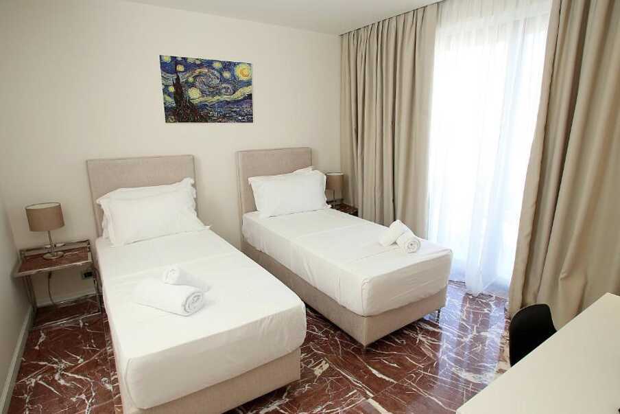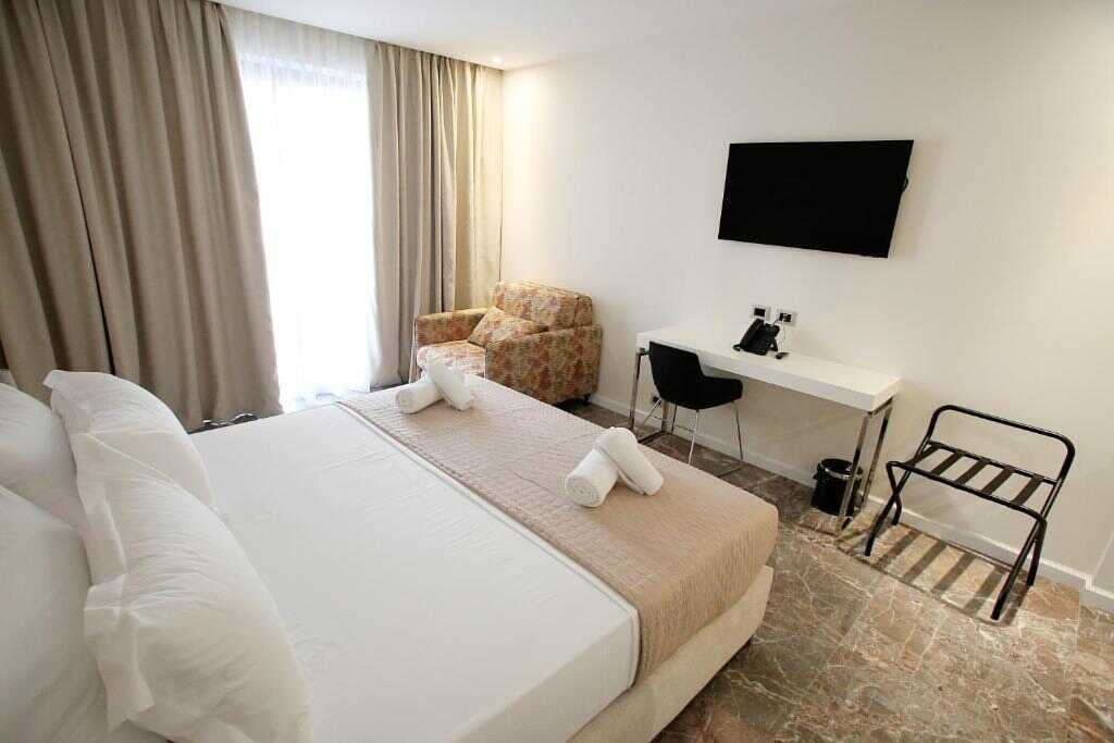Tweepersoonskamer met balkon Een tweepersoonsbed of twee eenpersoonsbedden. Wifi, airconditioning en kluisje inbegrepen. Tv. Föhn. Badkamer met bad/douche en toilet. Schoonmaak 7 keer/week.
