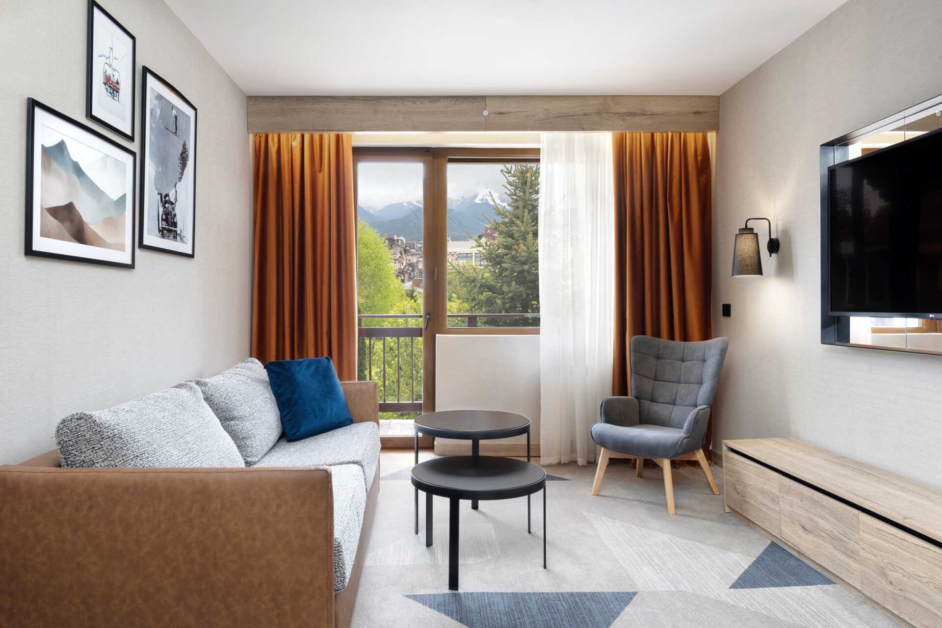 Familiekamer met balkon. Een slaapkamer met een tweepersoonsbed en een kamer met de mogelijkheid van een extra bed in een slaapbank. Wifi, kluis en verwarming via airconditioning inbegrepen. Minibar. Waterkoker en koffie en thee. TV met internationale zenders. Ingerichttapijt. Strijkijzer en strijkplank. föhn Badkamer met douche en toilet. Schoonmaak 6 keer / week.