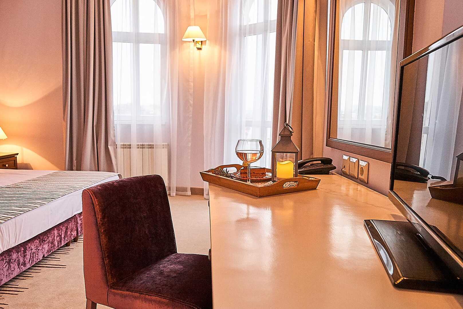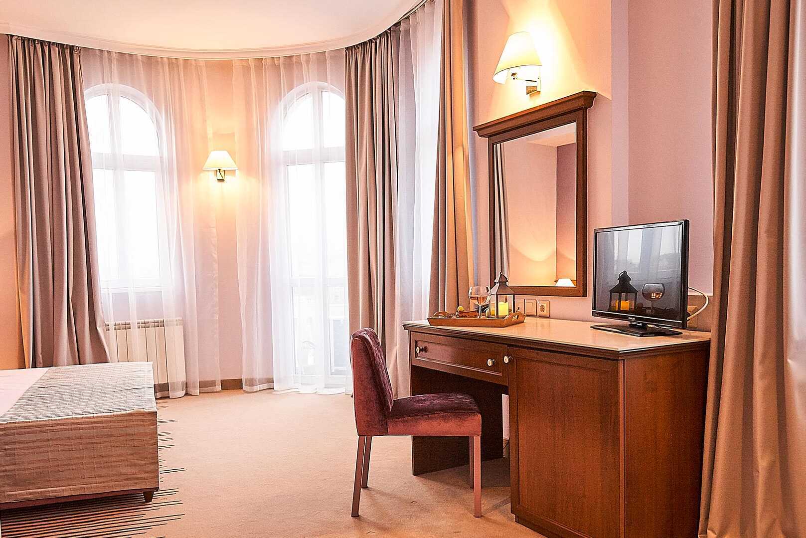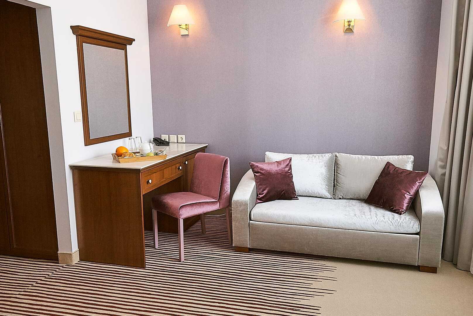 Deluxe kamer, zonder buitenruimte. Een tweepersoonsbed. Mogelijkheid tot een extra bed in de vorm van een slaapbank. Wifi, airconditioning en verwarming zijn inbegrepen. Koelkast. Tv met internationale zenders. Vloerbedekking. Föhn. Badkamer met bad of douche en toilet. Schoonmaak 6 keer/week.