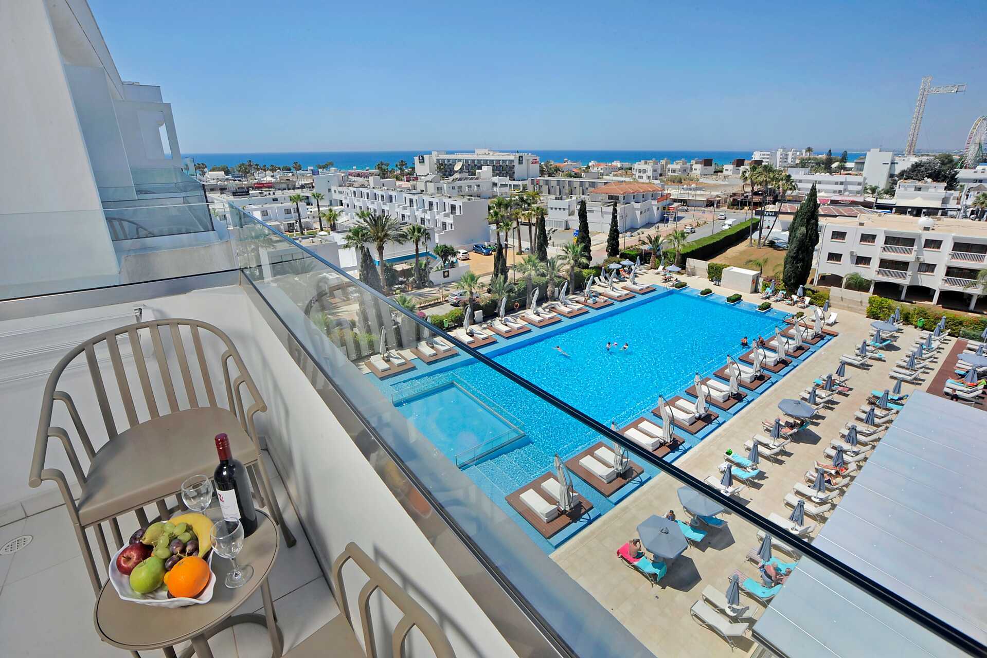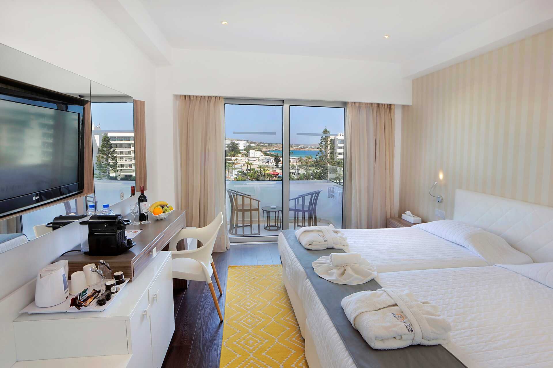 Deluxe kamers met balkon met beperkt zeezicht. Eén tweepersoonsbed of twee eenpersoonsbedden. Mogelijkheid van extra slaapplek in opklapbed. Wifi, airconditioning en kluisje inbegrepen. Minikoeler. Espresso koffiezetapparaat. TV met internationale zenders. Bij aankomst staat er fruit en wijn klaar op de kamer. Badjassen en slippers. Föhn. Badkamer met douche en toilet. Schoonmaak 7 keer/week. Kinderen jonger dan twee jaar zijn inbegrepen bij het maximaal aantal personen op de kamer.