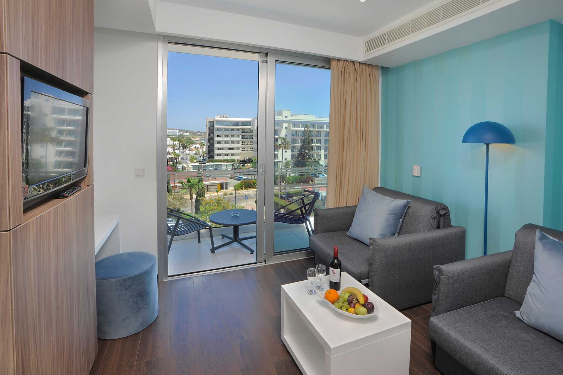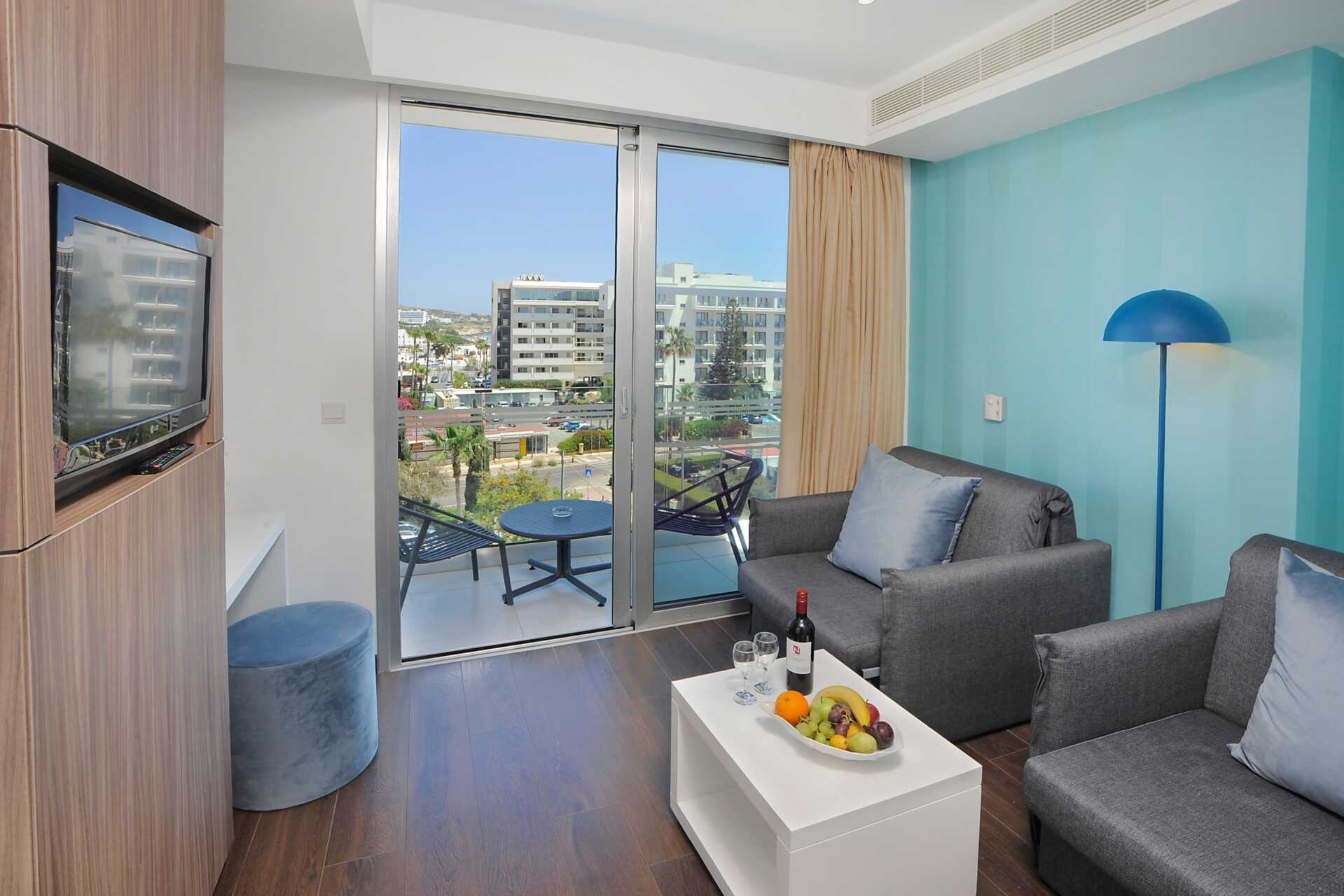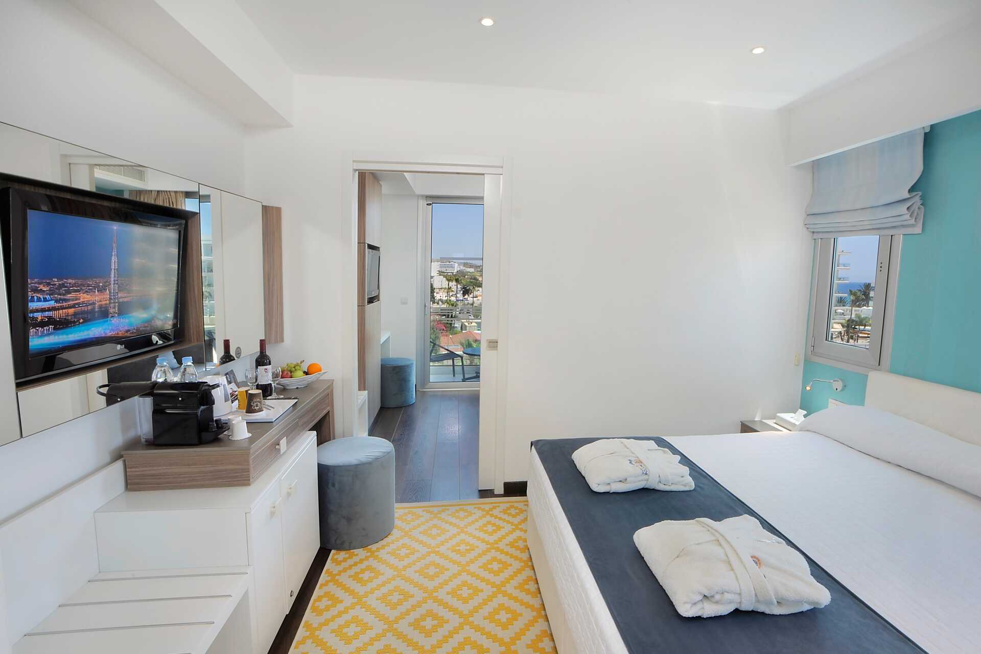 Junior suites met balkon en beperkt zeezicht. De junior suite bestaat uit een slaapkamer met een zithoek. Een tweepersoonsbed. Mogelijkheid voor een extra bed op de slaapbank. In sommige kamers is het slaapgedeelte door schuifdeuren gescheiden van het zitgedeelte. Wifi, airconditioning en kluis inbegrepen. Koelkast. Waterkoker en koffie en thee. Nespresso-apparaat - capsules inbegrepen en elke dag bijgevuld. TV met internationale zenders. Bij aankomst staan er fruit en wijn op de kamer klaar. Badjassen en slippers Föhn. Badkamer met douche en wc. Schoonmaak 7 keer/week. Kinderen jonger dan twee jaar zijn inbegrepen in het maximale aantal personen in de kamer.