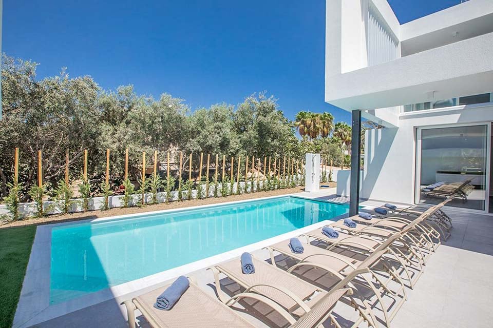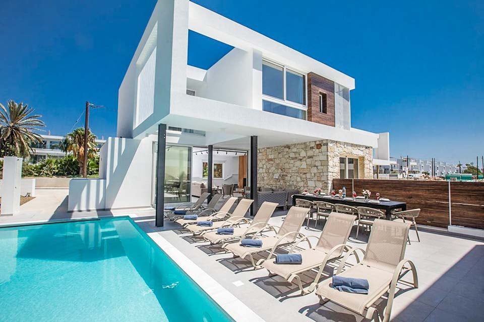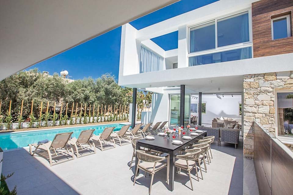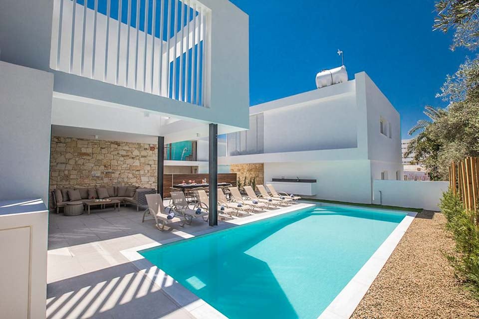 Wanneer u de villa binnenkomt, komt u in een open leefruimte terecht die baadt in het natuurlijke licht dat door de kamerhoge ramen en glazen schuifdeuren naar binnen valt. Het kleurenpalet is kalm en rustgevend, gecombineerd met een minimalistisch interieurontwerp, chique meubels en eenvoudige decoratie. Een chique eettafel scheidt de keuken van de rest van de begane grond, die volledig is uitgerust met moderne apparatuur. Voor extra luxe is er zelfs een speelkamer met een tafeltennistafel en een zaalvoetbalspel. Zeer ruim, met twee slaapkamers met een tweepersoonsbed en drie slaapkamers met twee eenpersoonsbedden, verdeeld over drie verdiepingen. Het hotel ligt in het centrum van Ayia Napa, op slechts een paar minuten lopen van de met restaurants gevulde Nissi Avenue. Voor een dagje strand kunt u terecht bij het fijne witte zand en het langzaam aflopende water van Vathia Gonia-strand, dat zich net om de hoek bevindt.