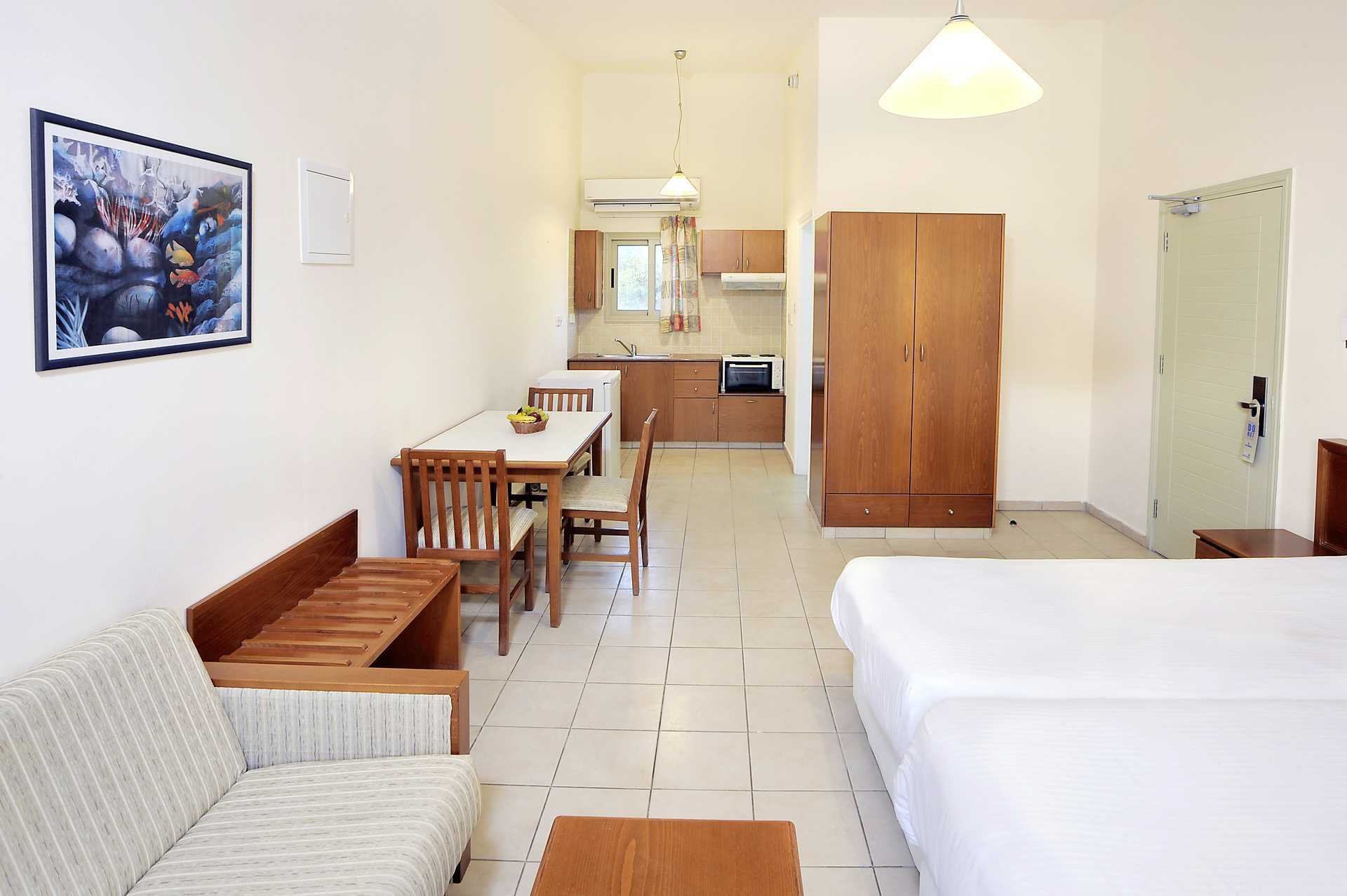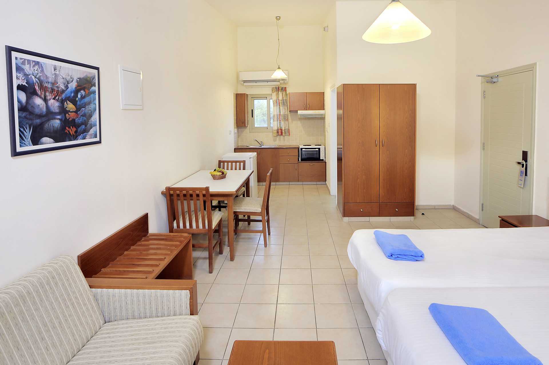 Studio met balkon. De studio's bevinden zich in het bungalowgedeelte van het hotel - de weg moet worden overgestoken om bij het hoofdgebouw te komen. Gecombineerde slaapkamer en woonkamer met minikeuken. Twee eenpersoonsbedden. Mogelijkheid voor extra bedden in slaapbank. Minikeuken met koelkast, kookplaat en oven en basiskeukengerei. Airconditioning en kluisje inbegrepen. Tv met internationale zenders. Föhn. Badkamer met douche en toilet. Schoonmaak 7 keer / week. Kinderen jonger dan twee jaar zijn inbegrepen bij het maximum aantal personen in het appartement.