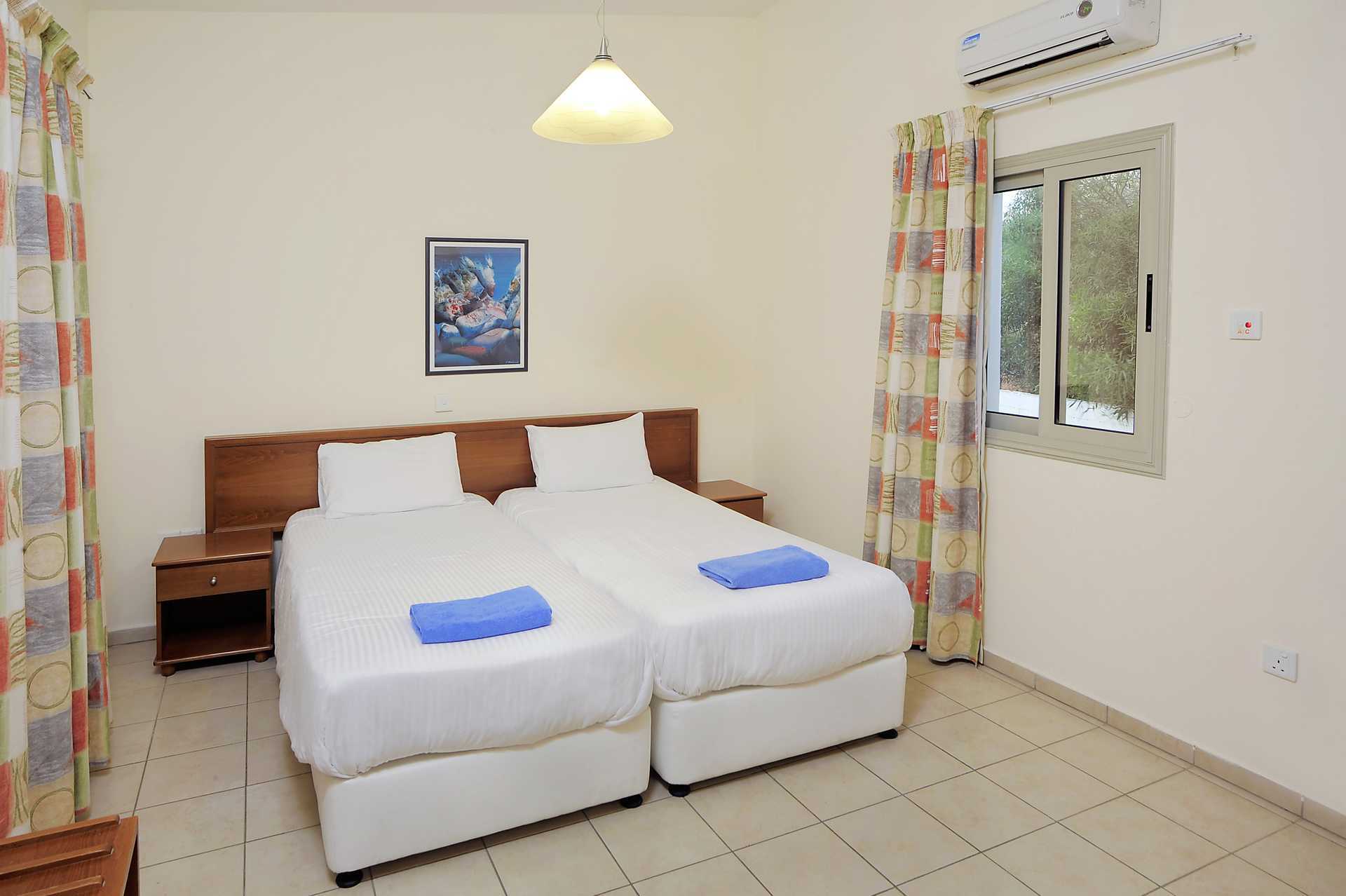 Tweekamerappartement met balkon. De appartementen bevinden zich in het bungalowgedeelte van het hotel - de weg moet worden overgestoken om bij het hoofdgebouw te komen. Trap met vijf treden tussen woonkamer en slaapkamer. Slaapkamer en een gecombineerde woonkamer met minikeuken. Twee eenpersoonsbedden. Mogelijkheid voor extra bedden in slaapbank. Minikeuken met koelkast, kookplaten, oven en basiskeukengerei. Airconditioning en kluisje inbegrepen. Tv met internationale zenders. Föhn. Badkamer met douche en toilet. Schoonmaak 7 keer / week. Kinderen jonger dan twee jaar zijn inbegrepen bij het maximum aantal personen in het appartement.