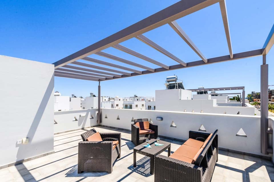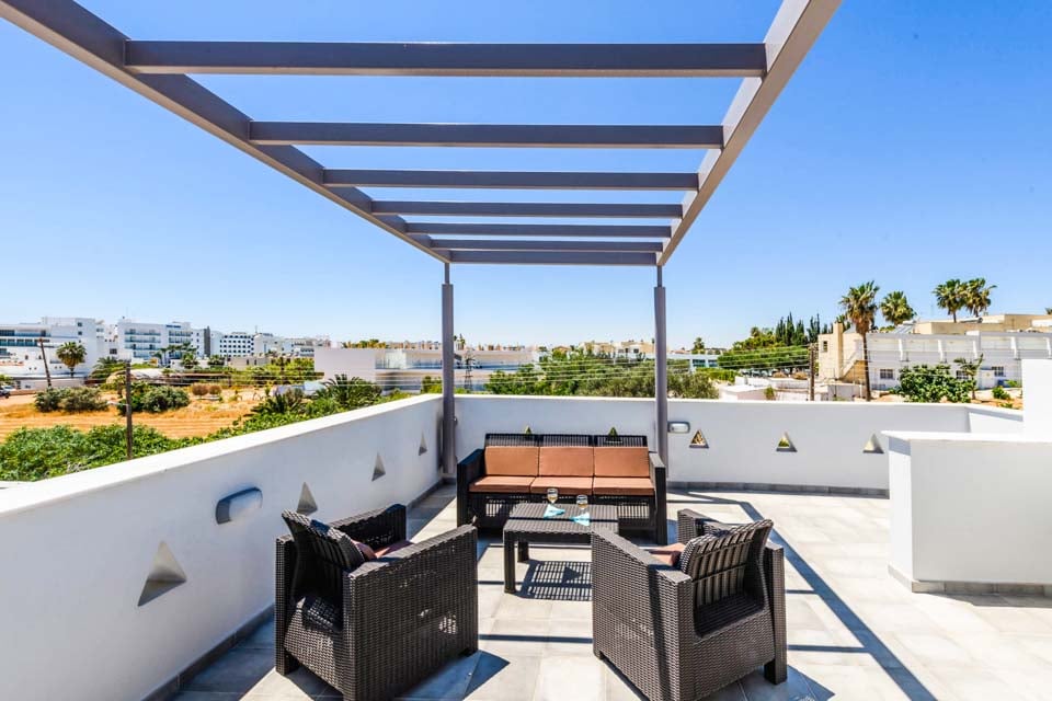 Het interieur stelt niet teleur: zodra u binnenstapt, ervaart u een gevoel van ruimte en warmte. De begane grond bestaat uit een lichte woonkamer, ingericht met neutrale tinten en gecombineerd met eenvoudige meubels en een minimalistische inrichting. Aangrenzend vindt u een strakke eettafel en een luxe keuken, volledig uitgerust met de nieuwste moderne gemakken. Dit pareltje in Ayia Napa biedt voldoende ruimte voor maximaal zes volwassenen, met twee eenpersoonskamers en twee tweepersoonskamers verdeeld over twee verdiepingen.