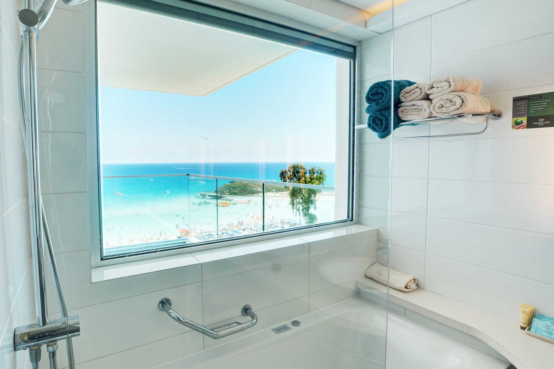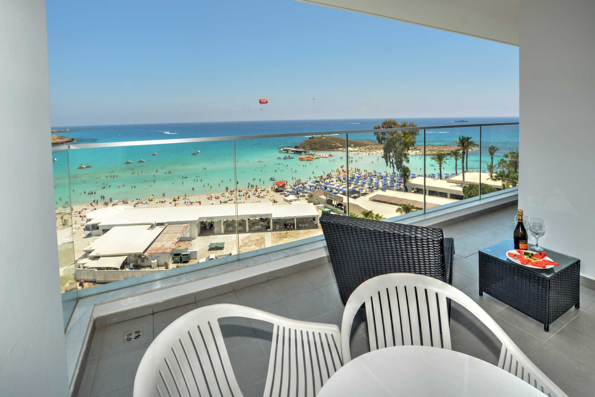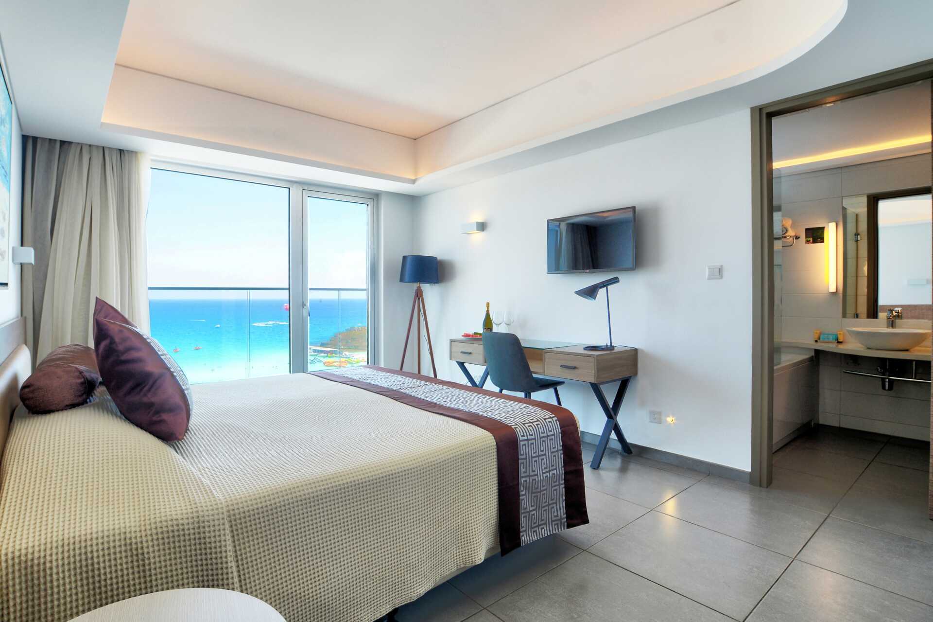 Junior suite met balkon en uitzicht op zee. De suite bestaat uit een slaapkamer en een woonkamer. Een tweepersoonsbed. Mogelijkheid voor extra bedden in slaapbank. Wifi, airconditioning en kluisje inbegrepen. Koelkast. Waterkoker en koffie en thee. Föhn. Badkamer met douche en toilet. Schoonmaak 7 keer/week.