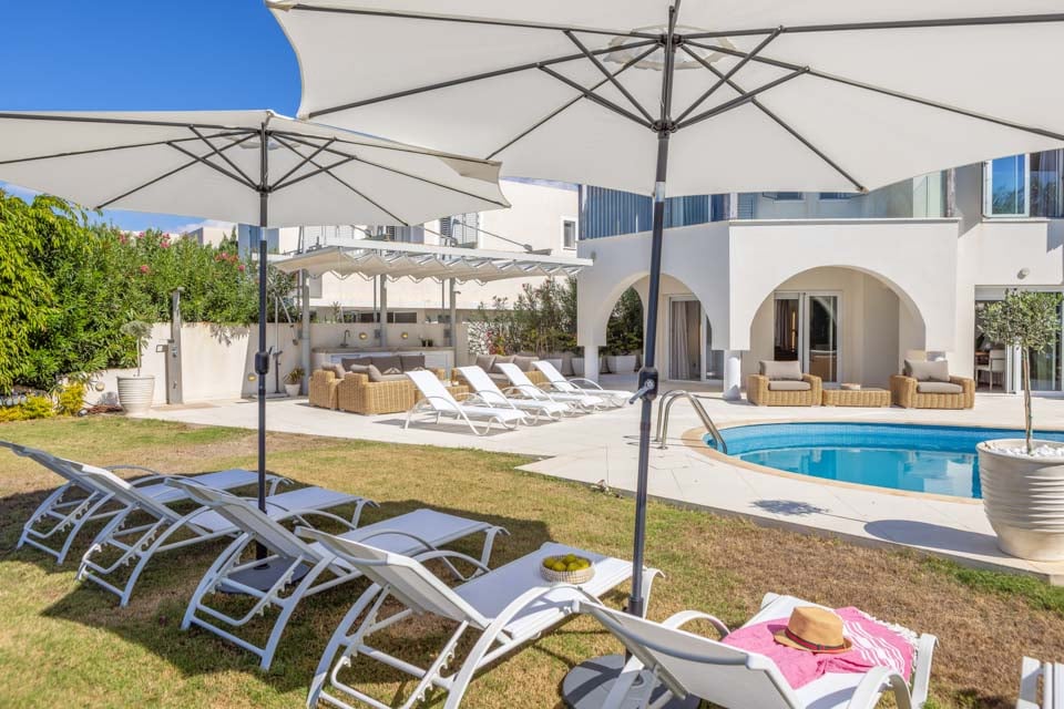 Word wakker met een balkon met een weids uitzicht op zee. En als u uw ochtendkoffie drinkt met dit sensationele uitzicht, wilt u nooit meer naar huis. Dit stukje paradijs is uw toegangspoort tot puur geluk. Breng luie dagen door op uw comfortabele ligstoel bij het zwembad. Het enige wat u nodig heeft is uw zonnebril, een koptelefoon voor die belangrijke afspeellijsten tijdens de vakantie en voldoende SPF om u te beschermen tegen de brandende zon. Neem regelmatig een duik in het ontspannende water van uw privézwembad of vermaak u en spetter erop los. Nog voor de avond valt, bent u al verliefd op het relaxte leven. En als de avond valt, is de moeilijkste beslissing of u samenkomt aan de prachtige eettafel of buiten gaat dineren onder de sterrenhemel. Als u de kans krijgt, neem dan, terwijl uw geliefden kletsen, even de tijd om te genieten van het rustgevende geluid van de golven en geniet ondertussen van heerlijke Cypriotische lekkernijen.
