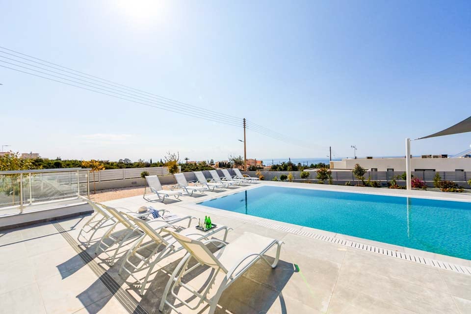 De buitenruimte van de villa is schitterend, met een fantastisch overloopzwembad met whirlpool, een zonneluifel, een ingebouwde barbecue en een zitgedeelte buiten voor wie buiten wil eten en wil genieten van de warme zomeravonden. Vanaf het terras en de balkons op de eerste verdieping kunt u genieten van het uitzicht op zee. Er is bovendien voldoende ruimte om te ontspannen met een boek en te genieten van de zon tijdens uw ontspannende villavakantie op Cyprus.