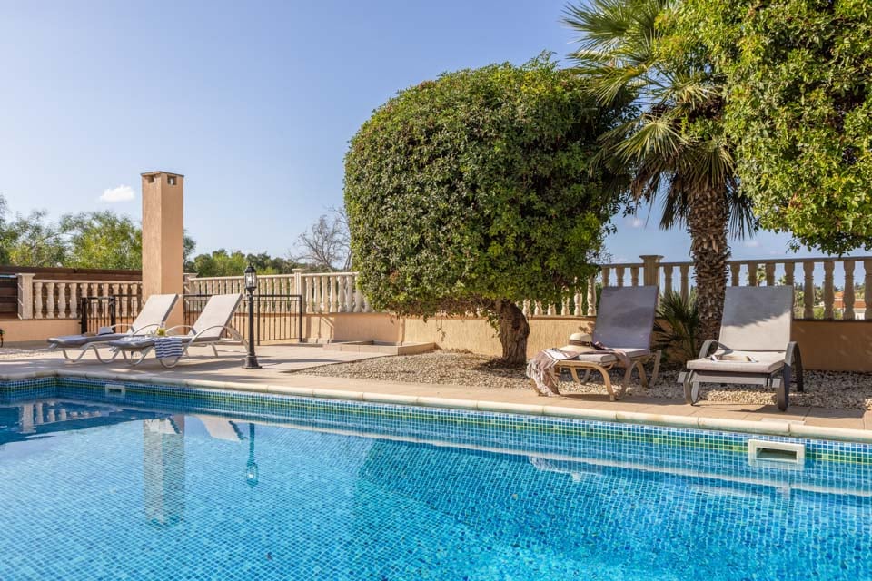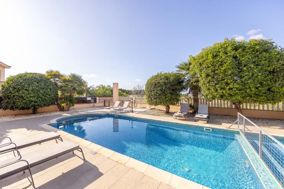 De villa beschikt over een groot privézwembad met inlooptrappen, inclusief een groot privé-buitengedeelte met een eethoek in de buitenlucht, een buitenlounge en een volledige collectie tuinmeubilair, waaronder ligbedden en parasols.