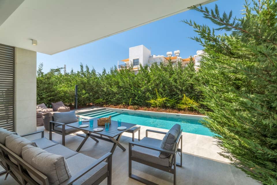 Het terras met het glinsterende zwembad en de brede trappen, omgeven door groenblijvende struiken, is zonder twijfel de plek waar u de meeste tijd zult doorbrengen. Op de bovenste verdieping van de villa vindt u ook een dakterras met een eettafel en uitzicht op de Middellandse Zee. Vanaf het terras leiden openslaande deuren die van de vloer tot het plafond reiken naar de open woonkamer, keuken en eetkamer. De volledig uitgeruste keuken is ideaal voor uw self-cateringvakantie, met de benodigde keukengerei, een koel-vriescombinatie, magnetron en vaatwasser.