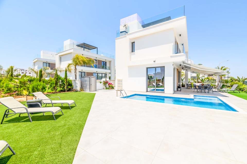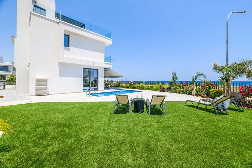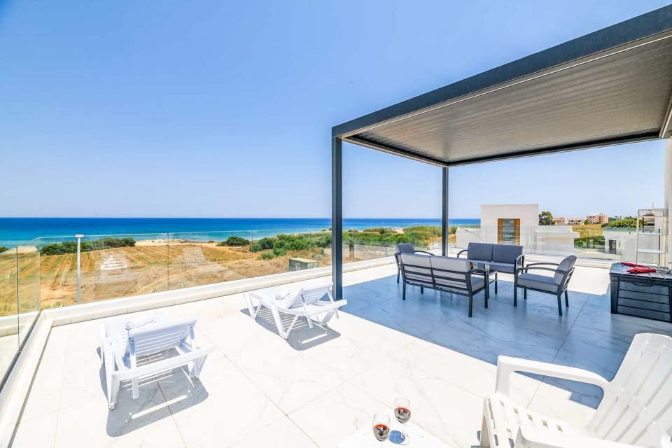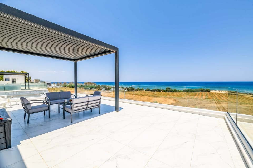 Emerald Seaview ligt op een ruim hoekperceel en biedt een prachtig uitzicht op zee vanaf het zwembadterras, de mediterrane palmbomen, de eethoek in de openlucht en de ligstoelen. Dit moderne terras is de ideale plek voor een ontspannen dagje bij het zwembad, terwijl u in stijl geniet van de zon met een goed boek en een huisgemaakte cocktail.