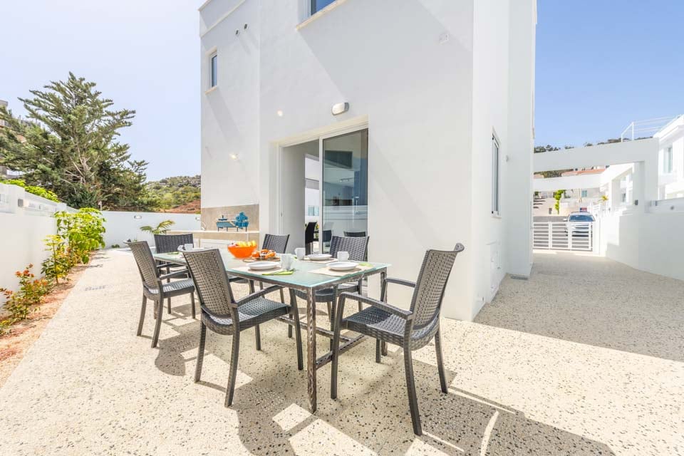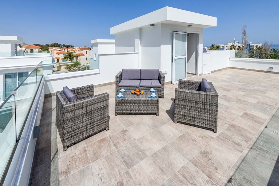 Ga naar boven en kom tot rust in een van de drie ruime slaapkamers: een hoofdslaapkamer, een luxe tweepersoonskamer en een kamer met twee eenpersoonsbedden, ideaal voor jongere gasten. Stap naar buiten op uw eigen privé dakterras: het ongeëvenaarde juweel in de kroon. Leun achterover, ontspan met uw favoriete drankje en bewonder de zonsondergang aan de levendige Middellandse Zeekust. Adem de frisse zeelucht van Protaras in.