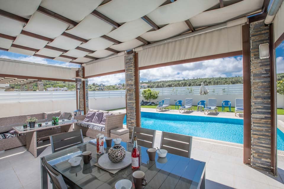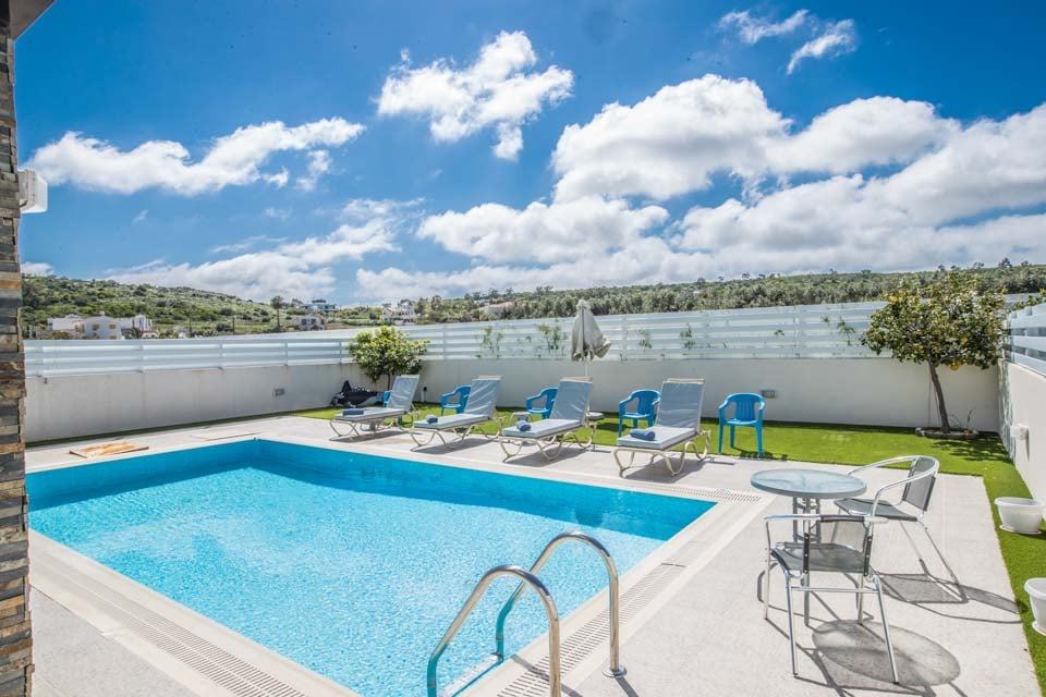 Via de brede openslaande deuren ontdekt u een ruime tuin met toegang tot het privézwembad. De ideale plek om het hele jaar door van de zon te genieten. Hier vindt u een schaduwrijke zithoek, ligstoelen met kussens, tuinmeubilair en barbecuefaciliteiten. Voor een panoramisch uitzicht over het ruige eilandlandschap kunt u terecht op het indrukwekkende dakterras.