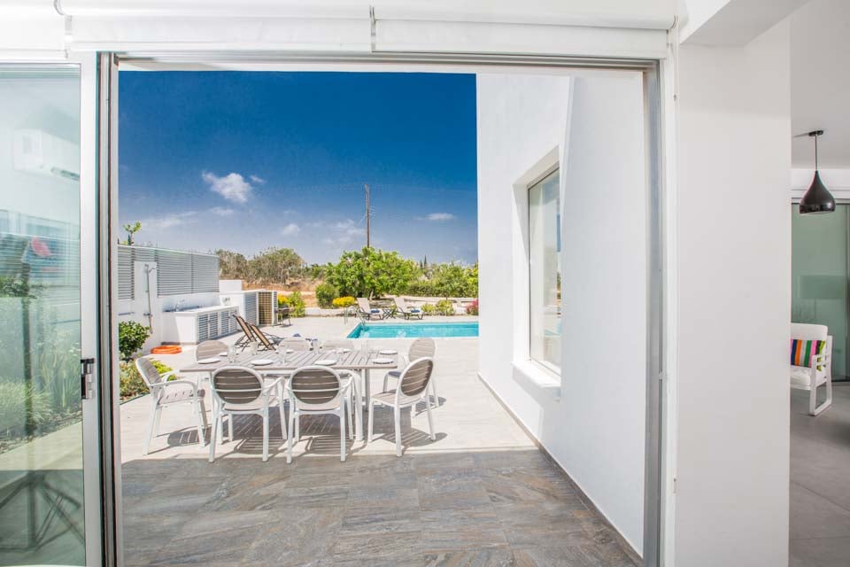 Binnen zijn de Protaras Greco Villas verdeeld over 3 verdiepingen. Op de benedenverdieping bevinden zich de eerste twee slaapkamers met toegang van buitenaf. Deze twee slaapkamers zijn ideaal voor wie wat extra ruimte wil, weg van de hoofdvilla. De begane grond bestaat uit een open woon-, eet- en keukenruimte. Deze lichte kamer heeft een moderne stijl en baadt in het natuurlijke licht. De derde slaapkamer bevindt zich ook op de begane grond en heeft toegang tot een doucheruimte. Boven vinden we de overige twee slaapkamers met een eigen balkon en toegang tot een aparte badkamer.