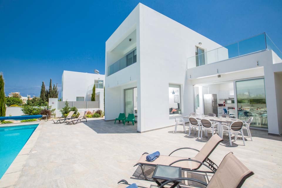 Protaras Greco Villas zijn een must-see. Deze moderne, witgekalkte villa's hebben 5 slaapkamers en 3 badkamers en zijn ideaal voor grotere groepen die samen op vakantie willen naar het zonnige eiland Cyprus. Op het ruime terras vindt u een groot zwembad van 10x4m, omgeven door ligstoelen en mediterrane bloemen en struiken. Er is een overdekt terras voor wie in de schaduw wil zitten en een open terras voor zonaanbidders. Buiten staat ook een pooltafel, ideaal voor een gezonde competitie met vrienden. Geniet van een dagje bij het zwembad en een lichte lunch in de buitenlucht terwijl u culinaire hoogstandjes bereidt met verse producten van de nabijgelegen supermarkt. Bestaat er een betere manier om je vakantie door te brengen?