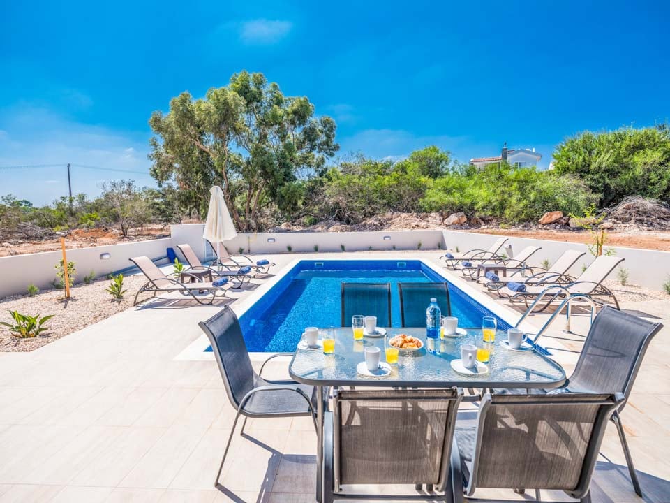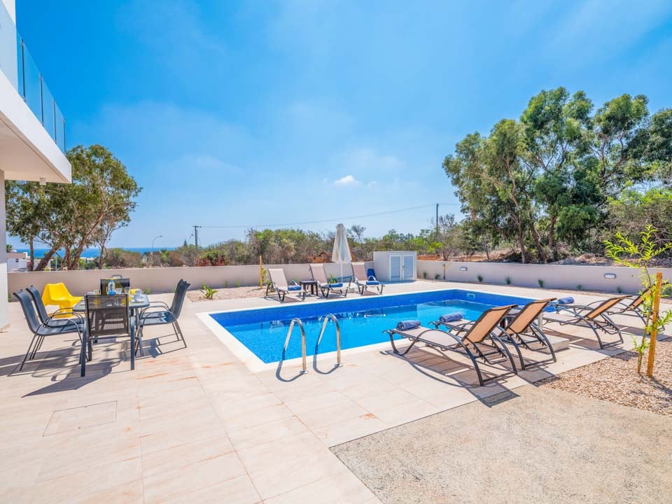 Buiten, in de grote, ruime tuin, vindt u een barbecue, een buiteneethoek, een buitendouche, ligstoelen en een groot privézwembad met uitzicht op zee. Een prachtige en moderne villa, de ideale keuze voor wie op zoek is naar een rustige en ontspannen vakantie.