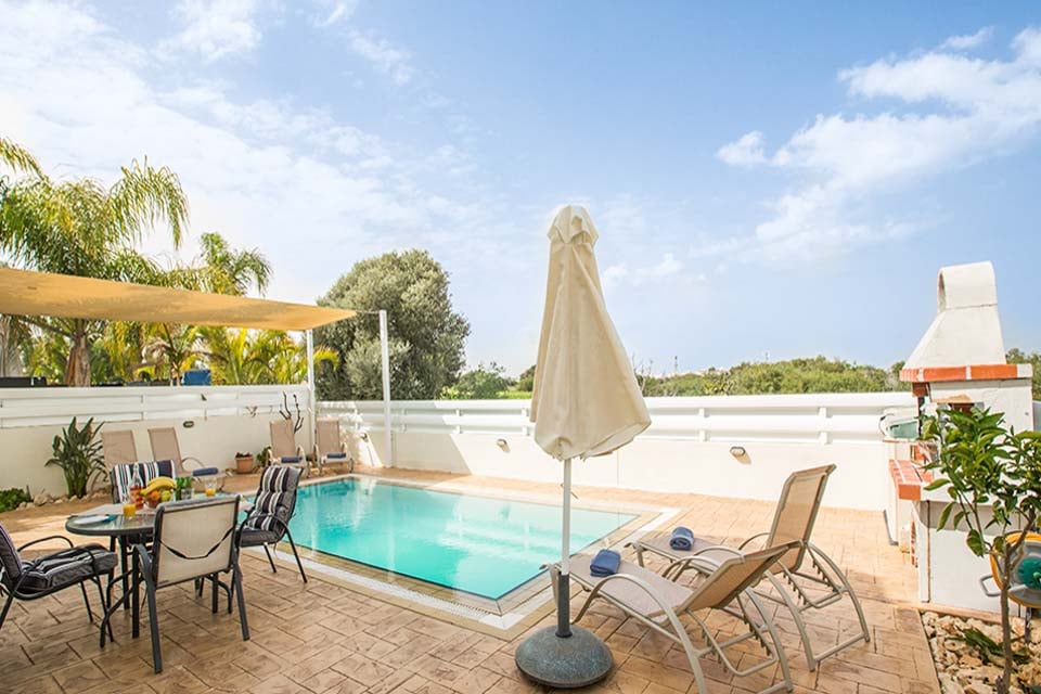 Buiten in de privé- en omheinde tuin bevindt zich een zwembad van 8 x 4 meter, omgeven door ligstoelen, een parasol en een overdekt terras voor de broodnodige schaduw tegen de middagzon. Een terrastafel met stoelen, een ingebouwde barbecue en een spoelbak vormen de ideale setting om buiten te eten en gasten te ontvangen tijdens de lange zomeravonden. Over het algemeen is dit een geweldige villa-optie voor gezinnen die op vakantie willen, niet ver van alle voorzieningen.