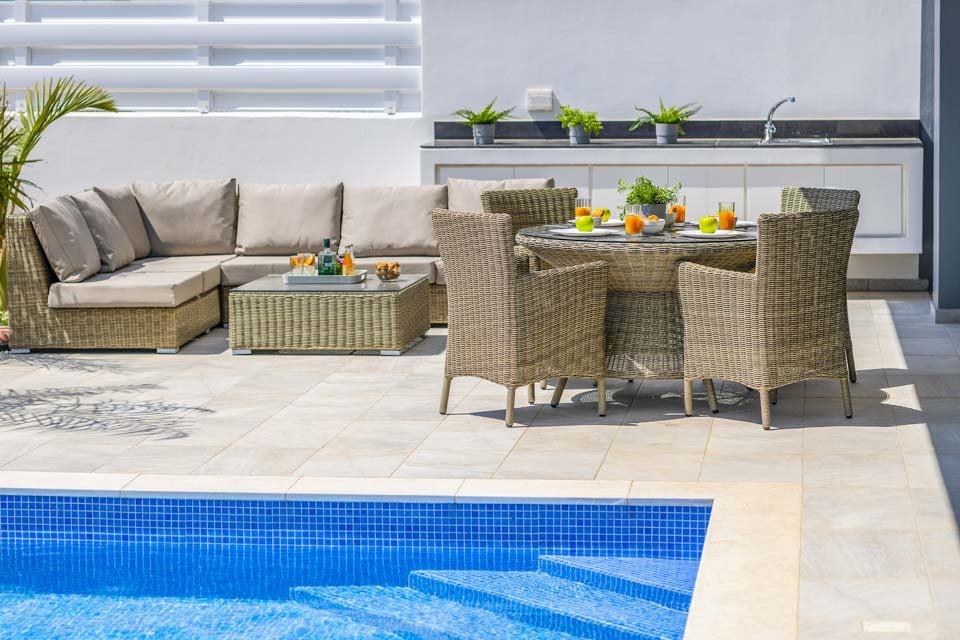 De moderne, open woon-, eet- en keukenruimte is voorzien van grote, kamerhoge deuren die uitkomen op het open terras en het zwembad. Boven vindt u 3 slaapkamers, elk met airconditioning voor de warme zomeravonden. Royal Pearl 7 beschikt tevens over een uniek dakterras met pergola en prachtig uitzicht op zee.