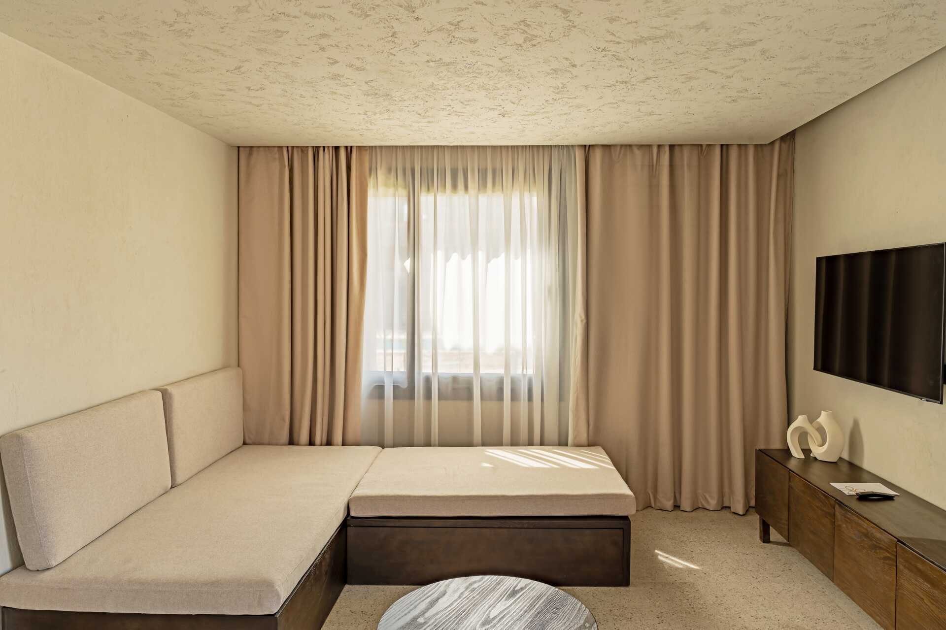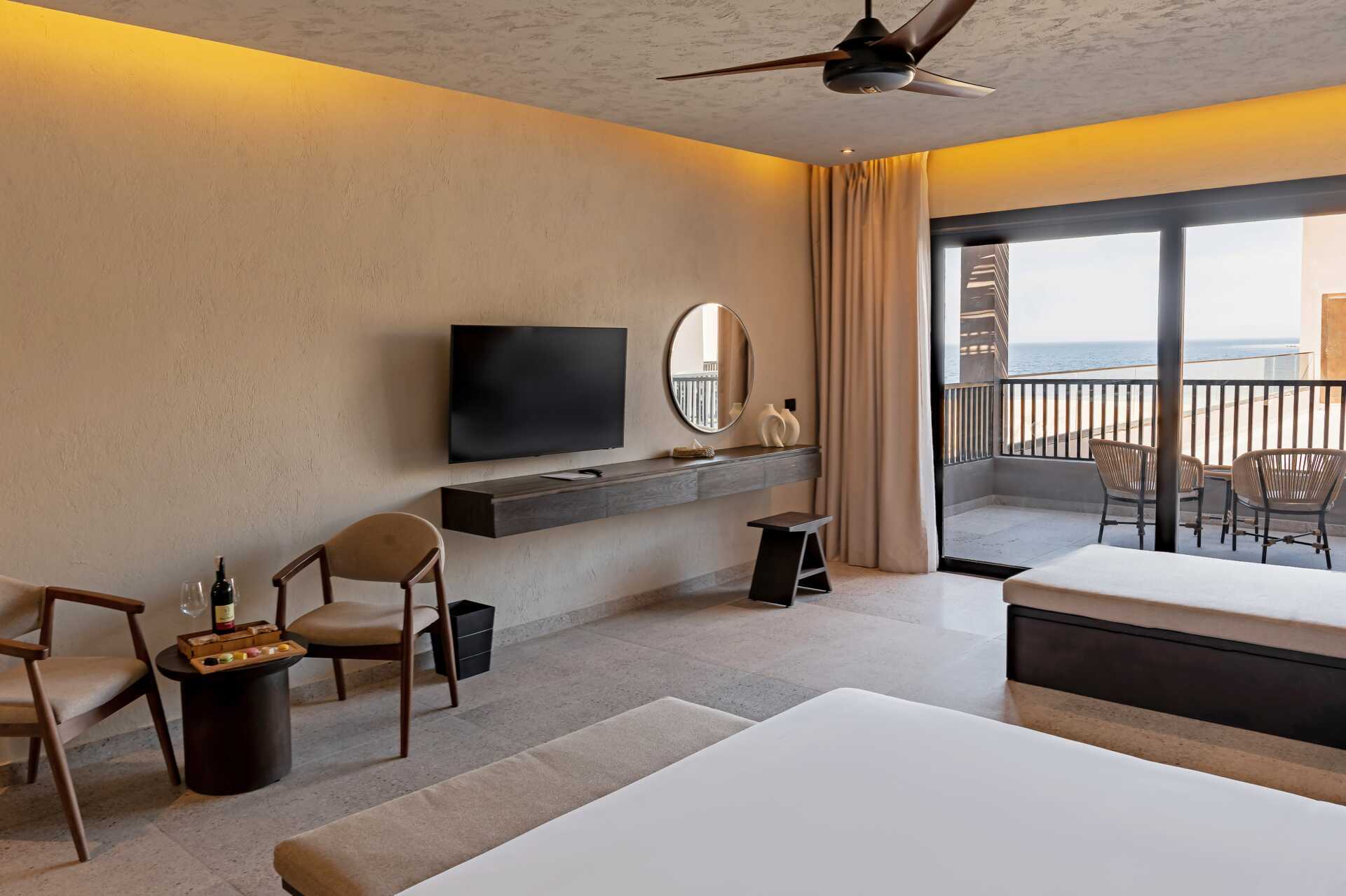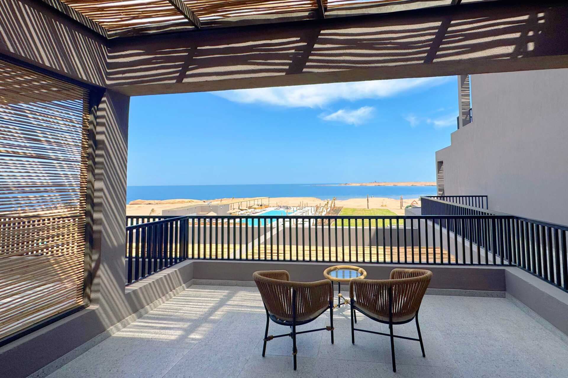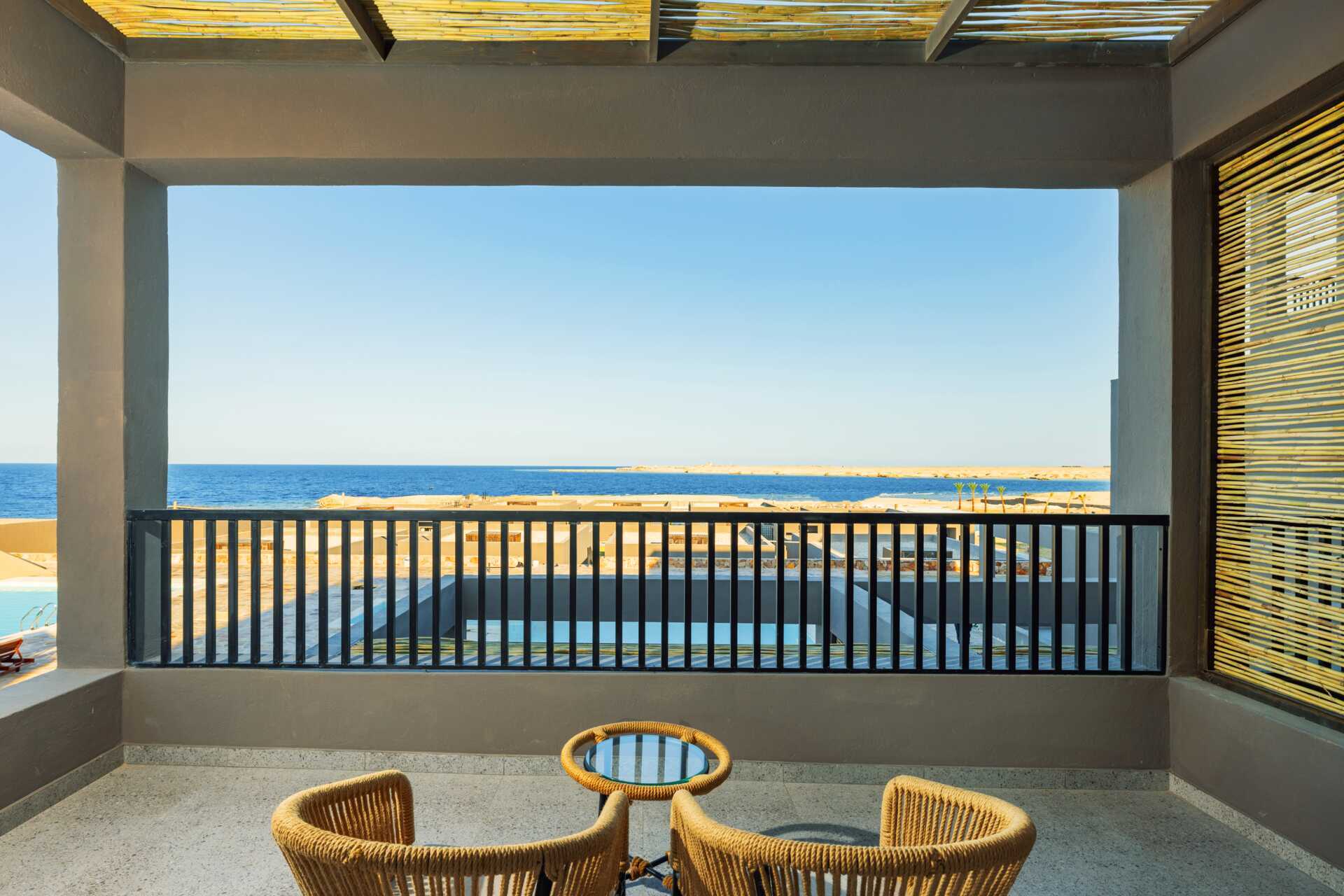 Suite met terras op de begane grond en zeezicht. Een tweepersoonsbed of twee eenpersoonsbedden. Mogelijkheid tot extra bedden in de vorm van een slaapbank. Wifi, airconditioning en kluisje inbegrepen. Minibar tegen betaling. Waterkoker, koffie en thee. Tv met internationale zenders. Föhn. Badkamer met douche en toilet. Schoonmaak 7 keer per week.