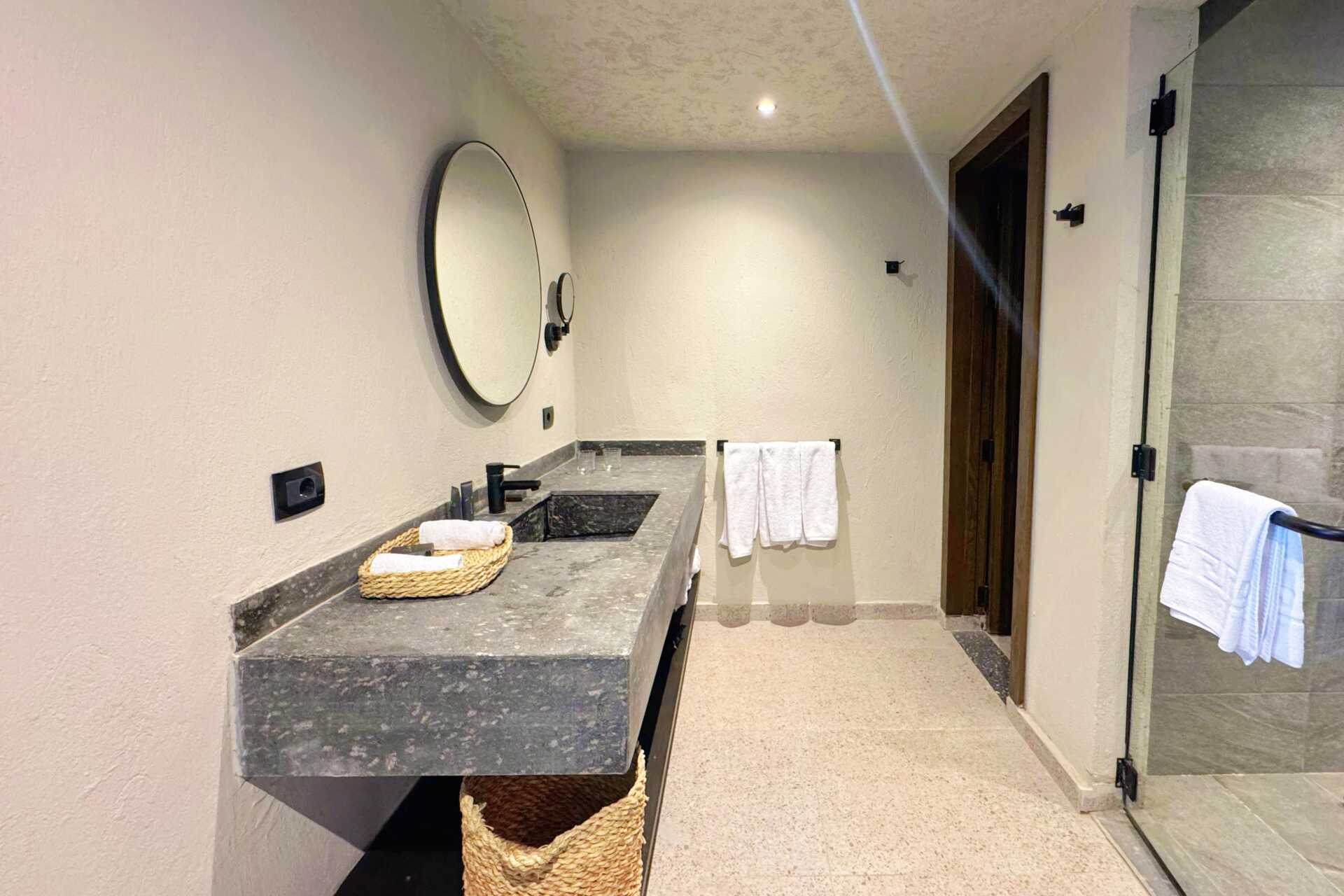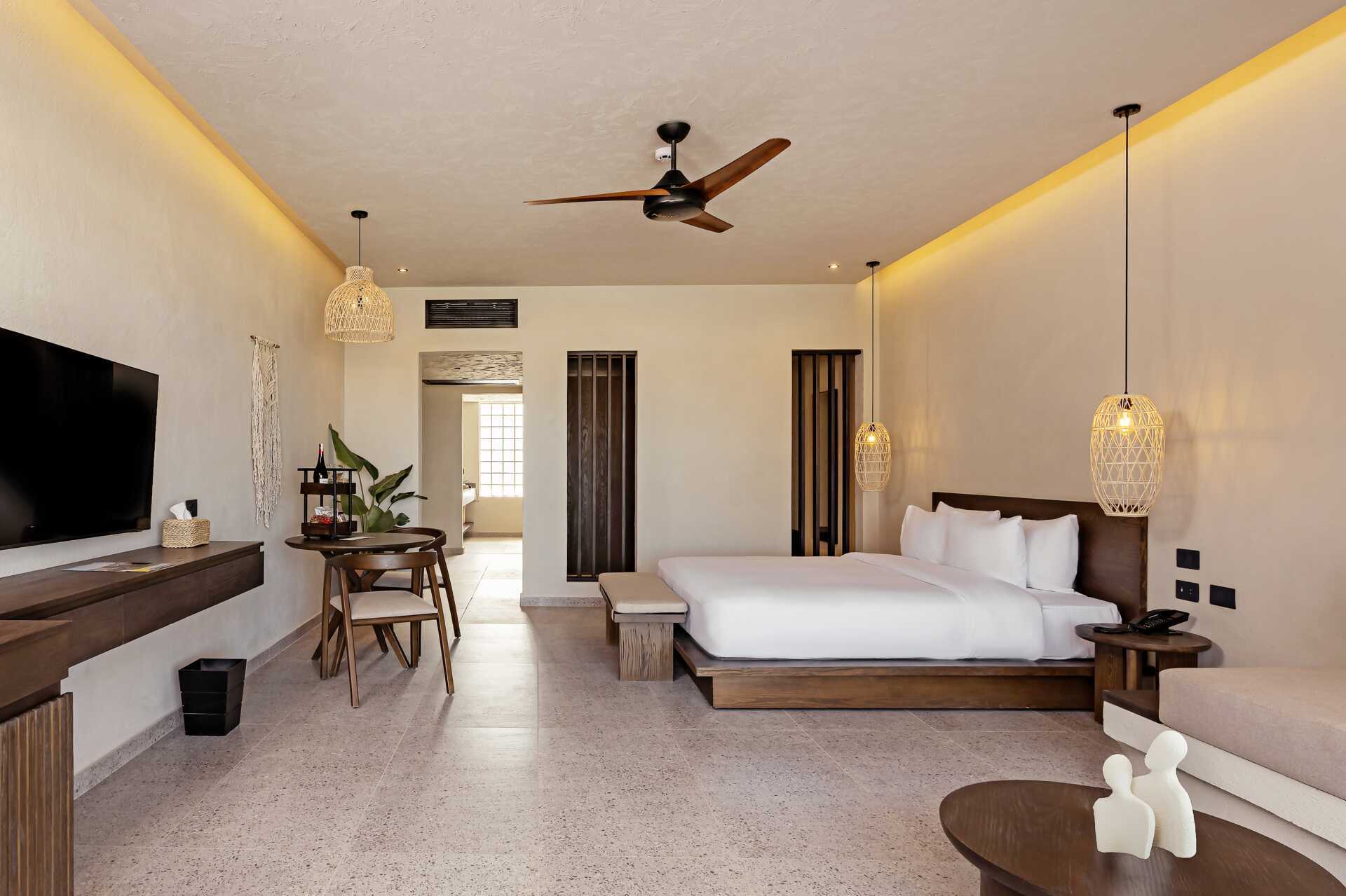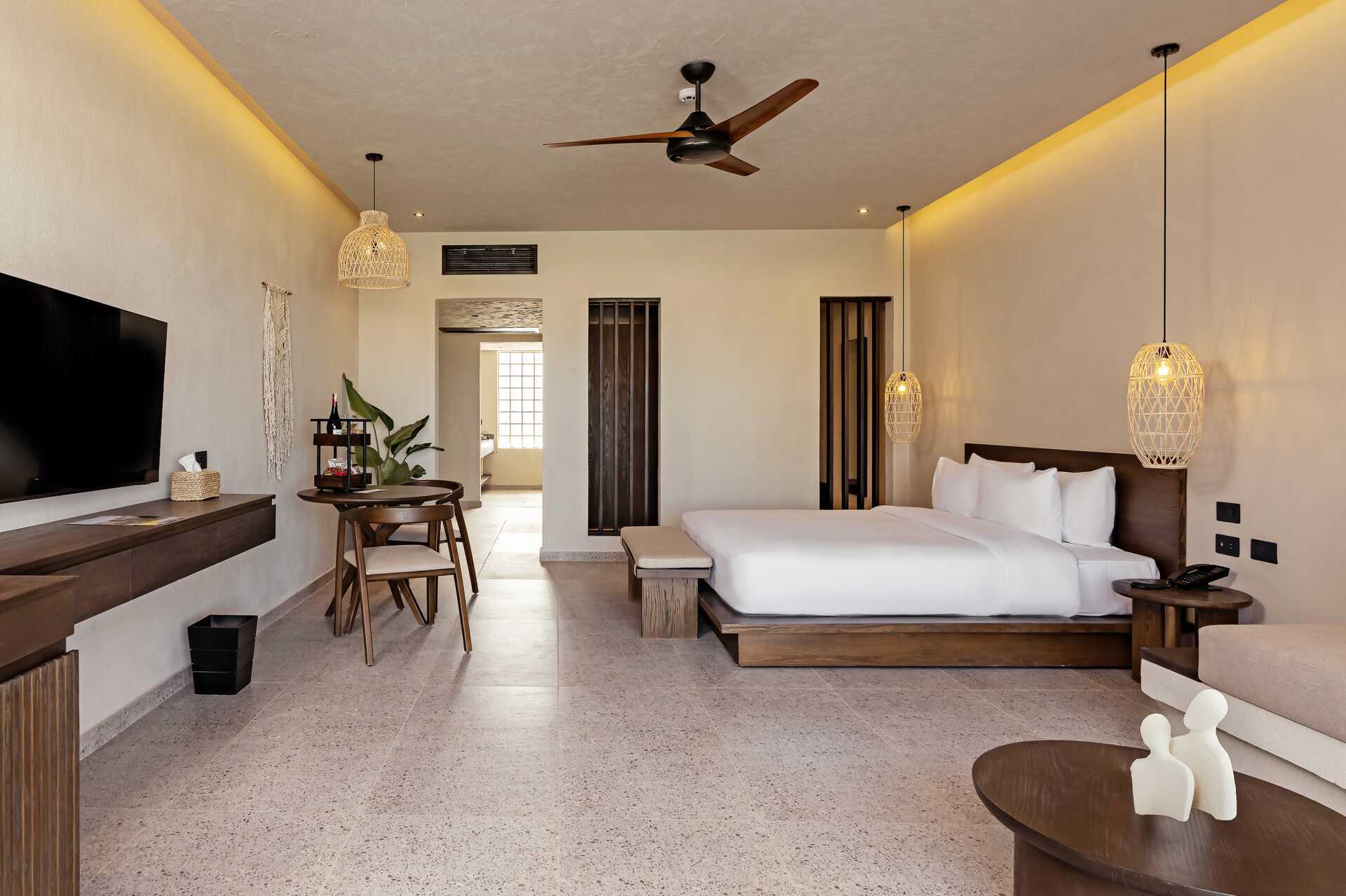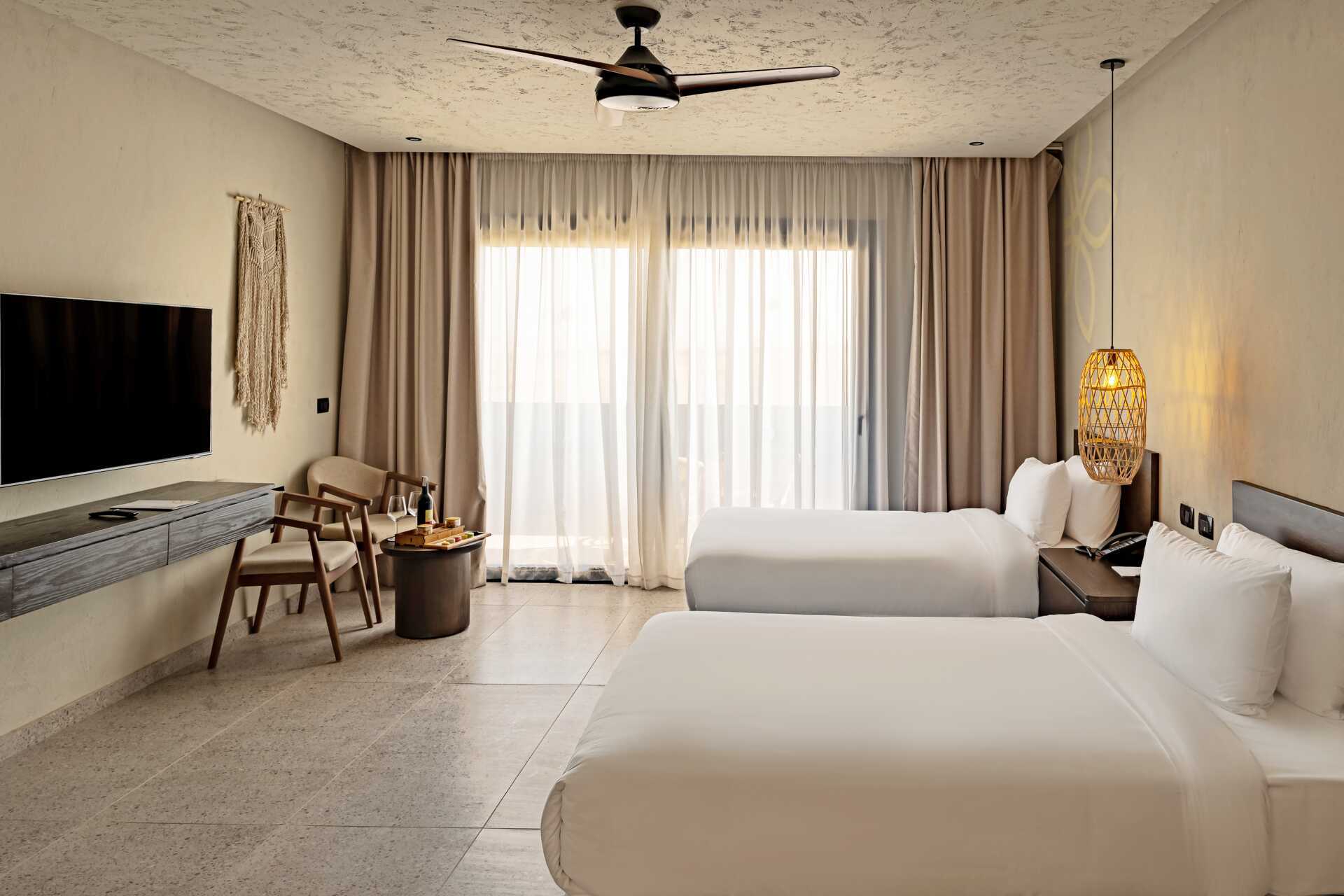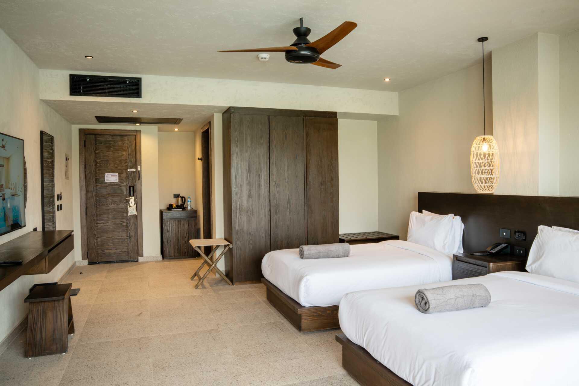Suite met terras op de begane grond en zeezicht. Een tweepersoonsbed of twee eenpersoonsbedden. Mogelijkheid tot extra bedden in de vorm van een slaapbank. Wifi, airconditioning en kluisje inbegrepen. Minibar tegen betaling. Waterkoker, koffie en thee. Tv met internationale zenders. Föhn. Badkamer met douche en toilet. Schoonmaak 7 keer per week.