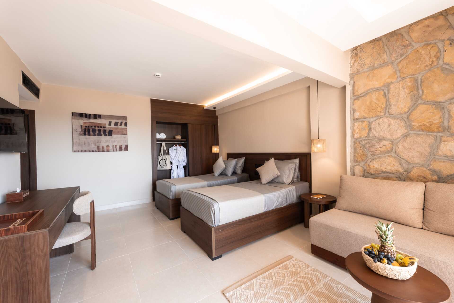 Junior suite met balkon of terras en zeezicht. De kamers bevinden zich in het hoofdgebouw van het hotel. Een tweepersoonsbed of twee eenpersoonsbedden. Wifi, airconditioning en kluisje inbegrepen. Minibar tegen betaling. Waterkoker en koffie en thee. Tv met internationale zenders. Sommige kamers zijn voorzien van vloerbedekking. Föhn. Badkamer met jacuzzi, douche en toilet. Schoonmaak 7 keer/week.