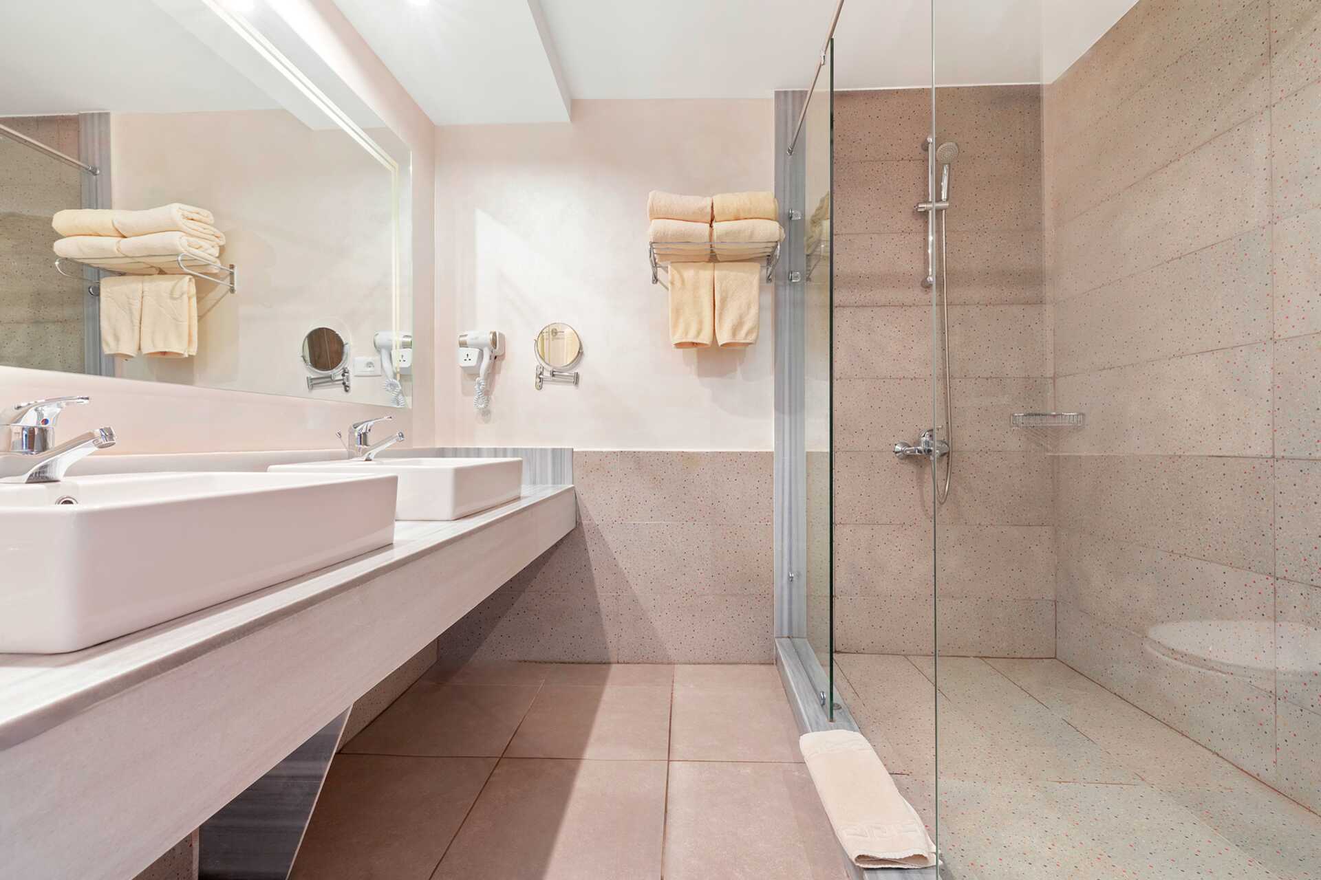 Familiekamer met balkon of terras en uitzicht op het zwembad. De familiekamers bestaan uit twee aparte slaapkamers. Twee eenpersoonsbedden in de ene slaapkamer en een stapelbed in de andere slaapkamer. Wifi, airconditioning en kluisje inbegrepen. Koelkast met een non-alcoholisch drankje bij aankomst. Waterkoker en koffie en thee. Tv met internationale zenders. Föhn. Badkamer met douche en toilet. Schoonmaak 7 keer/week.