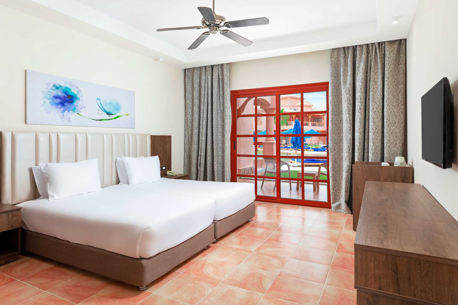 Familiekamer met balkon of terras en uitzicht op het zwembad. Een tweepersoonsbed of twee eenpersoonsbedden. Mogelijkheid voor een extra bed in een eenpersoonsbed. Wifi, airconditioning en kluisje inbegrepen. Koelkast met een non-alcoholisch drankje bij aankomst. Waterkoker en koffie en thee. Tv met internationale zenders. Föhn. Badkamer met douche en toilet. Schoonmaak 7 keer/week.