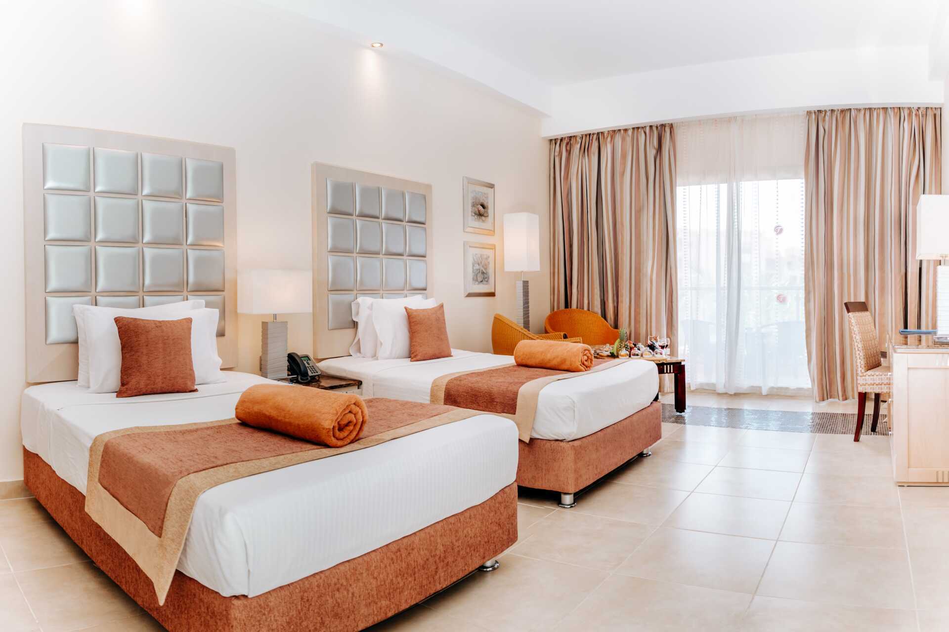 Deluxe kamer met balkon, sommige met beperkt zeezicht en sommige met zeezicht. Een tweepersoonsbed of twee eenpersoonsbedden. Mogelijkheid voor extra bedden in de vorm van opklapbedden. Wifi, airconditioning en kluisje inbegrepen. Elektrische waterkoker, koffie en thee. Eén grote fles water per persoon per dag inbegrepen. TV met internationale zenders. Haardroger. Badkamer met bad, aparte douche en toilet. Schoonmaak 7 keer/week. Kinderen onder de twee jaar worden meegerekend in het maximum aantal personen op de kamer.