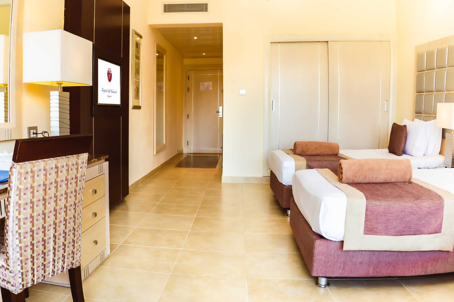 Familiekamer met balkon. De kamer bestaat uit twee tweepersoonskamers met een verbindingsdeur. Een tweepersoonsbed. Mogelijkheid voor extra bedden in twee eenpersoonsbedden en een slaapbank. Wifi, airconditioning en kluisje inbegrepen. Elektrische waterkoker en koffie en thee. Een grote fles water per persoon/dag inbegrepen. Een tV met internationale zenders in elke kamer. Föhn. Twee badkamers, één met bad en douche en één met alleen douche en toilet. Schoonmaak 7 keer/week. Kinderen onder de twee jaar zijn inbegrepen in het maximum aantal personen op de kamer.