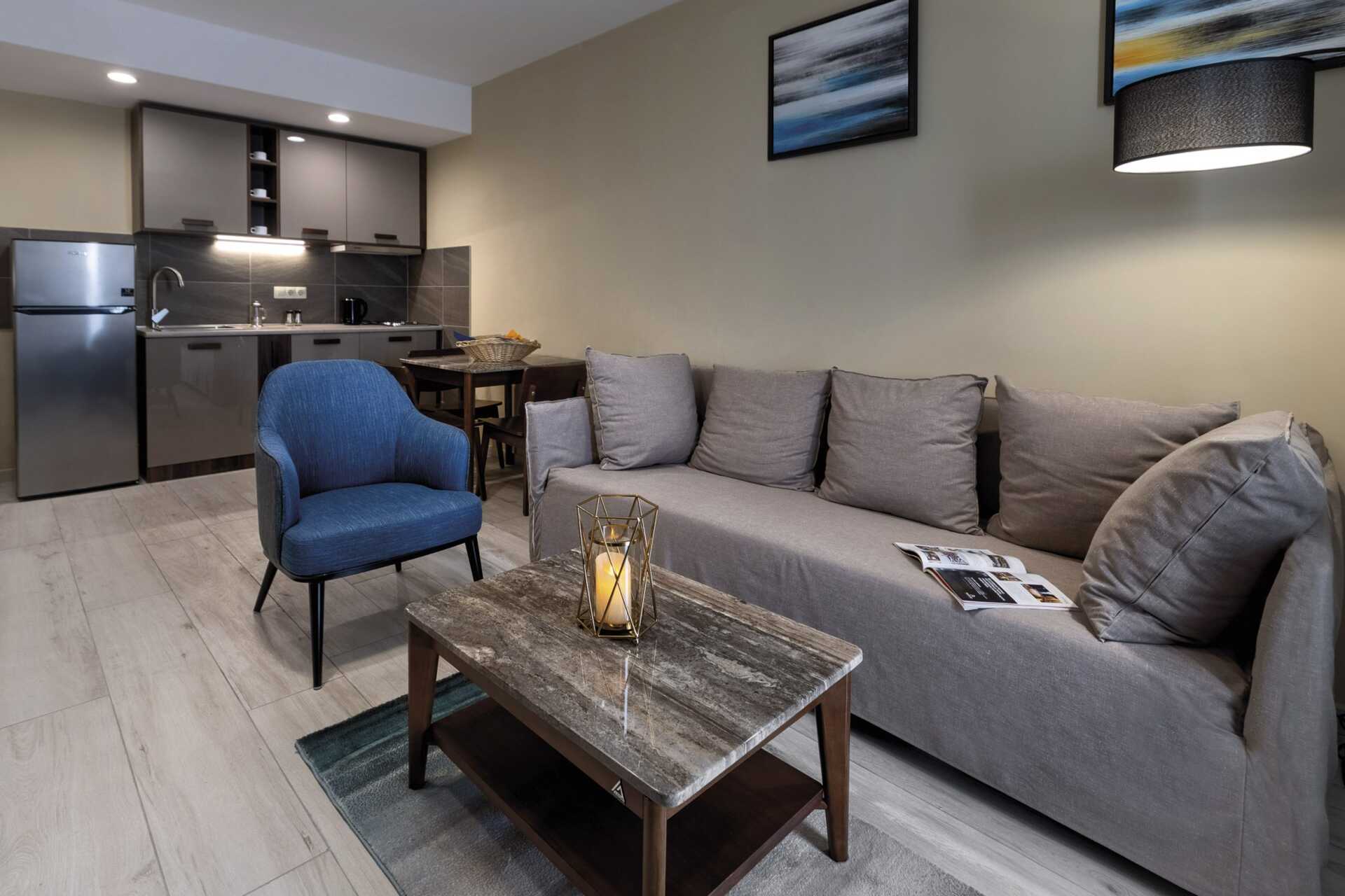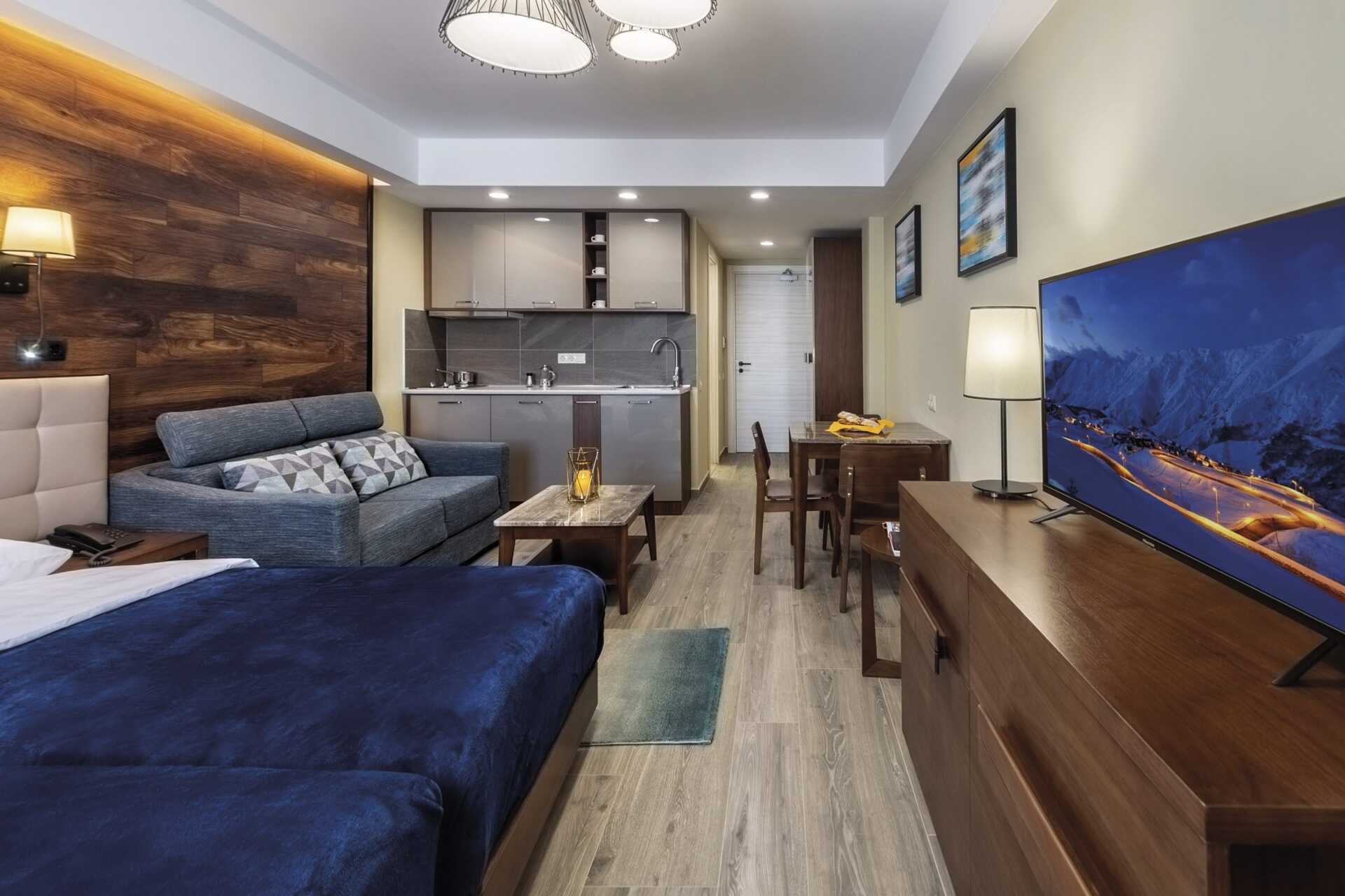 Tweekamerappartement met balkon. Slaapkamer en woonkamer gecombineerd met kitchenette. Twee eenpersoonsbedden. Mogelijkheid voor extra bedden in slaapbank. Minikeuken met koelkast, kookplaat, waterkoker en eenvoudige keukenapparatuur. Wifi, airconditioning en kluisje inbegrepen. Tv met internationale zenders. Föhn. Badkamer met douche en toilet. Schoonmaak 6 keer/week.