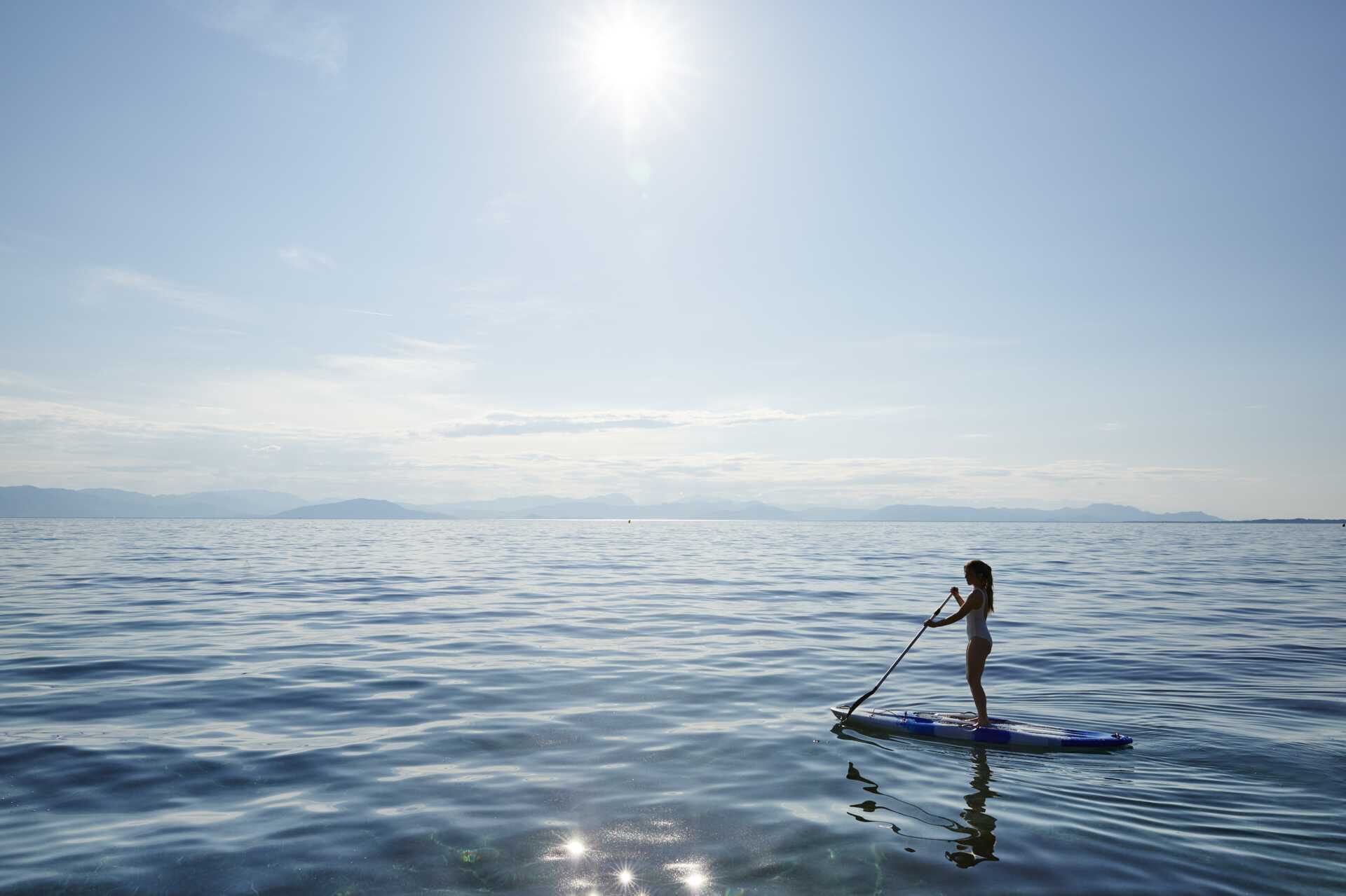 Het strand dat tegenover de hotels ligt is ondiep en kindvriendelijk met kristalhelder water. Gemengd zand en steen.