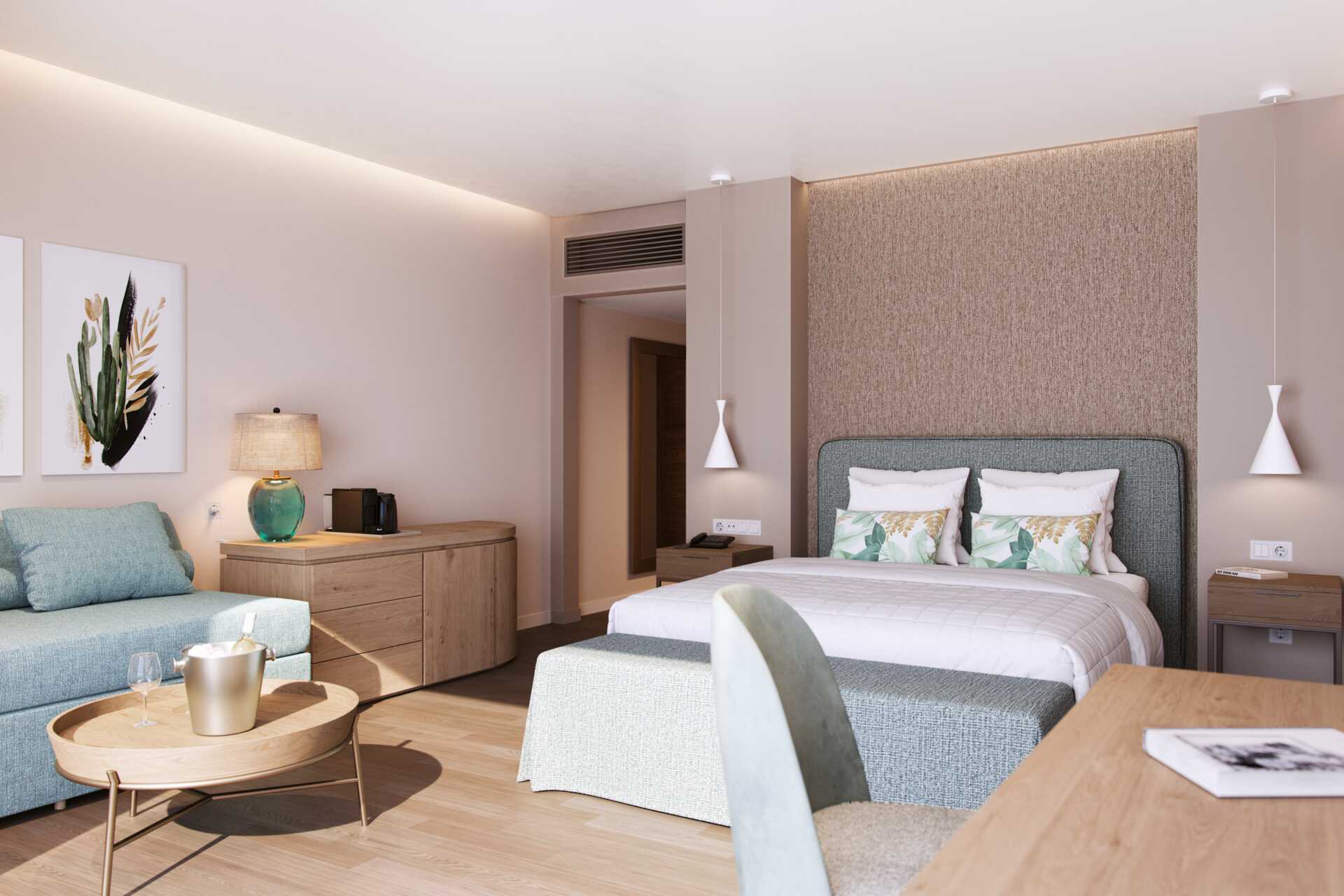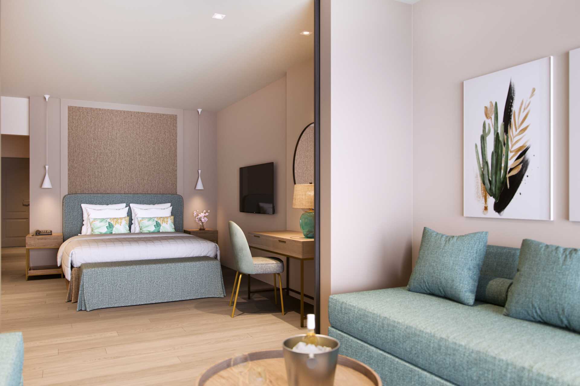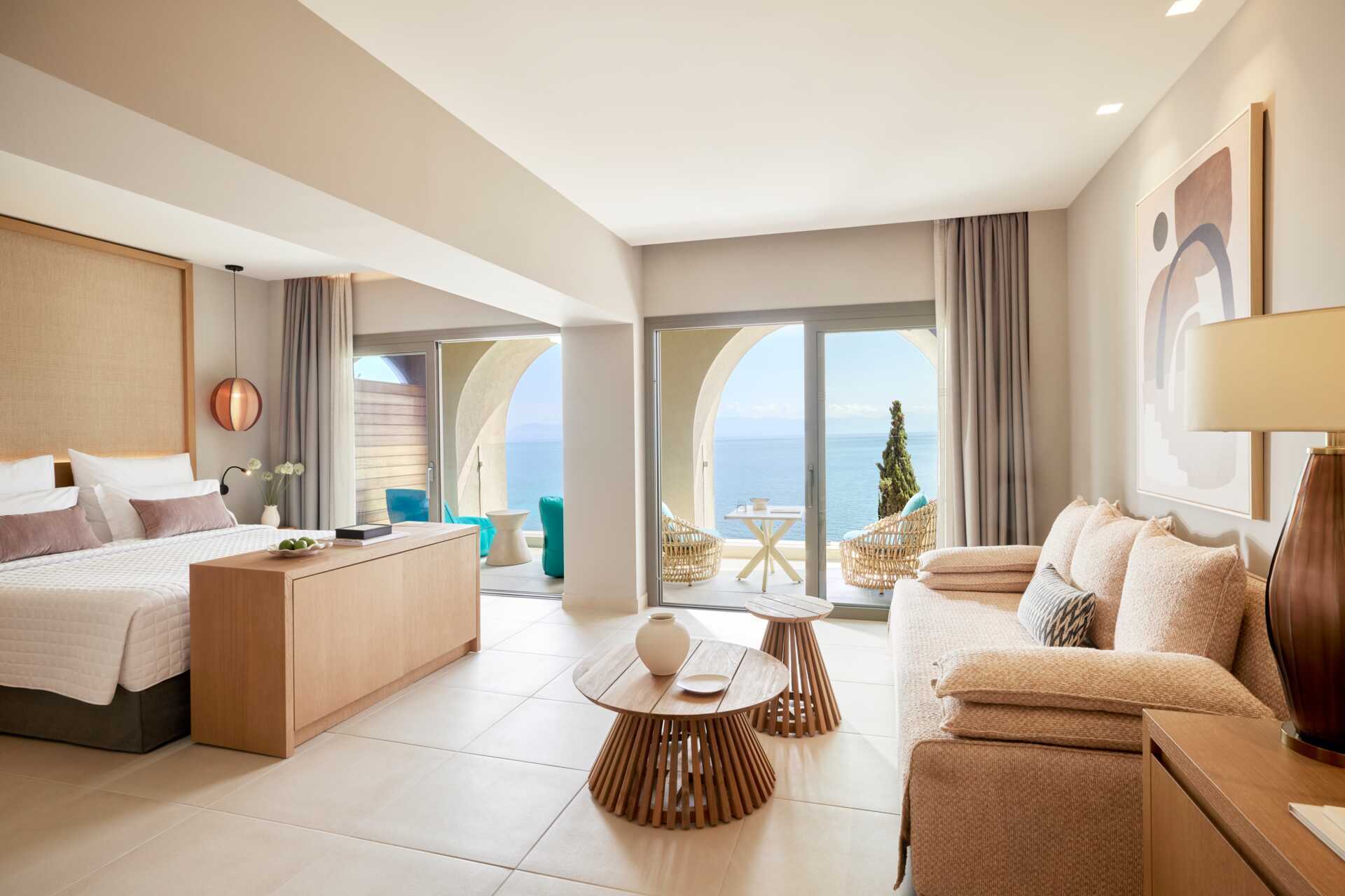 Junior suite deluxe met balkon en zeezicht. De junior suite bevindt zich in het bungalowgedeelte van het hotel. Een tweepersoonsbed. Mogelijkheid tot extra bedden in de vorm van een slaapbank. Wifi, airconditioning en kluisje inbegrepen. Minibar. Waterkoker, Nespresso-apparaat en koffie en thee. Tv met internationale zenders. Strijkijzer en strijkplank. Föhn. Badkamer met bad of douche en toilet. Schoonmaak 7 keer/week. Kinderen jonger dan twee jaar zijn inbegrepen in het maximale aantal personen in de kamer. Als je een junior suite boekt, is het Signature Life-concept van het hotel inbegrepen.