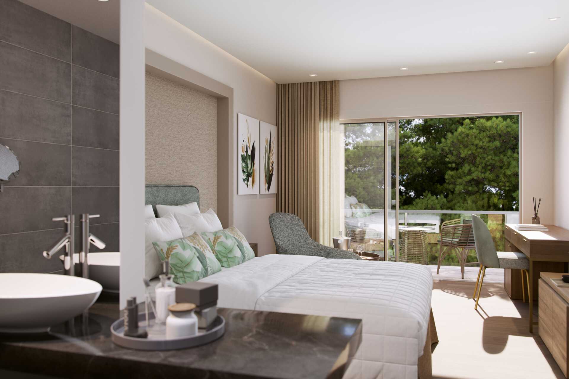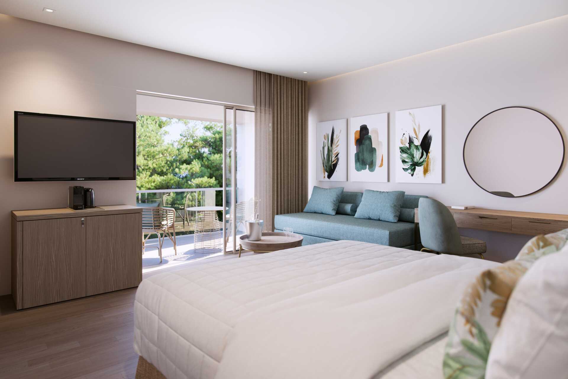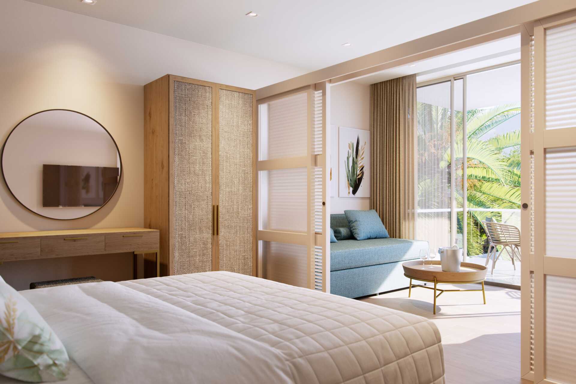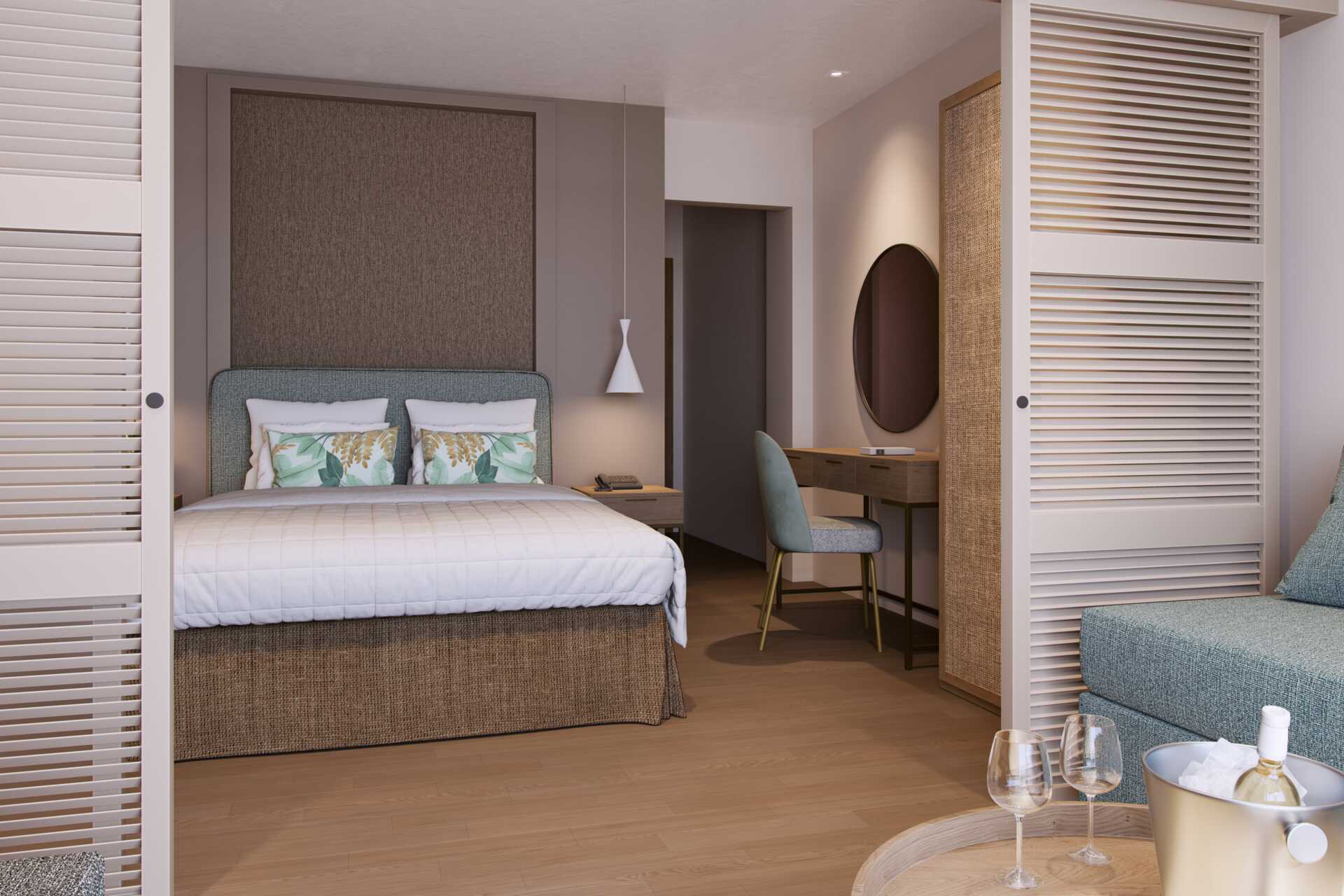 Junior suite deluxe met balkon en zeezicht. De junior suite bevindt zich in het bungalowgedeelte van het hotel. Een tweepersoonsbed. Mogelijkheid tot extra bedden in de vorm van een slaapbank. Wifi, airconditioning en kluisje inbegrepen. Minibar. Waterkoker, Nespresso-apparaat en koffie en thee. Tv met internationale zenders. Strijkijzer en strijkplank. Föhn. Badkamer met bad of douche en toilet. Schoonmaak 7 keer/week. Kinderen jonger dan twee jaar zijn inbegrepen in het maximale aantal personen in de kamer. Als je een junior suite boekt, is het Signature Life-concept van het hotel inbegrepen.