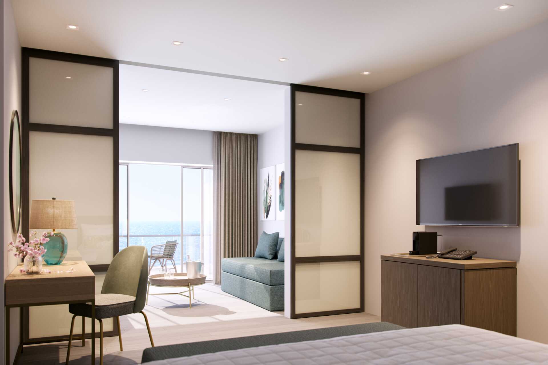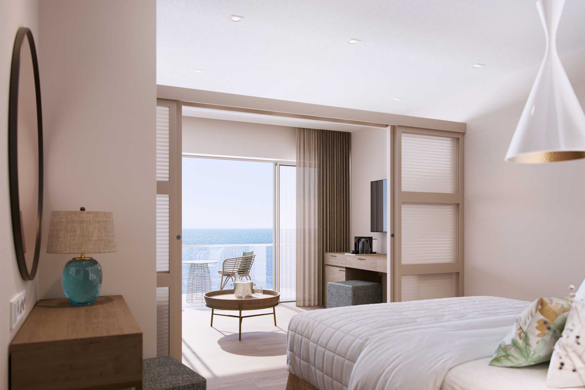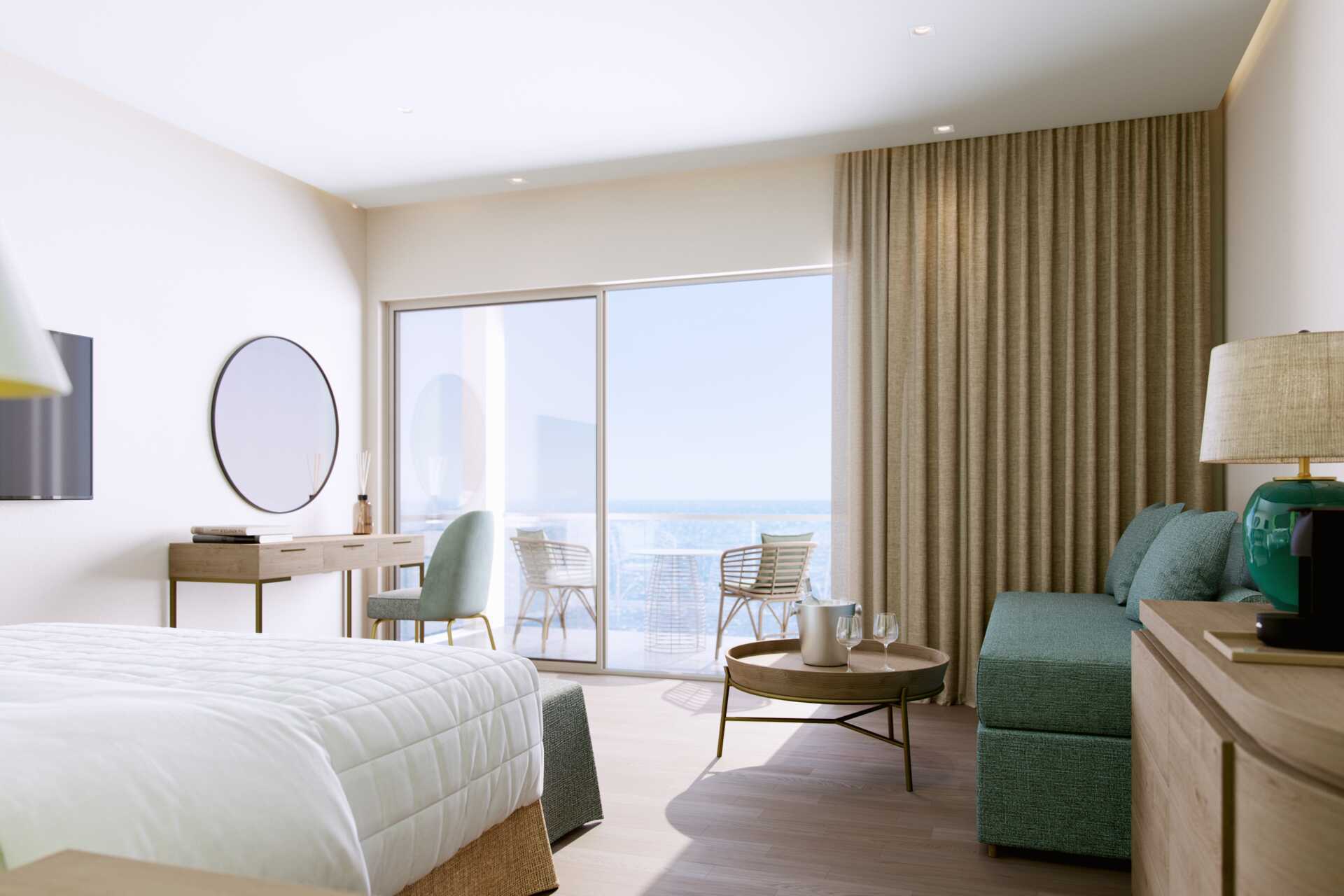 Junior suite met balkon en zeezicht Op het balkon zijn ligstoelen, een tafel en stoelen aanwezig. Een tweepersoonsbed. Mogelijkheid tot een extra bed in de vorm van een slaapbank. Wifi, airconditioning en kluisje inbegrepen. Minibar. Waterkoker, Nespresso-apparaat en koffie en thee. Tv met internationale zenders. Strijkijzer en strijkplank. Föhn. Badkamer met bad of douche en toilet. Schoonmaak 7 keer/week. Kinderen jonger dan twee jaar zijn inbegrepen in het maximale aantal personen in de kamer.
