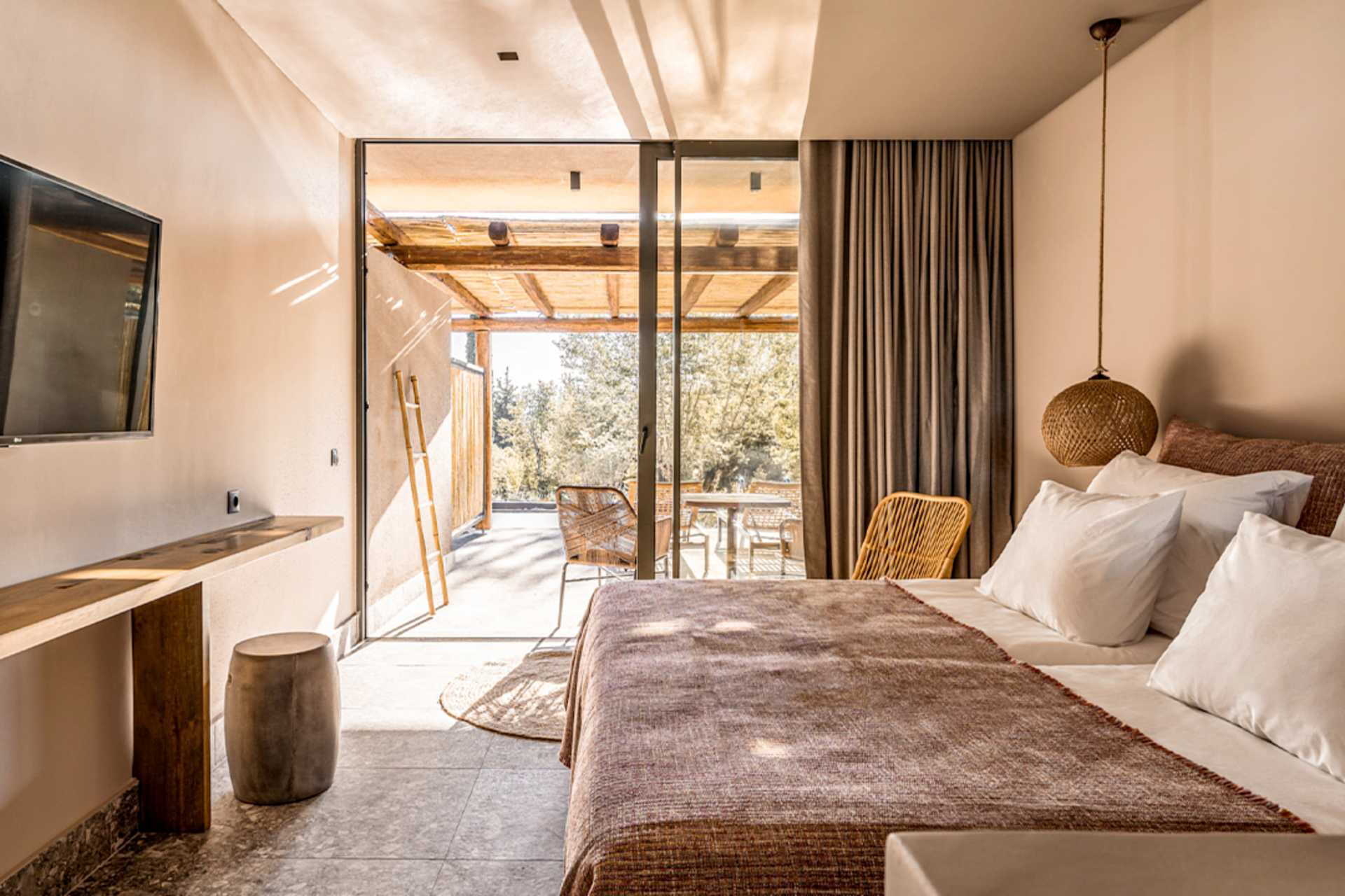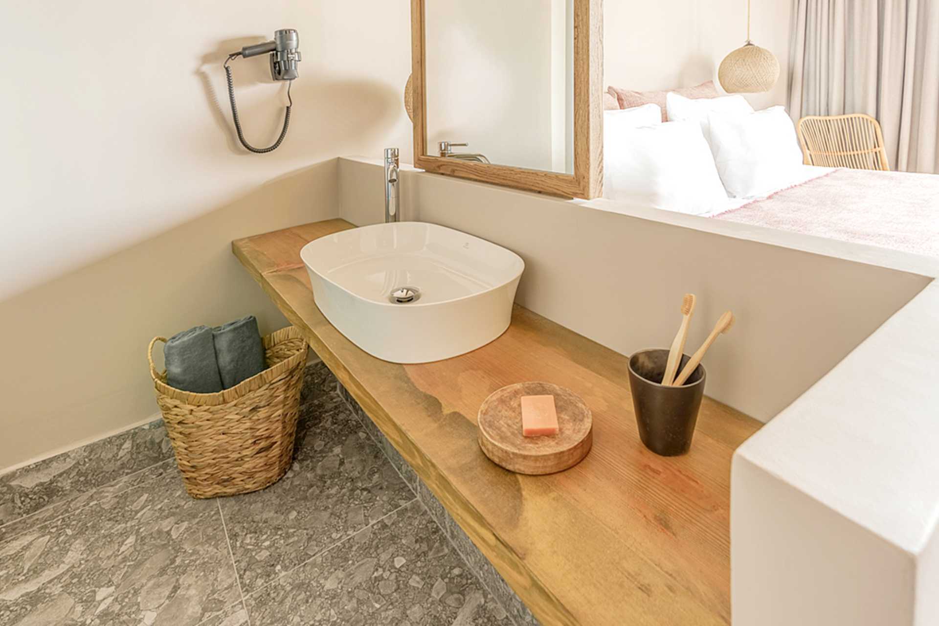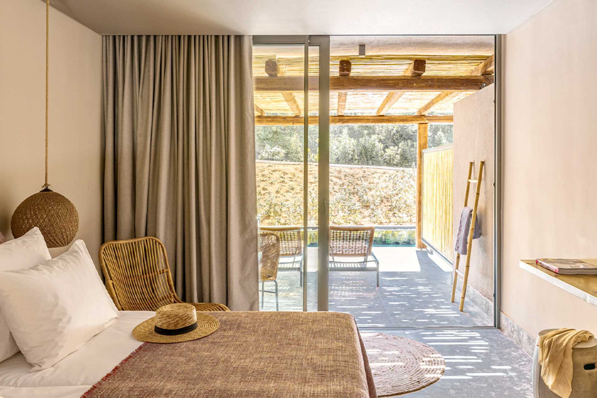 Superior kamer met terras op de begane grond en toegang tot een gedeeld zwembad. Op het terras staan stoelen, tafels en ligbedden. Een tweepersoonsbed of twee eenpersoonsbedden. Koelkast: bij aankomst staat er een fles water in de koelkast. Deze wordt elke dag bijgevuld. Waterkoker en koffie en thee. Wifi, airconditioning en kluis inbegrepen. Tv met internationale zenders. Badjassen en hotelslippers. Föhn. Open badkamer, douche met matglas en toilet. Schoonmaak 7 keer/week.