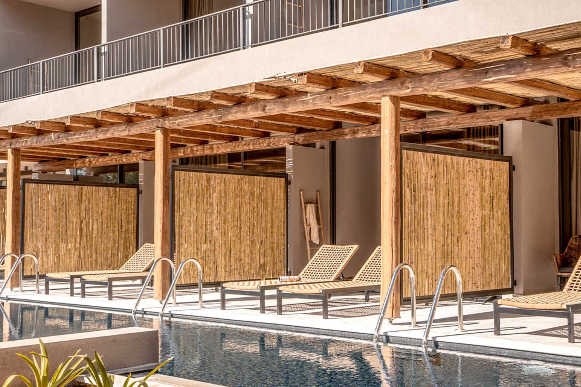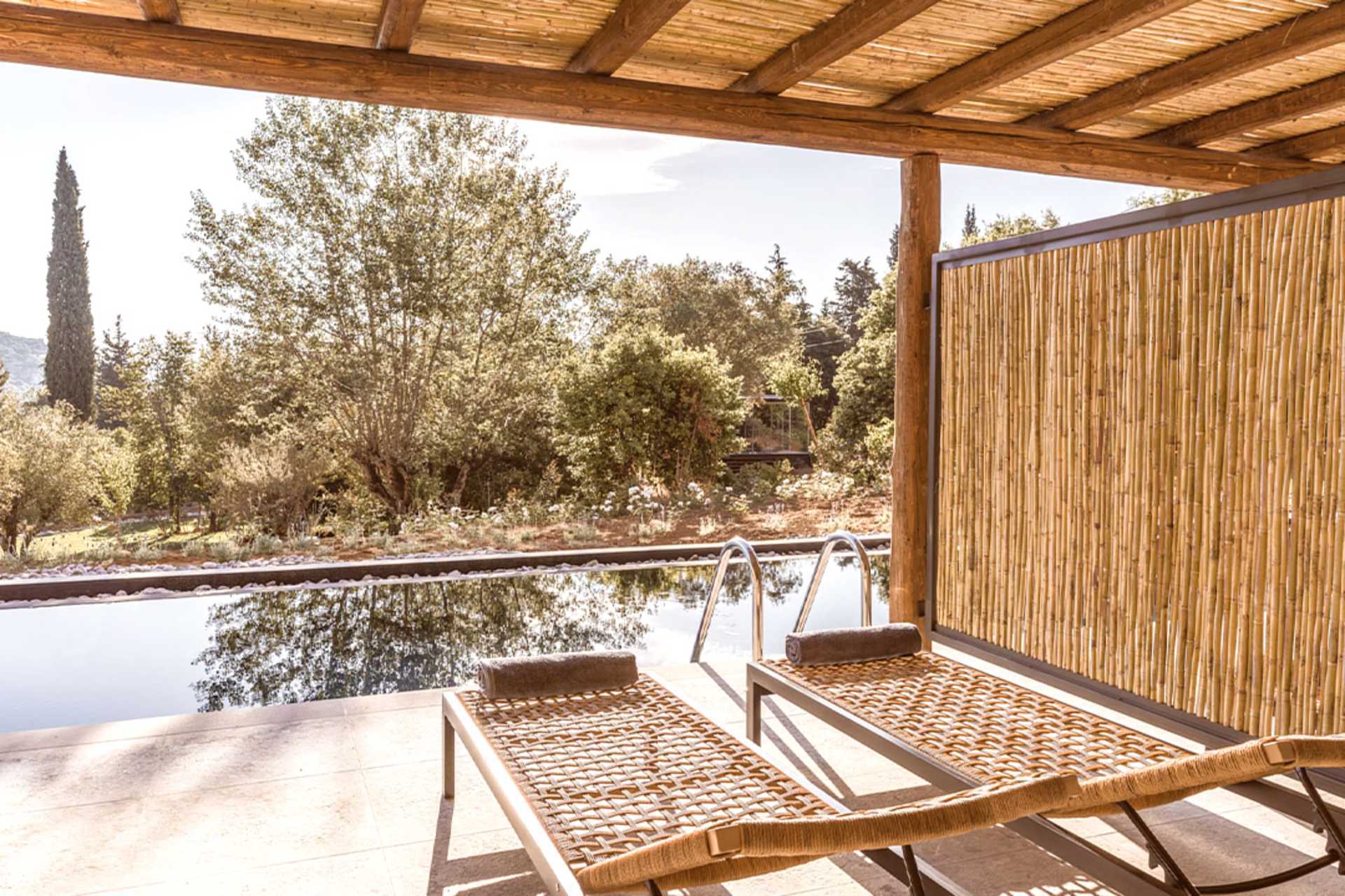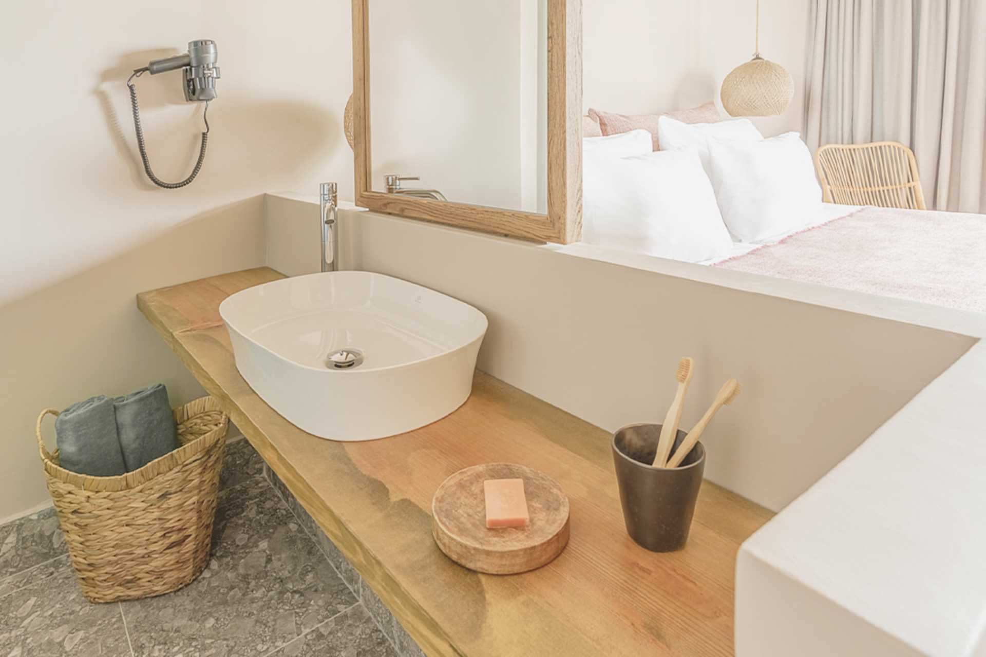 Superior kamer met terras op de begane grond en toegang tot een gedeeld zwembad. Op het terras staan stoelen, tafels en ligbedden. Een tweepersoonsbed of twee eenpersoonsbedden. Koelkast: bij aankomst staat er een fles water in de koelkast. Deze wordt elke dag bijgevuld. Waterkoker en koffie en thee. Wifi, airconditioning en kluis inbegrepen. Tv met internationale zenders. Badjassen en hotelslippers. Föhn. Open badkamer, douche met matglas en toilet. Schoonmaak 7 keer/week.