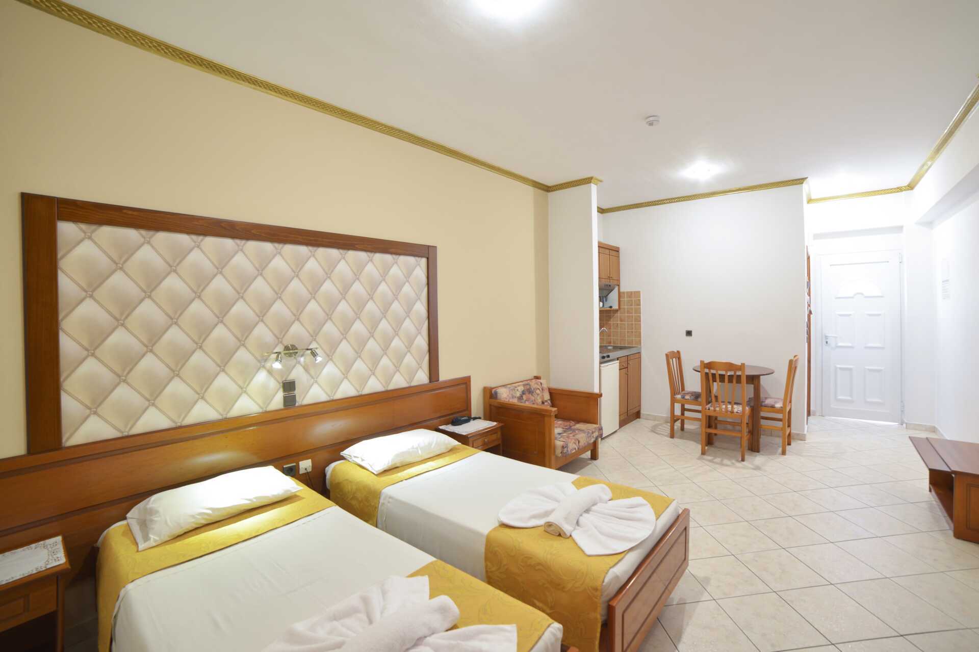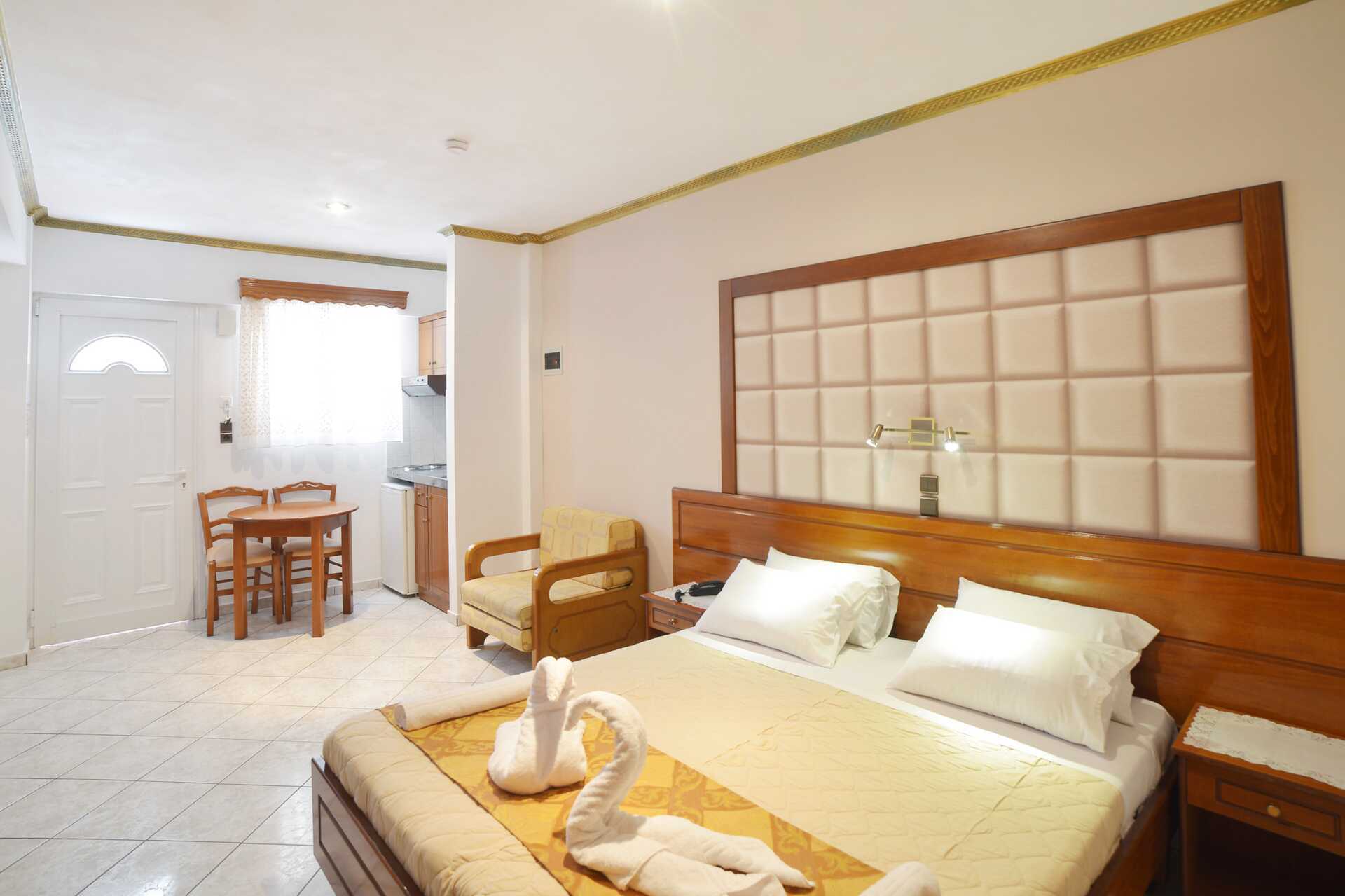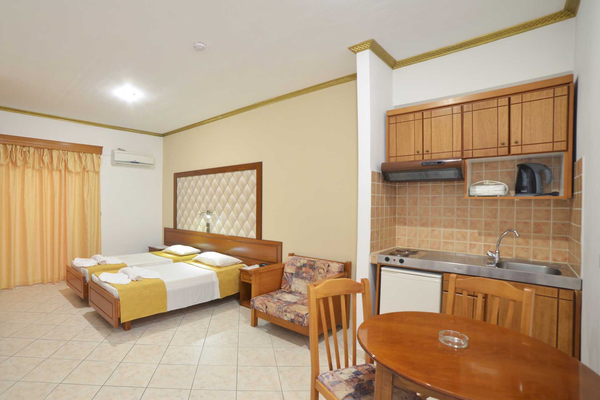 Eenkamerappartement met balkon. Slaapkamer gecombineerd met minikeuken. Een tweepersoonsbed of twee eenpersoonsbedden. Mogelijkheid voor een extra bed in een fauteuil. Minikeuken met kookplaat, koelkast, waterkoker en basiskeukengerei. Wifi, airconditioning en kluis inbegrepen. Tv met internationale zenders. Badkamer met douche en toilet. Schoonmaak 6 keer / week.