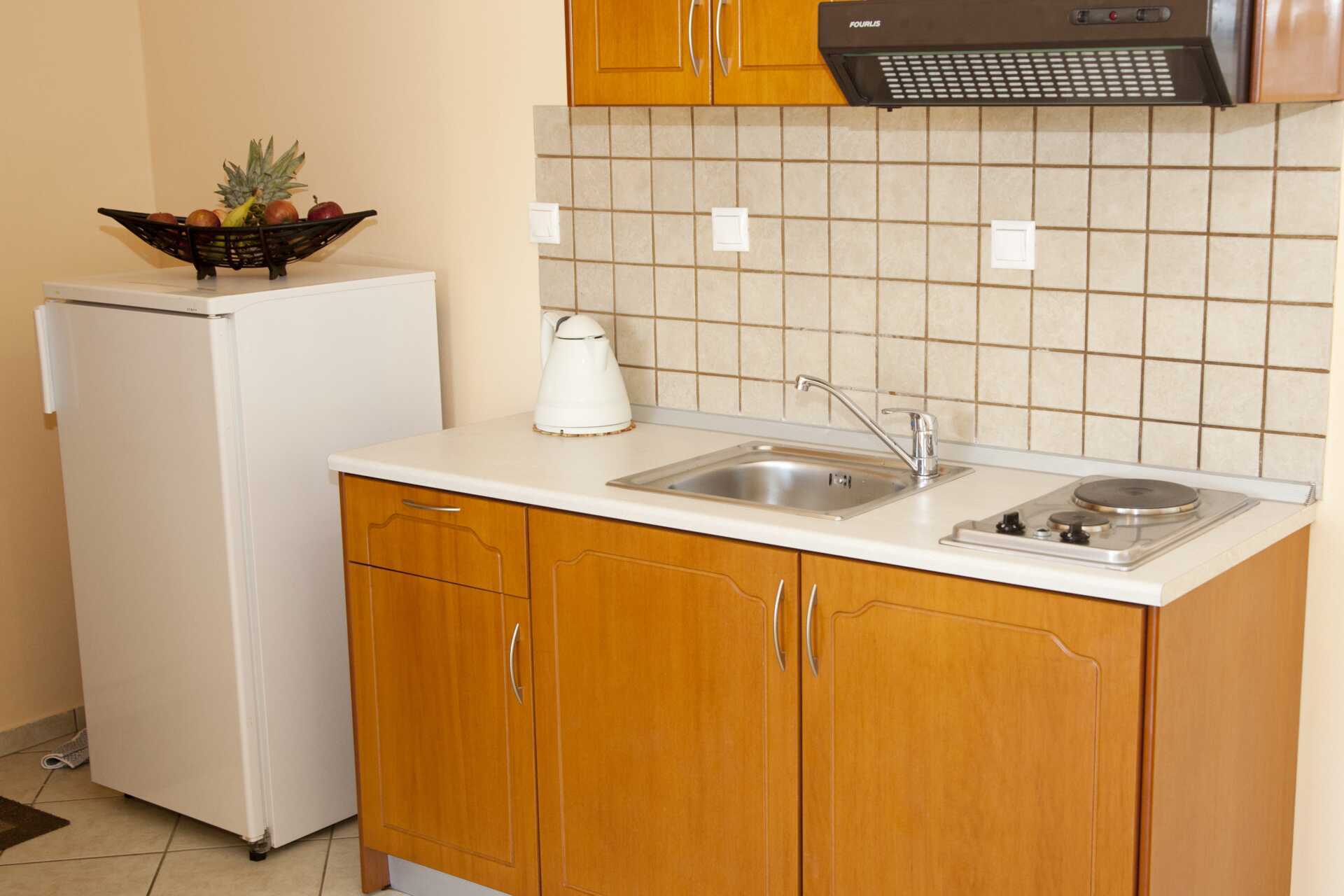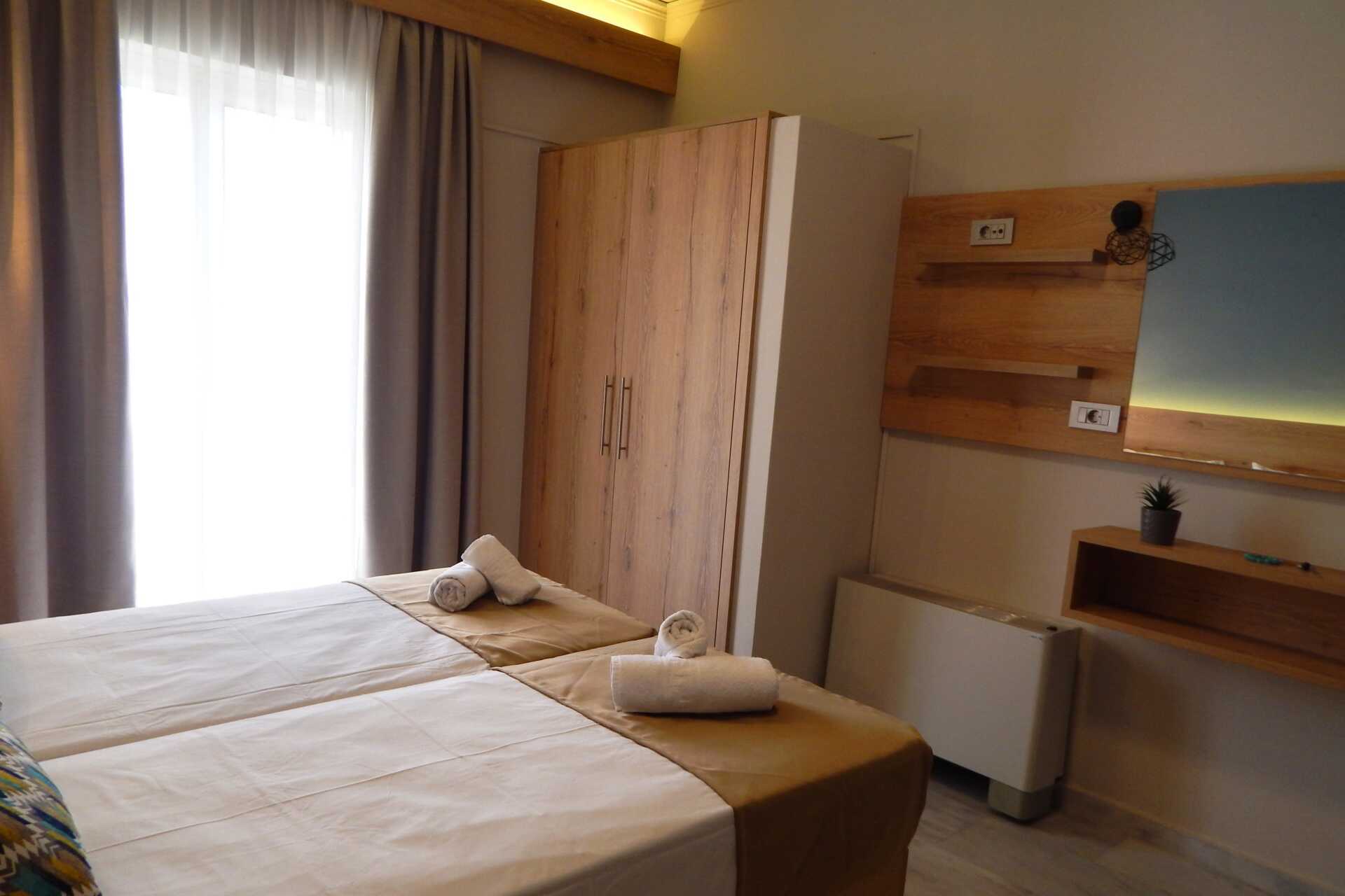 Tweekamerappartement met balkon of grondbalkon. Slaapkamer en gecombineerde woonkamer met kitchenette. Een tweepersoonsbed of twee eenpersoonsbedden. Mogelijkheid voor extra bedden in slaapbank. Minikeuken met kookplaten, koelkast met vriesvak, waterkoker, koffiepers en eenvoudige keukenapparatuur. Wifi en airconditioning inbegrepen. Kluisje tegen betaling. Föhn. Badkamer met douche en toilet. Schoonmaak 6 keer/week.