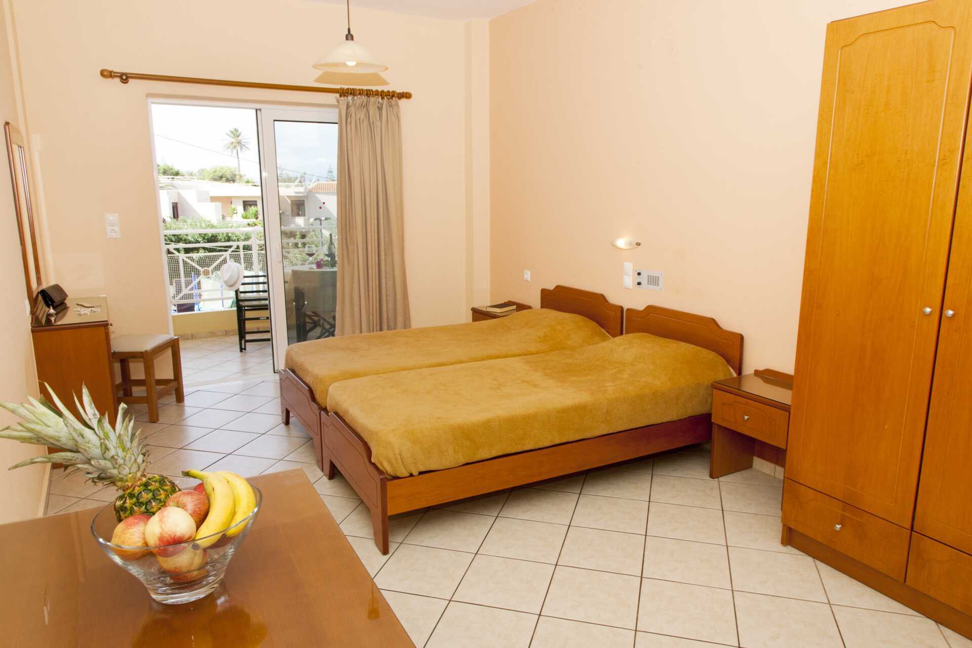 Driekamerappartementen met balkon of grondterras. Slaapkamer gecombineerd met kitchenette. Een tweepersoonsbed of twee eenpersoonsbedden. Minikeuken met kookplaten, koelkast met vriesvak, koffiepers, waterkoker en eenvoudige keukenapparatuur. Wifi en airconditioning inbegrepen. Kluisje tegen betaling. Föhn. Badkamer met douche en toilet. Schoonmaak 6 keer/week.
