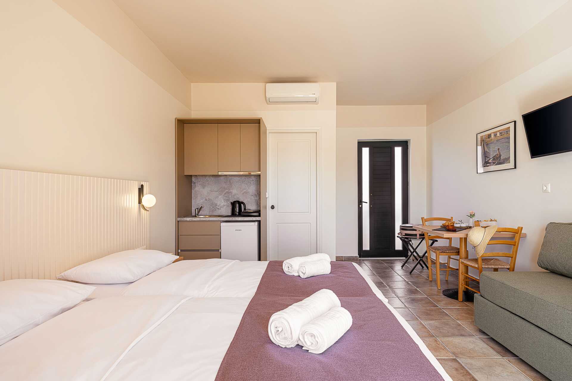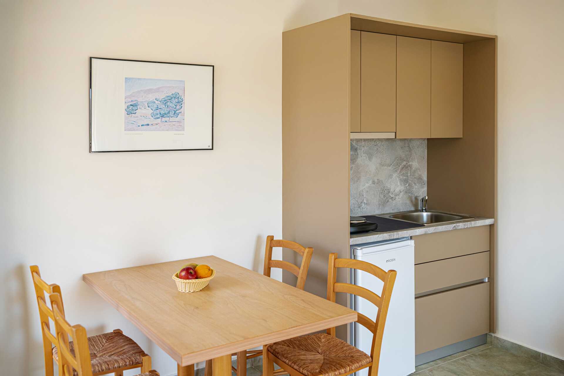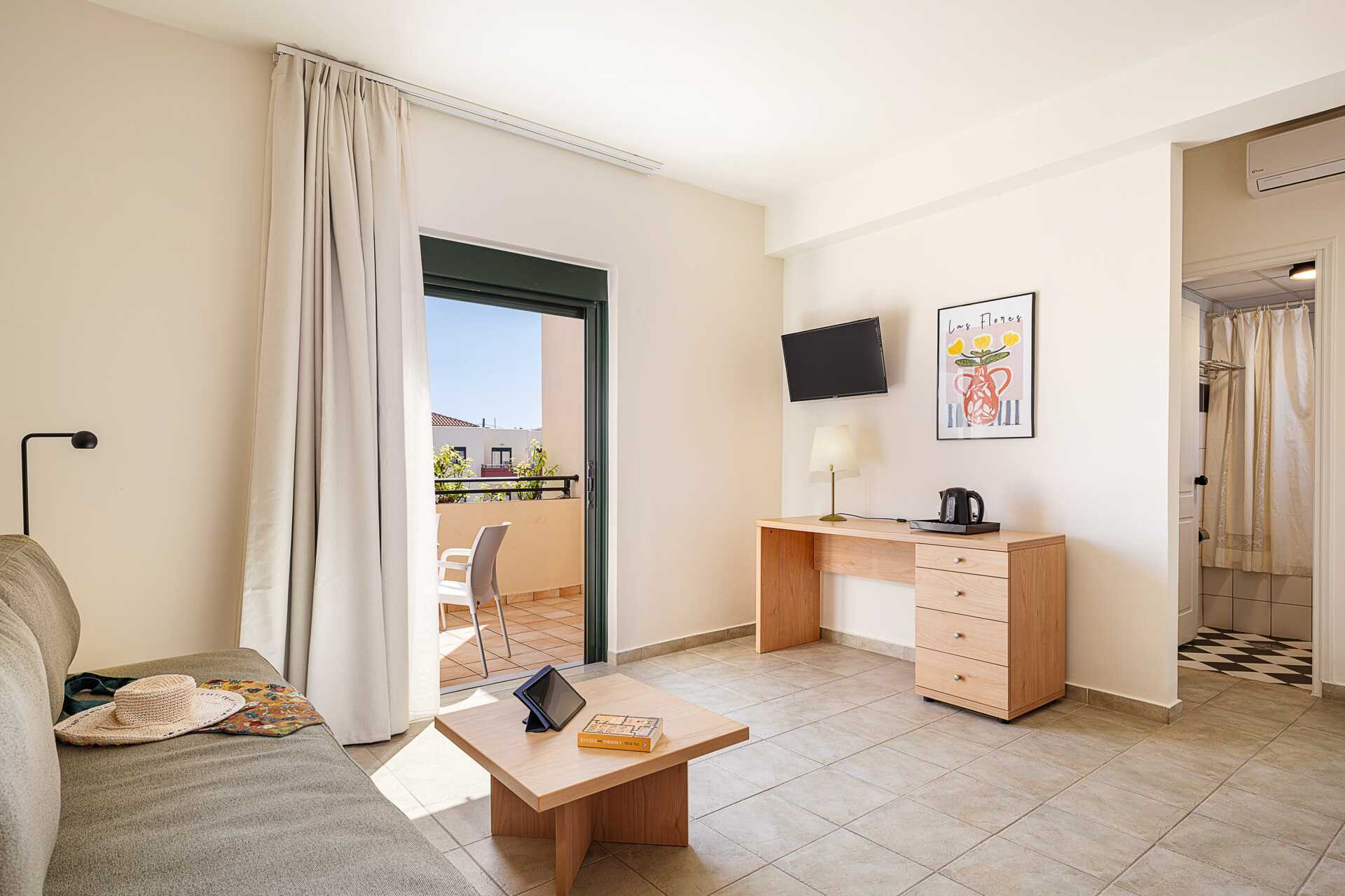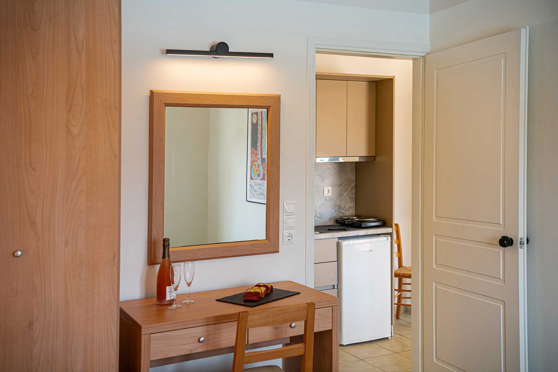 Studio met balkon, balkon op de begane grond of gedeeld terras. Gedeelde patio's kunnen zich op de begane grond bevinden met een gedeeld balkon of op een hogere verdieping met een gedeeld balkon. Sommige balkons en gedeelde patio's bieden uitzicht op het zwembad. Slaapkamer en gecombineerde woonkamer met kitchenette. Twee eenpersoonsbedden. Mogelijkheid voor een extra bed op de slaapbank. Minikeuken met koelkast, kookplaat, waterkoker en eenvoudige keukenapparatuur. Wifi - verbinding en snelheid variëren -, kluisje en airconditioning inbegrepen. Tv met internationale zenders. Föhn. Badkamer met douche en toilet. Schoonmaak 6 keer/week.