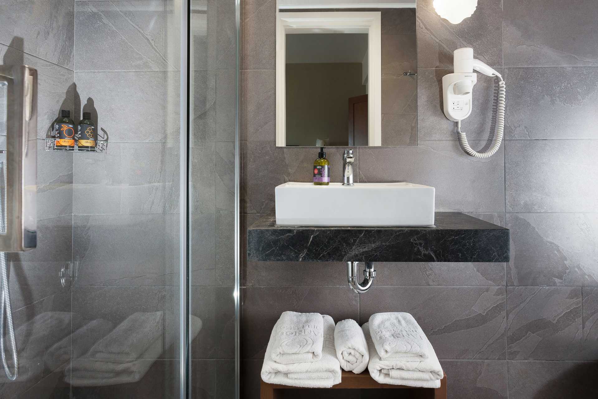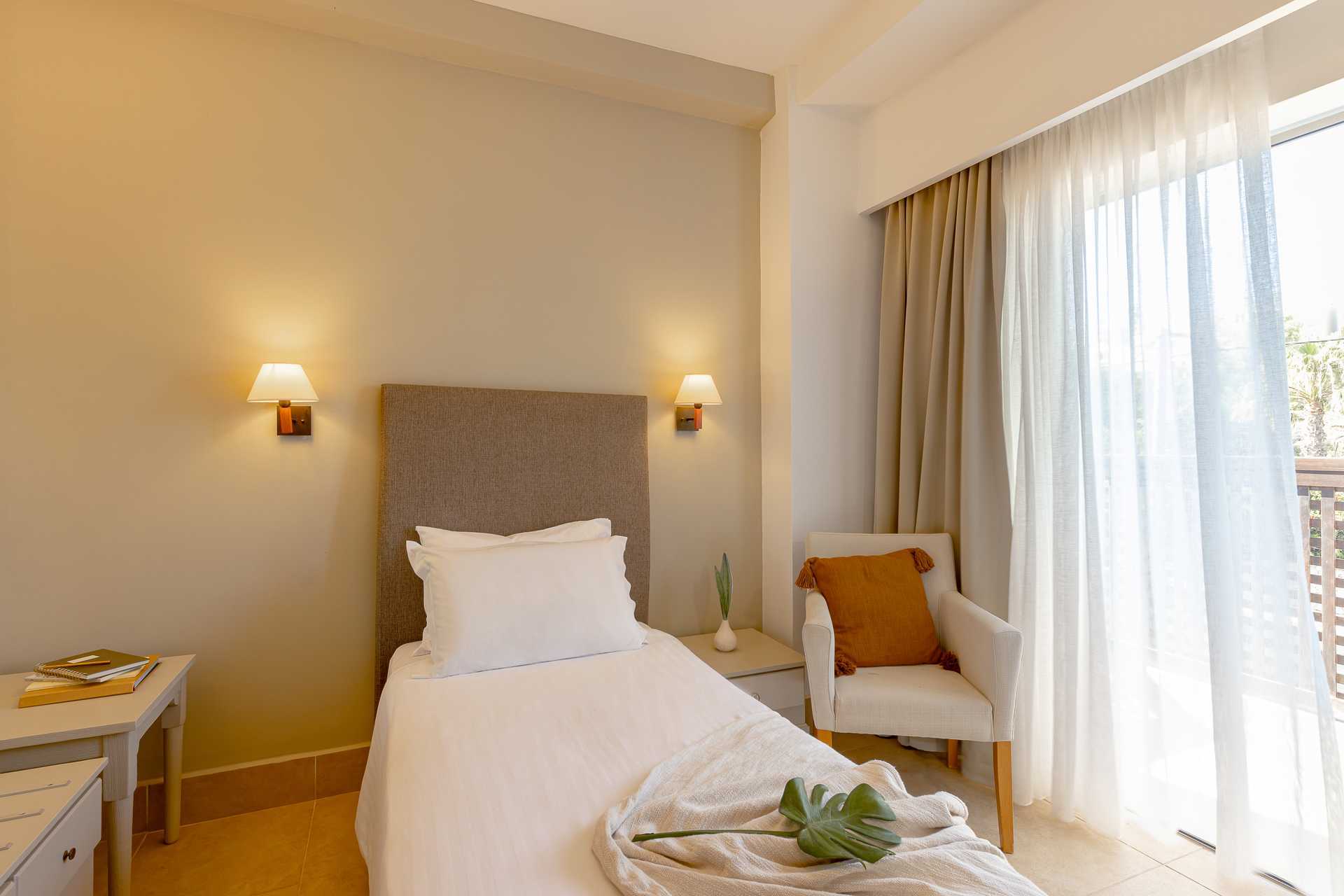 Eenpersoonskamer met balkon of terras, sommige met uitzicht op zee. Eén eenpersoonsbed. Airconditioning en wifi inbegrepen. Kluisje tegen betaling. Minibar tegen betaling. Tv met internationale zenders. Föhn. Kleine badkamers met douche en toilet. Schoonmaak 7 keer/week.