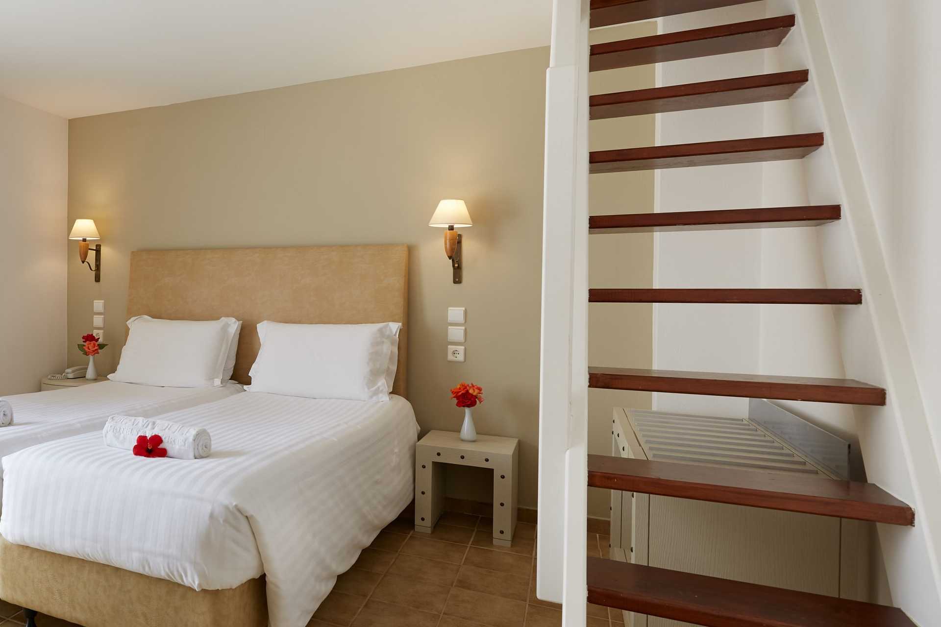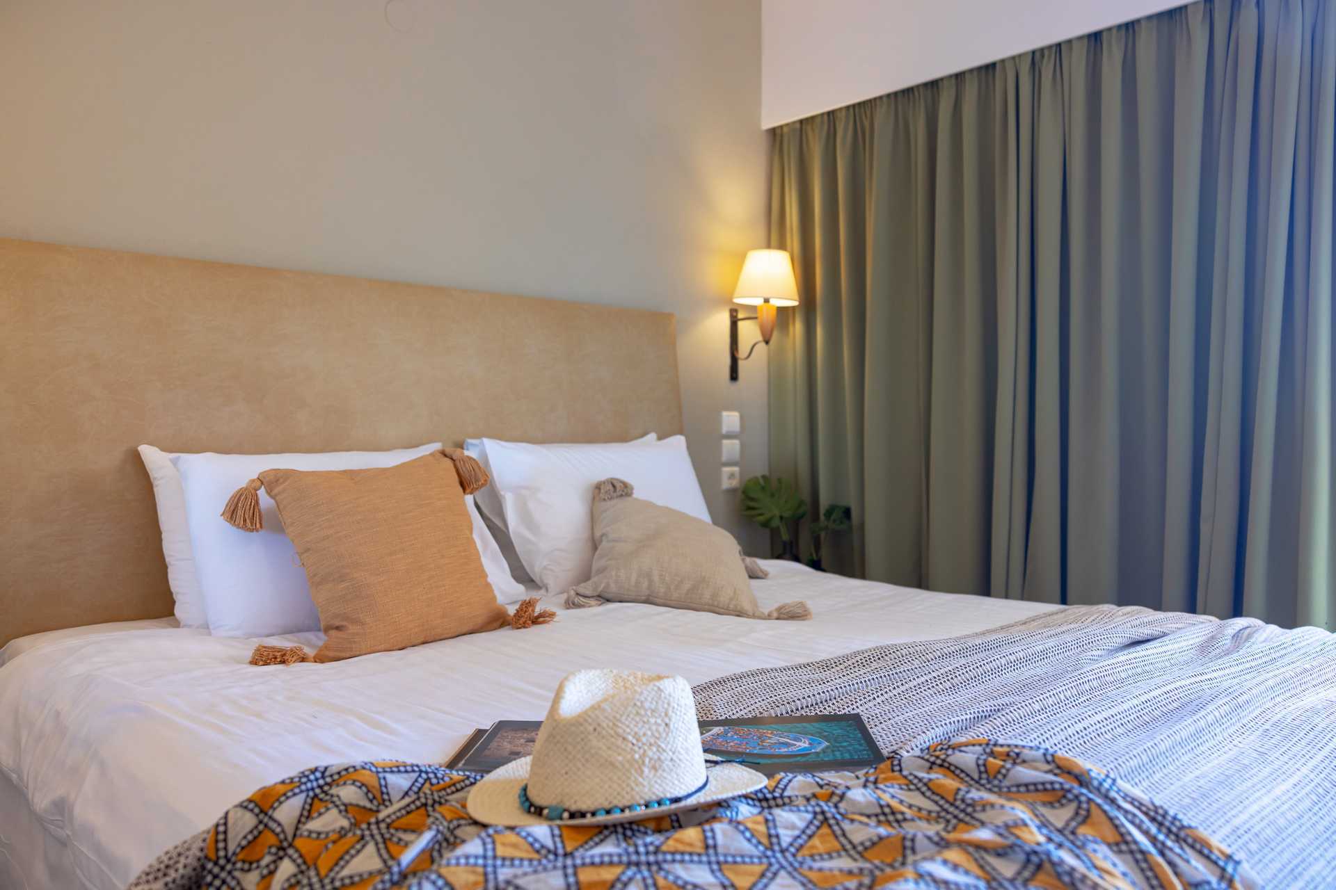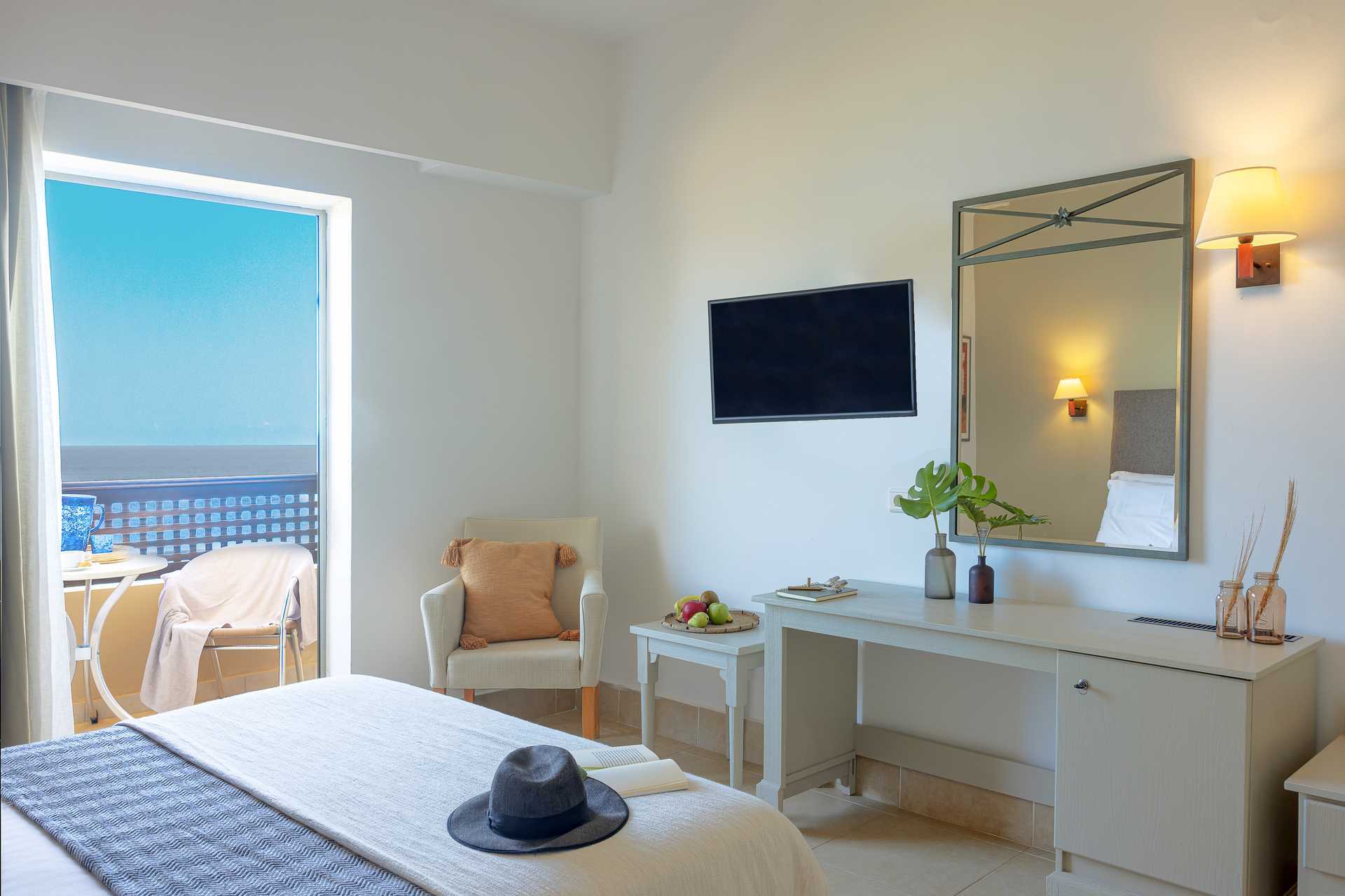 Tweepersoonskamer met balkon of terras, sommige kamers met uitzicht op het zwembad of de zee. De tweepersoonskamers met zeezicht bevinden zich aan de strandzijde, in het hoofdgebouw. De tweepersoonskamers met uitzicht op het zwembad bevinden zich in de zwembadgebouwen, aan de overkant van de weg. In alle gebouwen zijn tweepersoonskamers zonder specifiek uitzicht beschikbaar. Een tweepersoonsbed of twee eenpersoonsbedden. Mogelijkheid tot een extra bed in een eenpersoonsbed. Airconditioning en wifi inbegrepen. Kluisje tegen betaling. Minibar tegen betaling. Tv met internationale zenders. Föhn. Kleine badkamer met douche en toilet. Schoonmaak 7 keer/week.