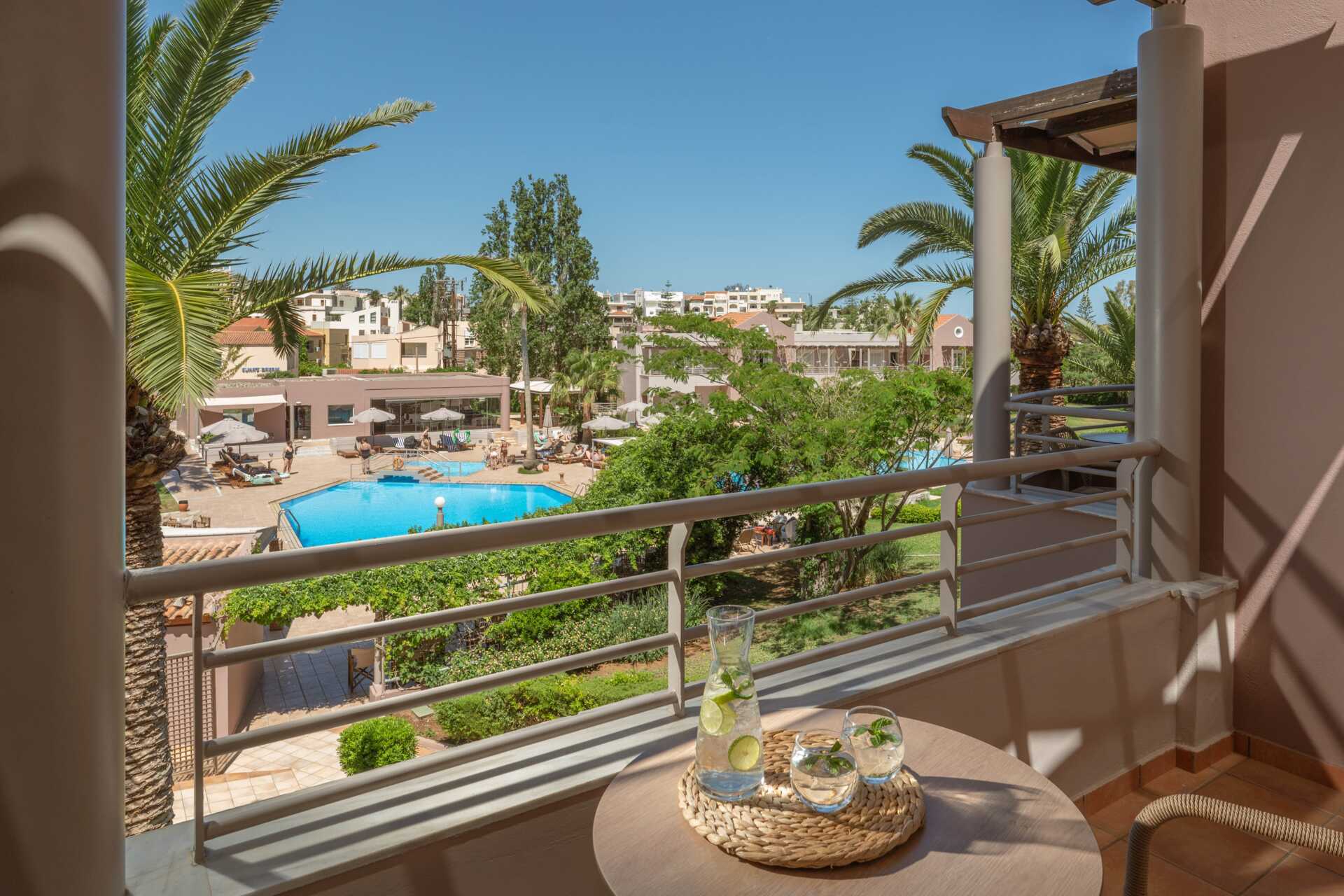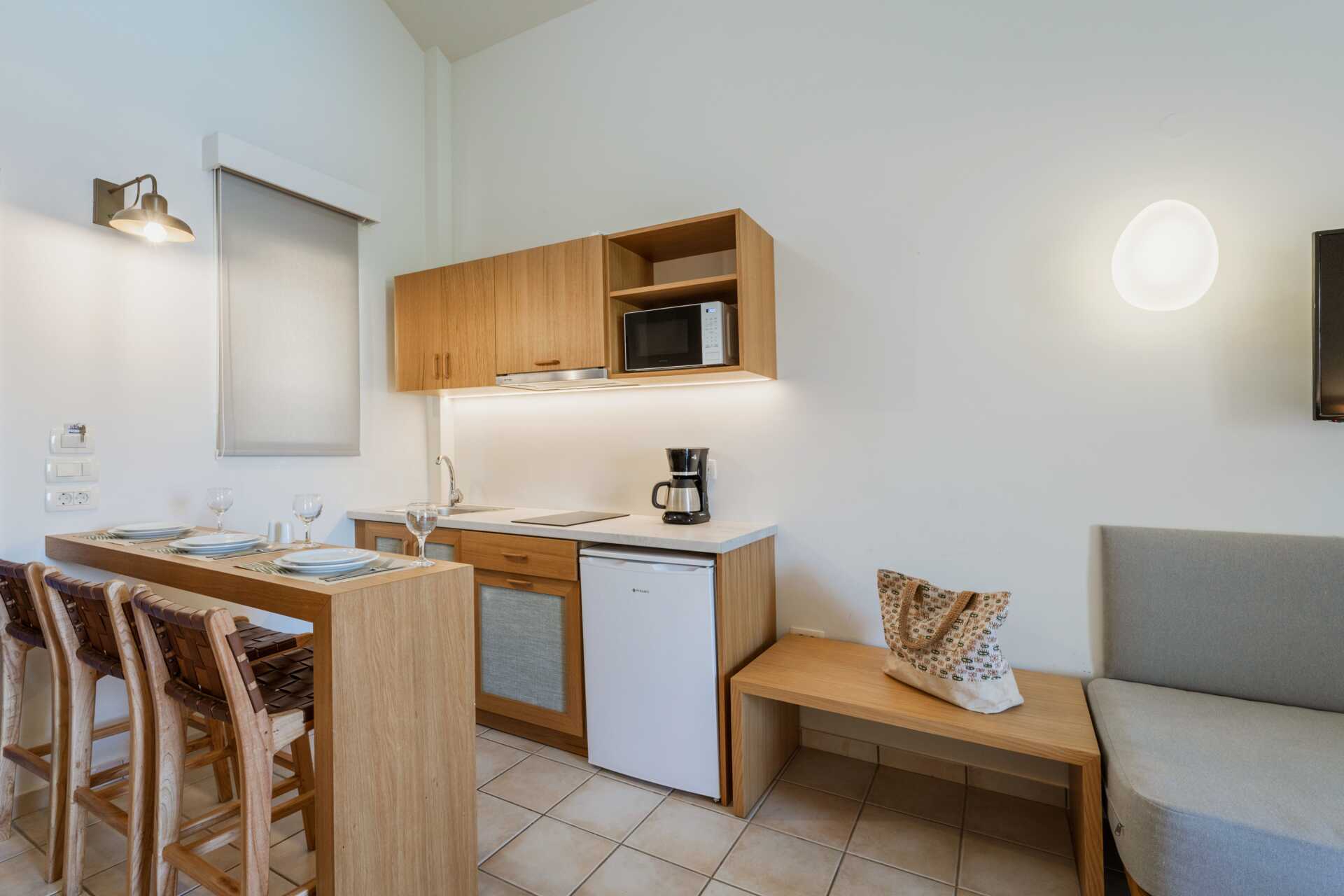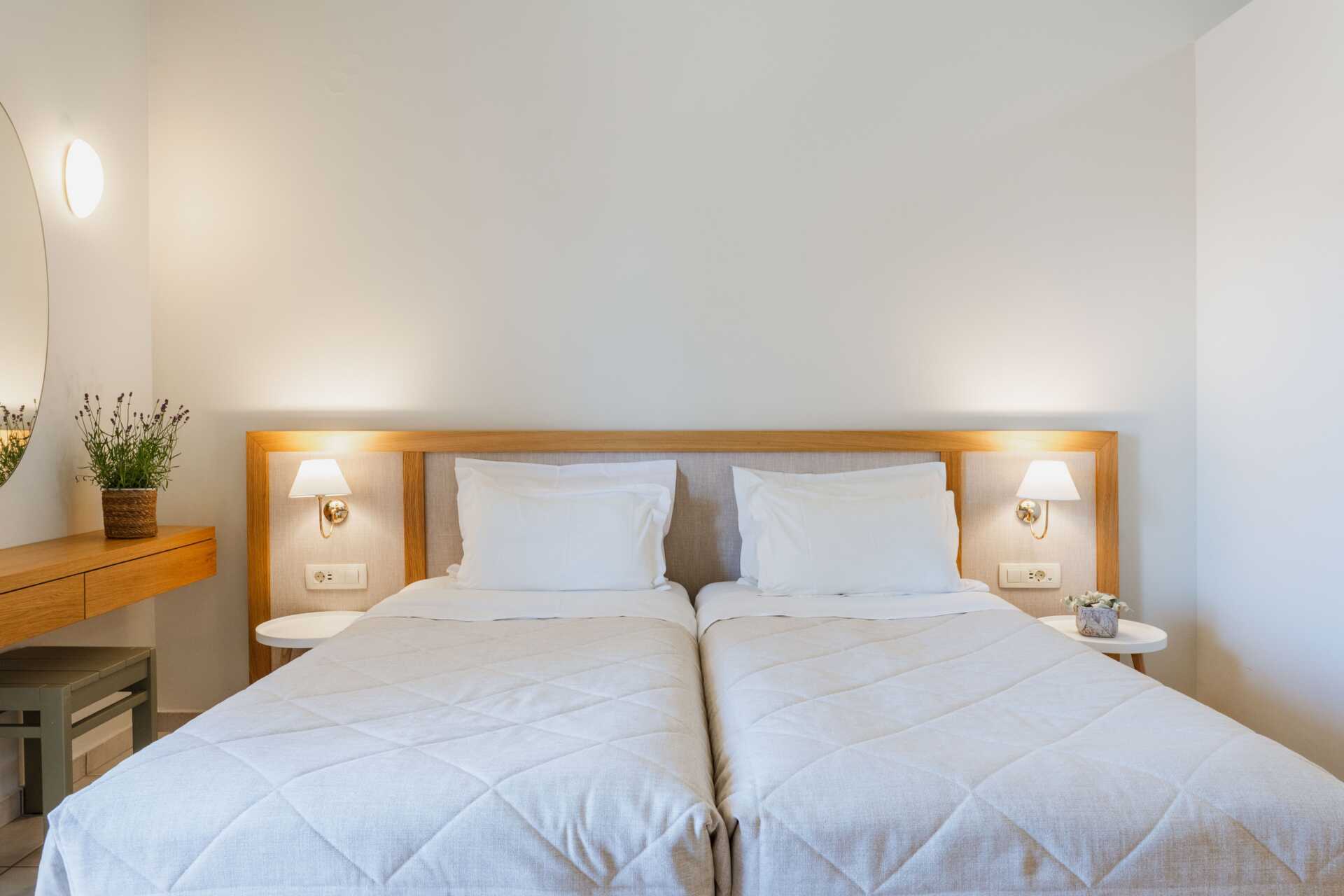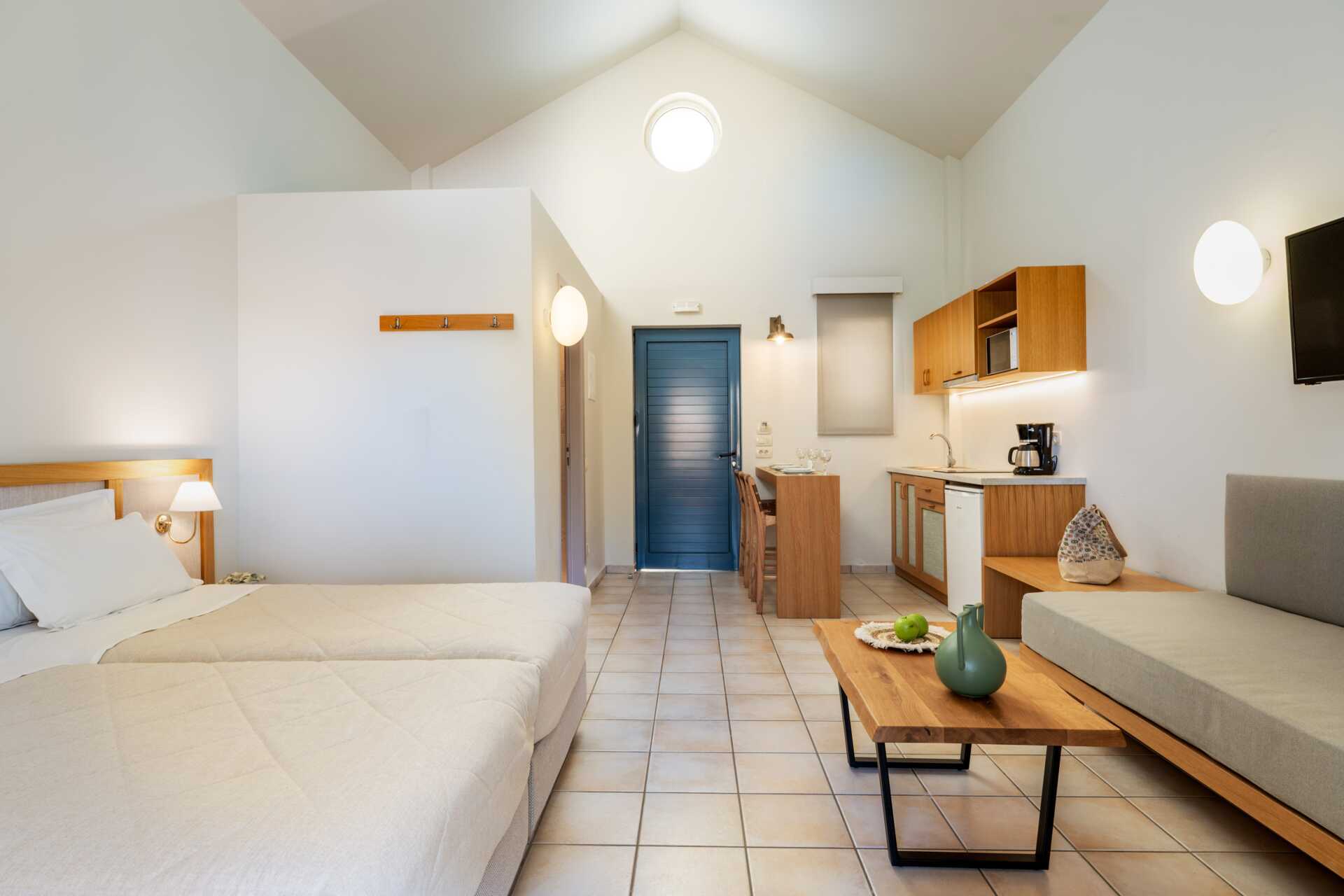 Studio met balkon of balkon op de grond, sommige balkons hebben uitzicht op het zwembad. In de appartementen met zwembadzicht moet de derde persoon een kind zijn. Gecombineerde slaapkamer en minikeuken. Twee eenpersoonsbedden. Mogelijkheid voor extra bed in slaapbank. Minikeuken met kookplaten, koelkast, koffiezetapparaat, tosti-grill en basiskeukengerei. Wifi, airconditioning en kluisje inbegrepen. Tv met lokale zenders. Föhn. Badkamer met douche en toilet. Schoonmaak 6 keer/week.