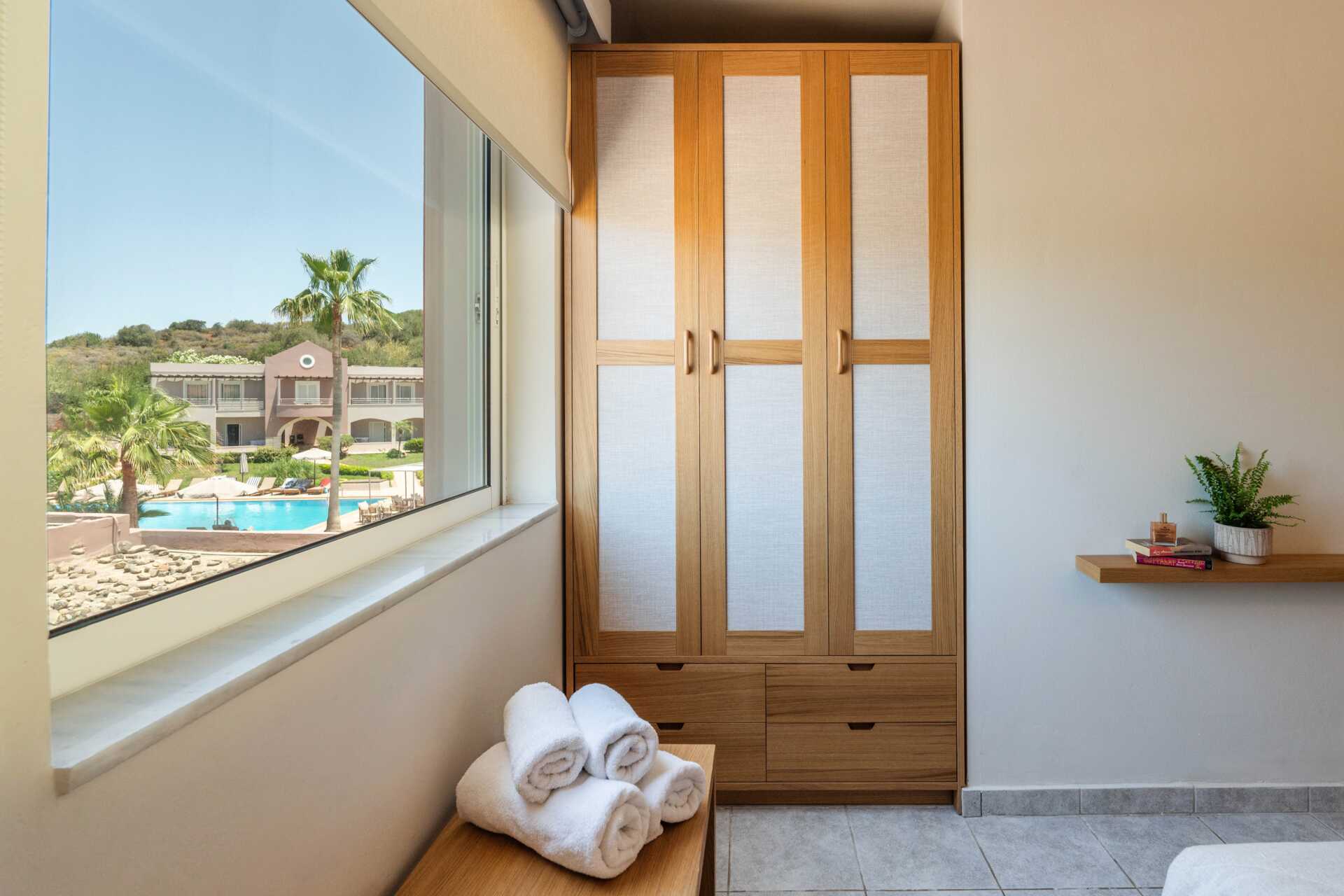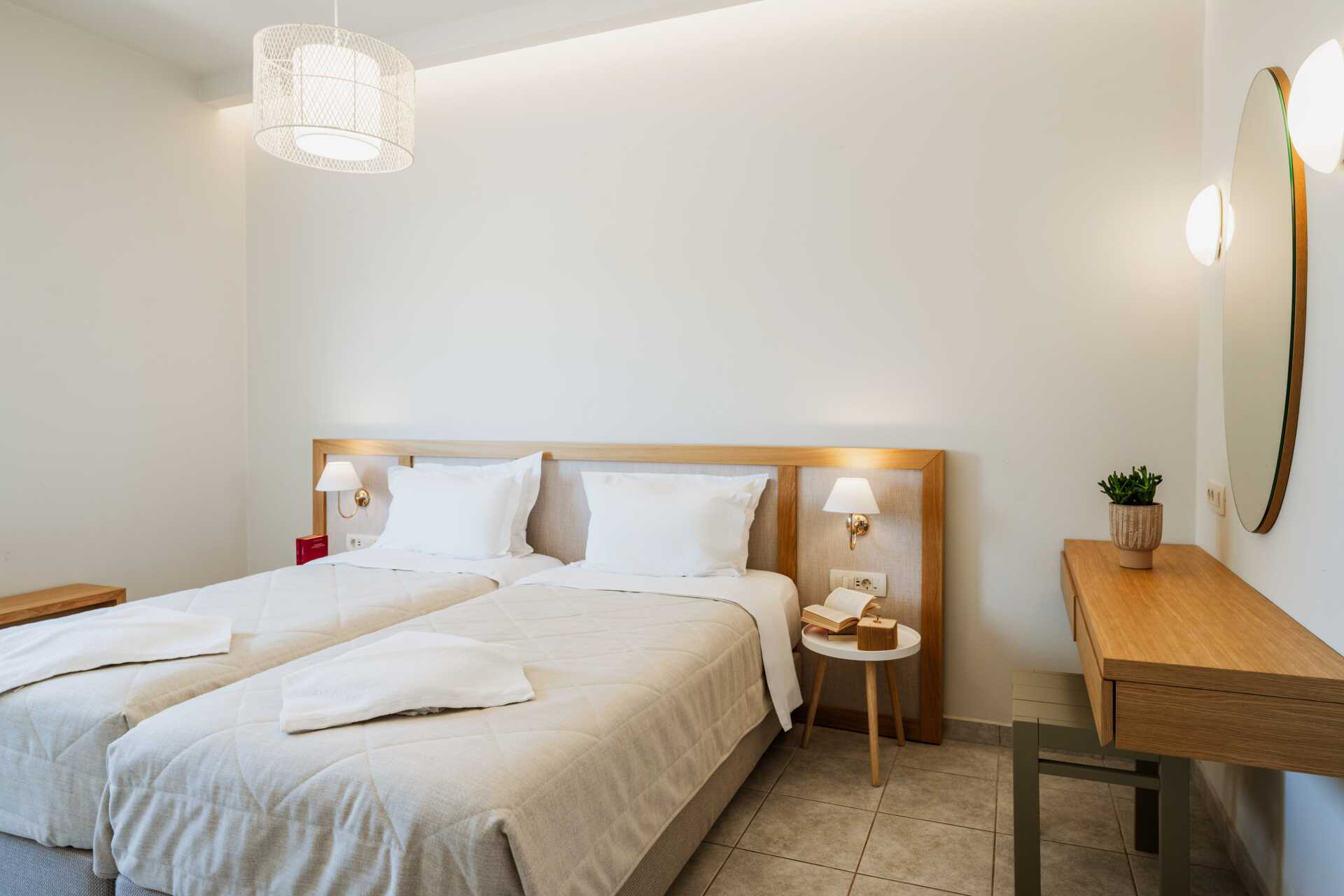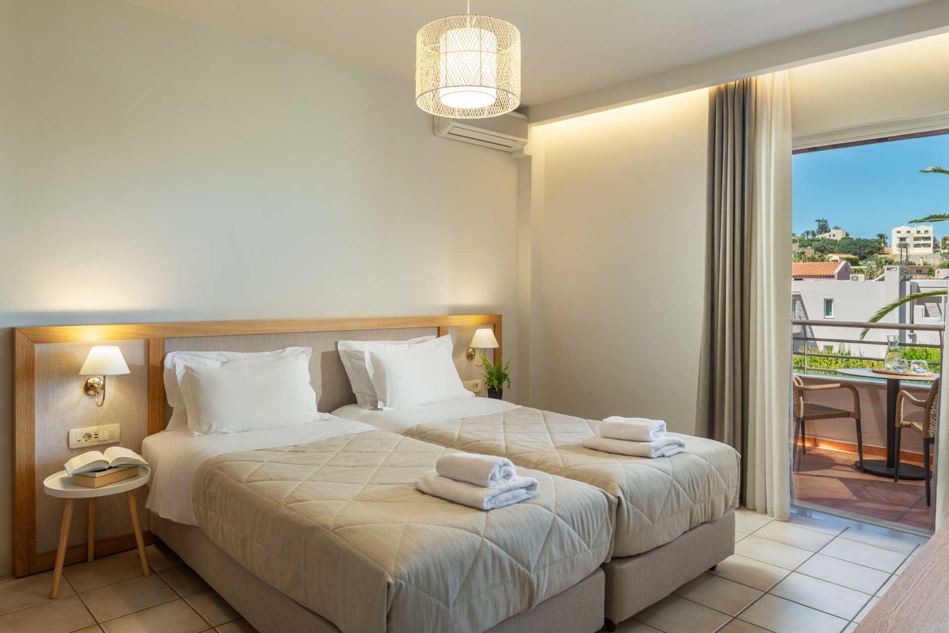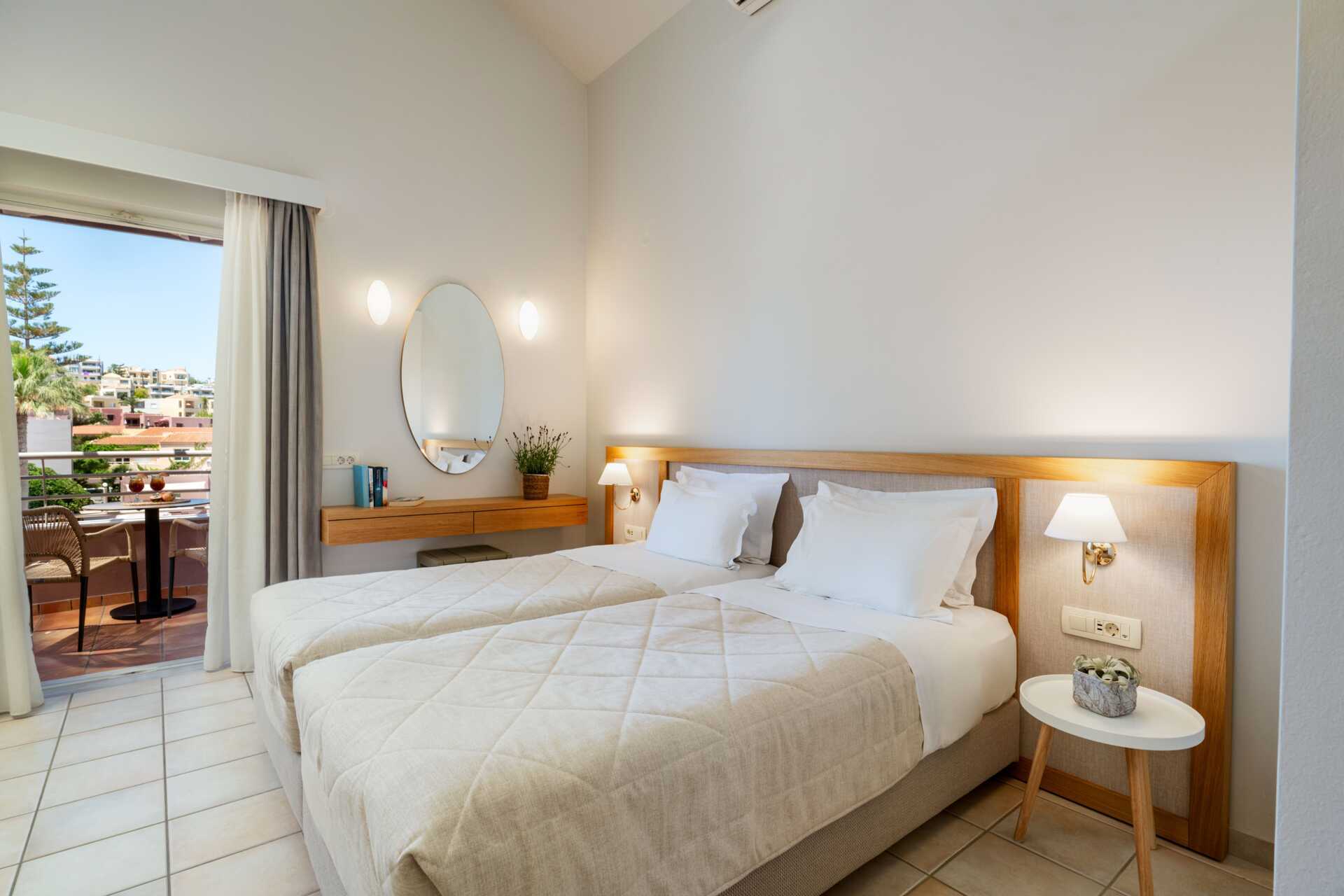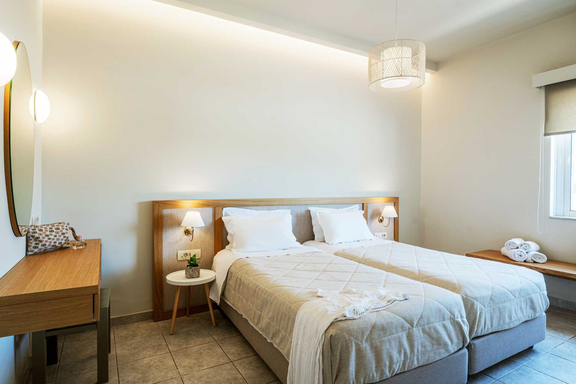 Studio met balkon of balkon op de grond, sommige balkons hebben uitzicht op het zwembad. In de appartementen met zwembadzicht moet de derde persoon een kind zijn. Gecombineerde slaapkamer en minikeuken. Twee eenpersoonsbedden. Mogelijkheid voor extra bed in slaapbank. Minikeuken met kookplaten, koelkast, koffiezetapparaat, tosti-grill en basiskeukengerei. Wifi, airconditioning en kluisje inbegrepen. Tv met lokale zenders. Föhn. Badkamer met douche en toilet. Schoonmaak 6 keer/week.