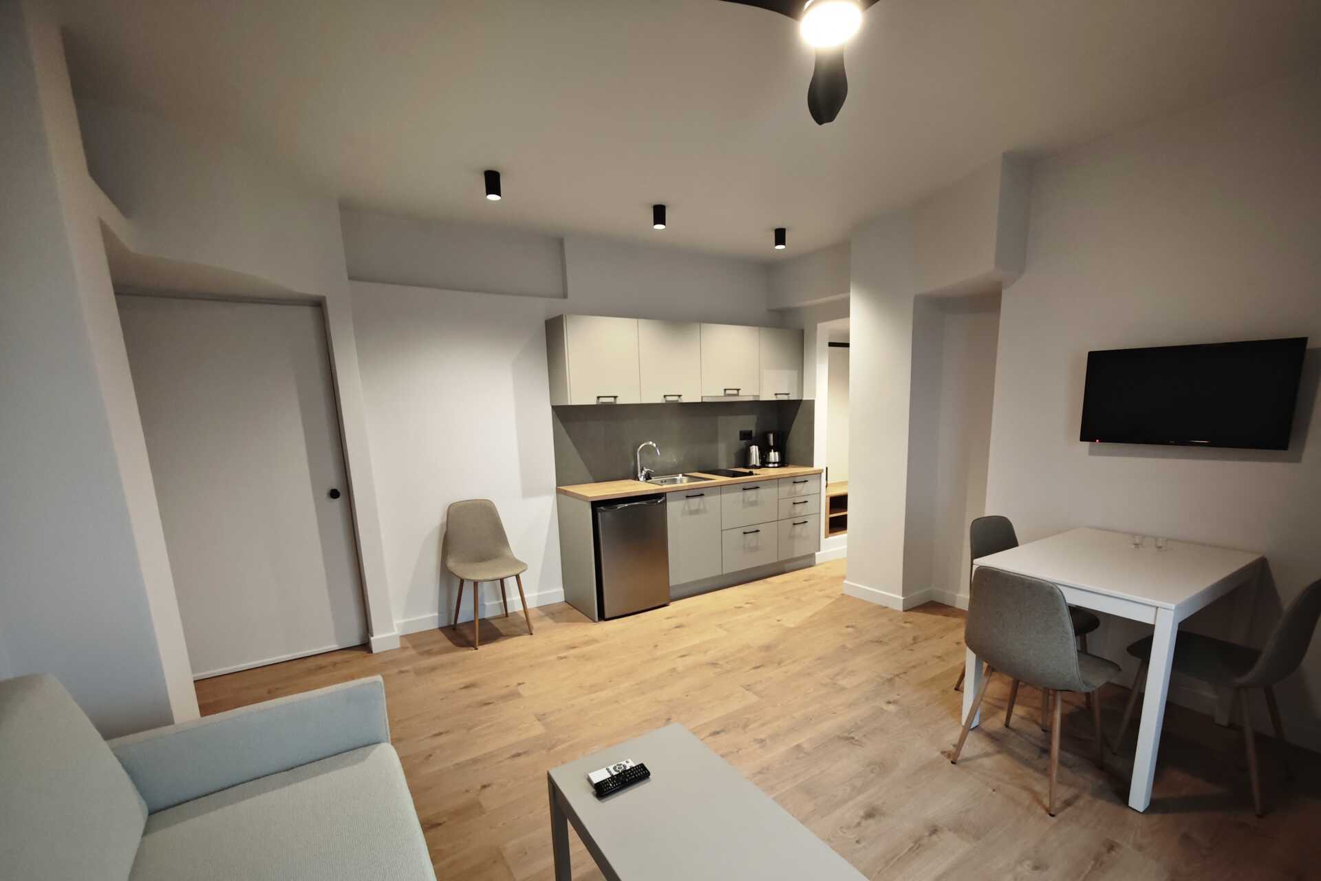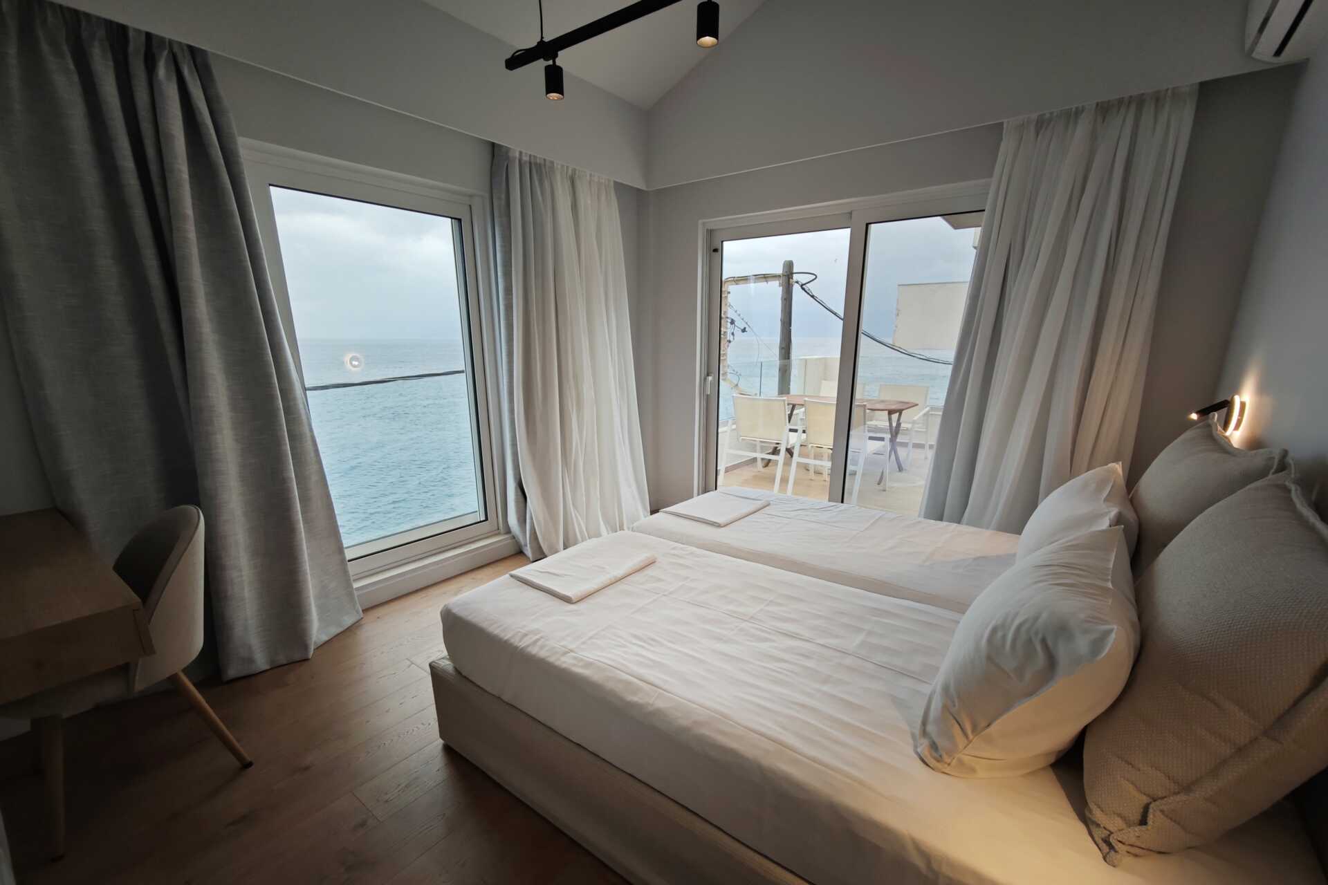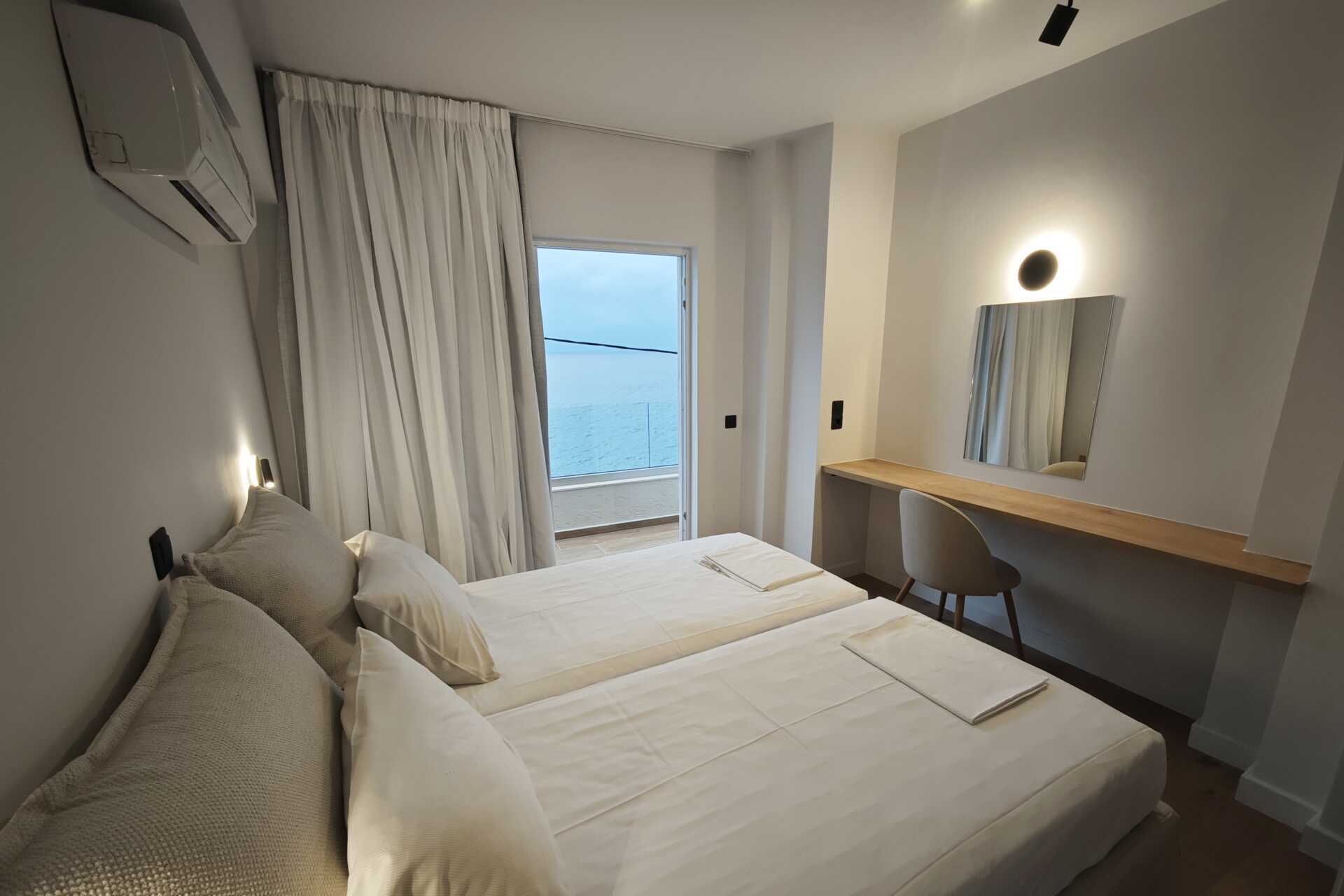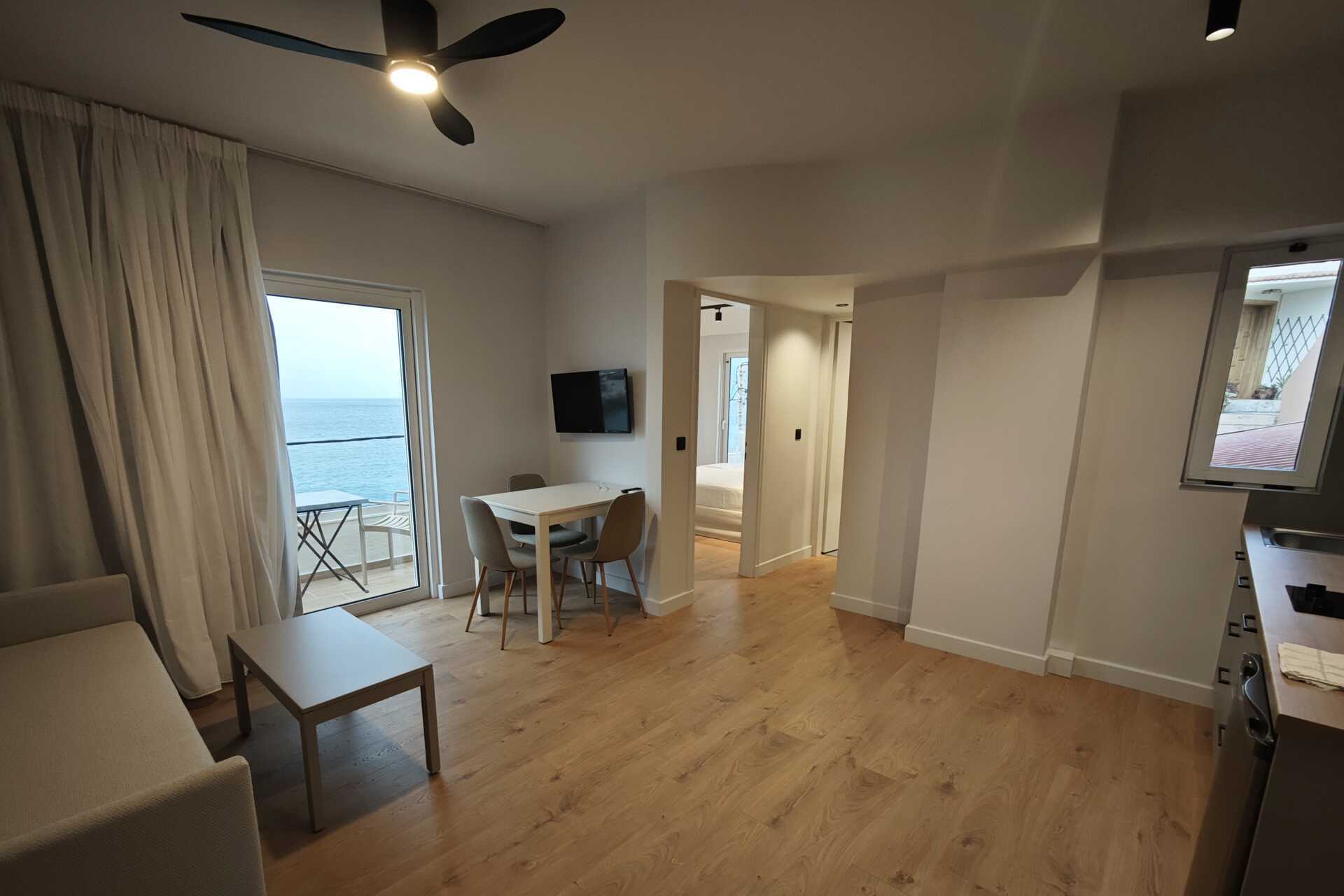 Tweekamerappartement met balkon en zeezicht - de grootte van de balkons kan sterk variëren, van een smal balkon waar twee stoelen en een smalle tafel passen tot een balkon met vier stoelen en een tafel. De specifieke grootte van het balkon kan niet worden gegarandeerd - of met een groot balkon of terras met zeezicht. Een slaapkamer en een gecombineerde woonkamer met kitchenette. Een tweepersoonsbed of twee eenpersoonsbedden. Mogelijkheid tot extra bed in de vorm van een slaapbank. Kitchenette met kookplaat, koelkast, waterkoker, koffiezetapparaat en basiskeukengerei. Wifi, airconditioning en kluisje inbegrepen. Televisie met lokale zender. Föhn. Badkamer met douche en toilet. Schoonmaak 6 keer/week.