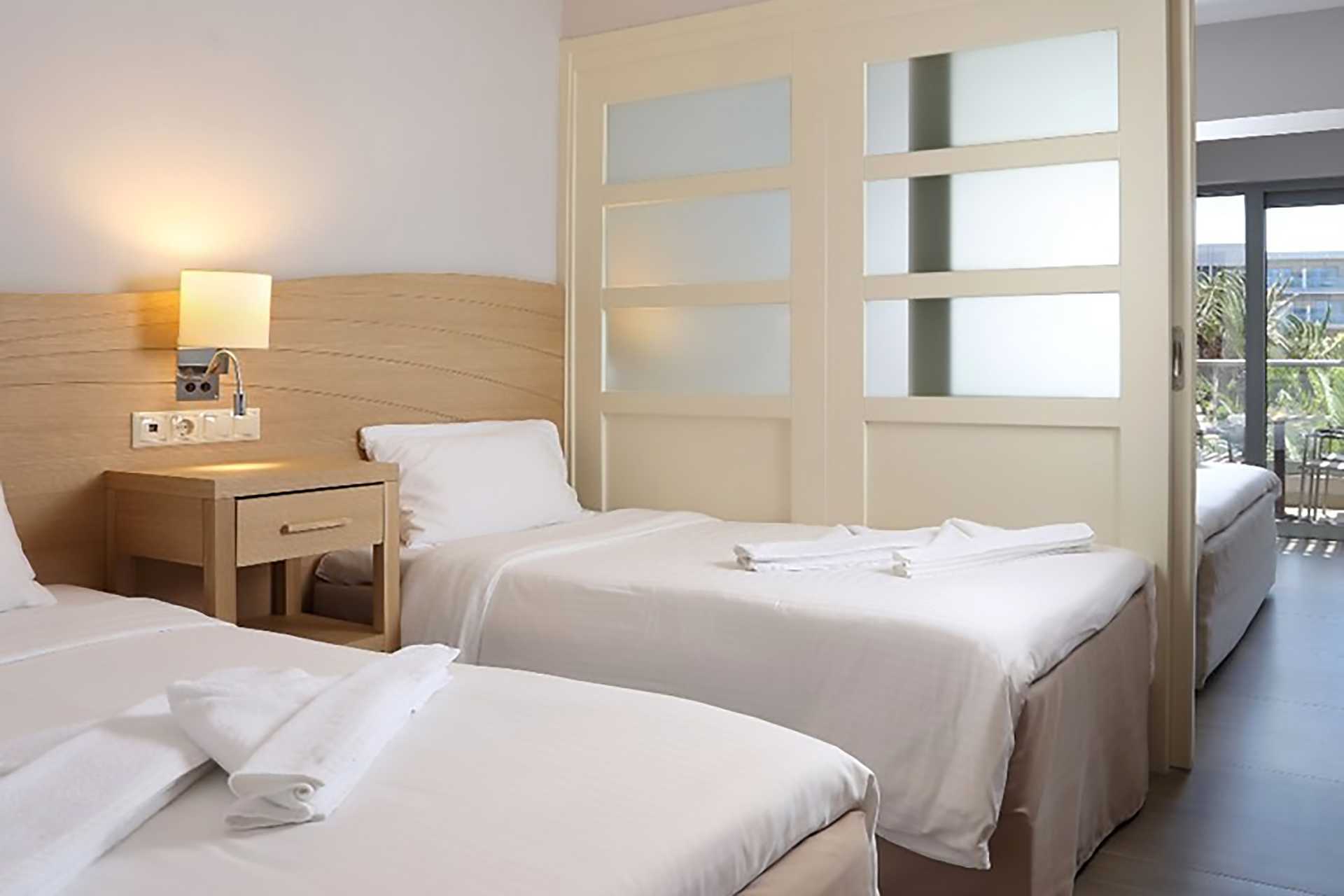 Familiekamer met balkon, sommige met beperkt uitzicht op zee. Eén slaapkamer en een gecombineerde woon-/slaapkamer. Een tweepersoonsbed of twee eenpersoonsbedden. Wifi, airconditioning en kluis inbegrepen. Koelkast. Waterkoker en koffie en thee. Nespresso-apparaat - capsules inbegrepen en elke dag bijgevuld. Magnetron. TV met internationale zenders. Strijkijzer en strijkplank. Föhn. Badkamer met douche en wc. Schoonmaak 7 keer/week. Kinderen jonger dan twee jaar zijn inbegrepen in het maximale aantal personen in de kamer.