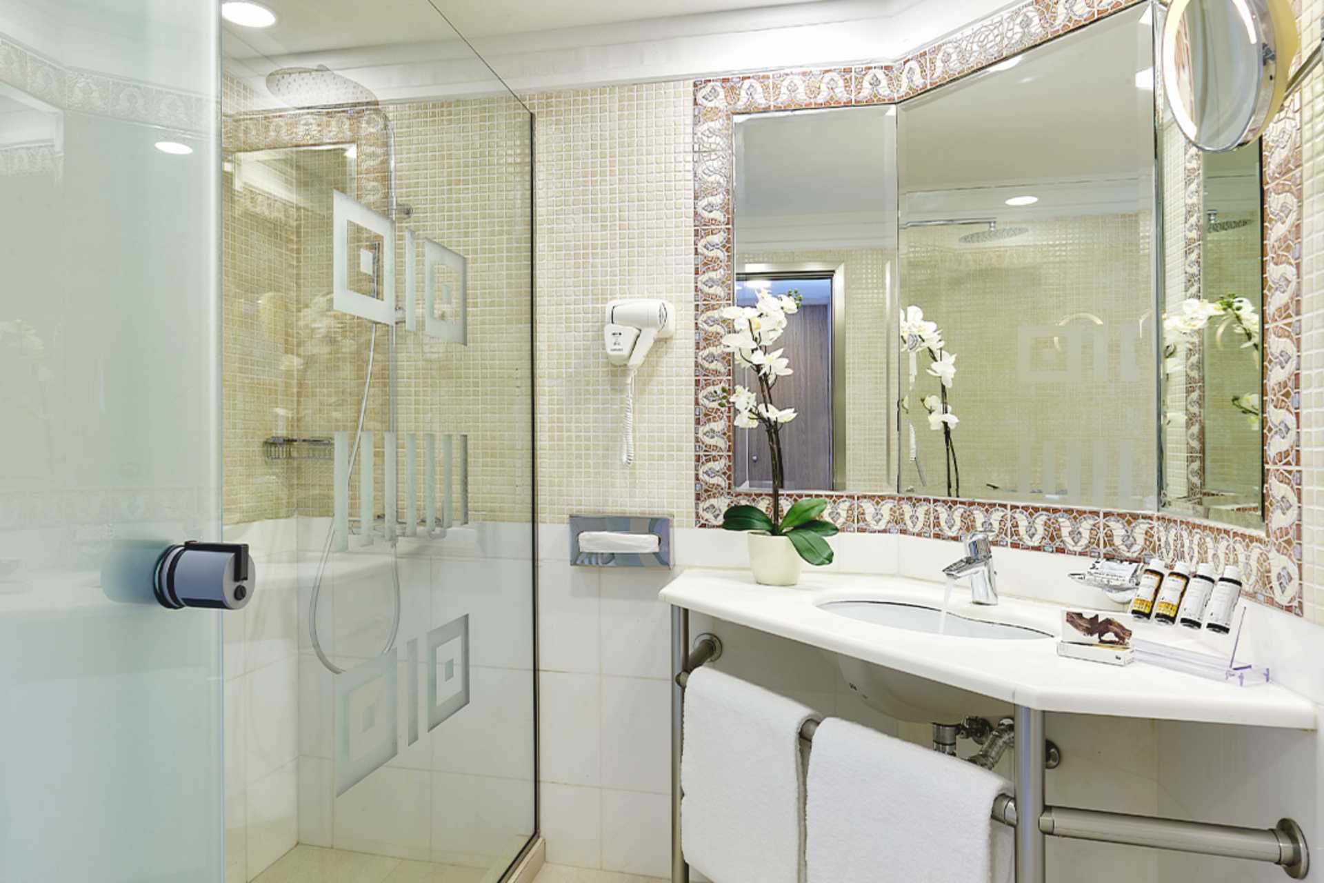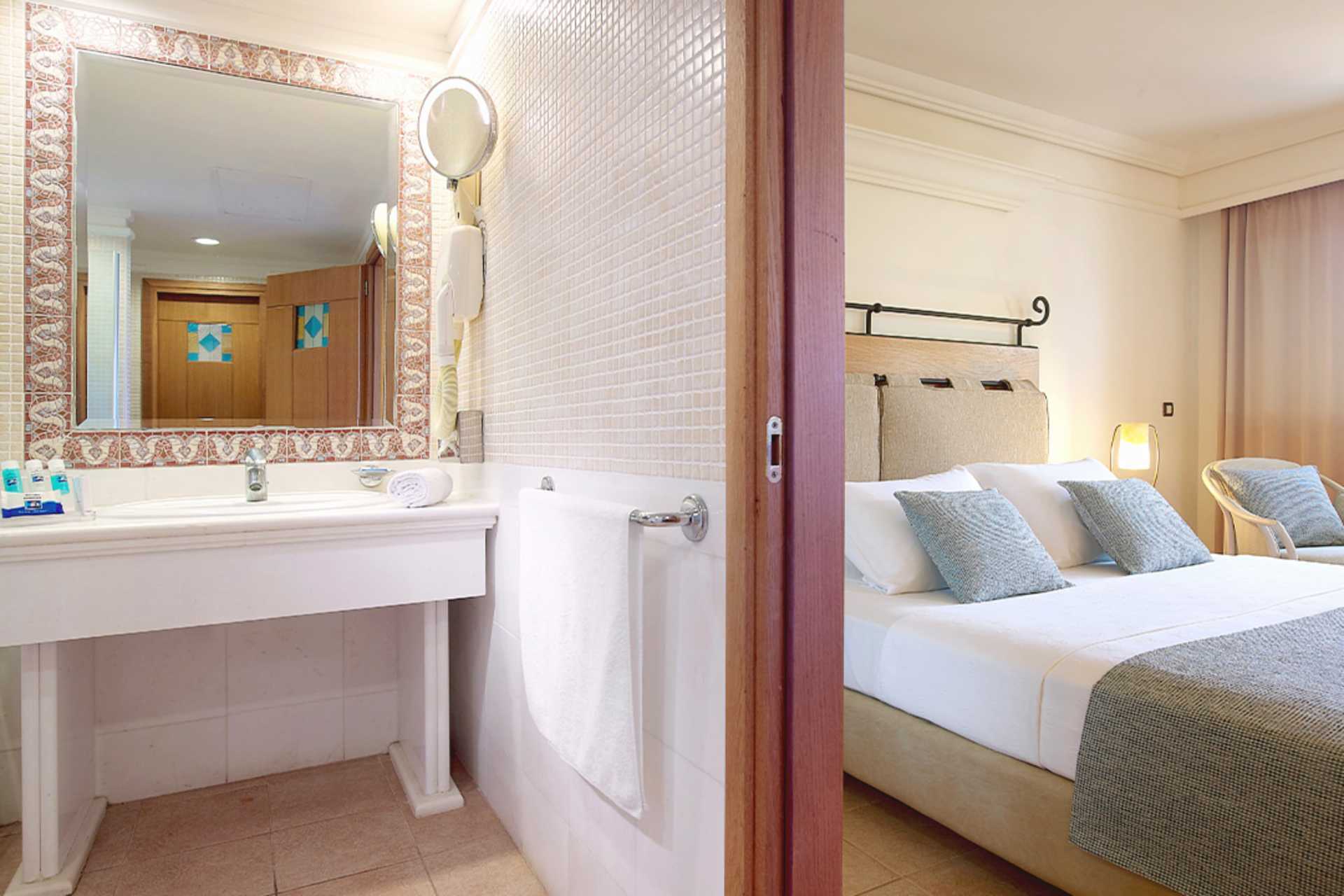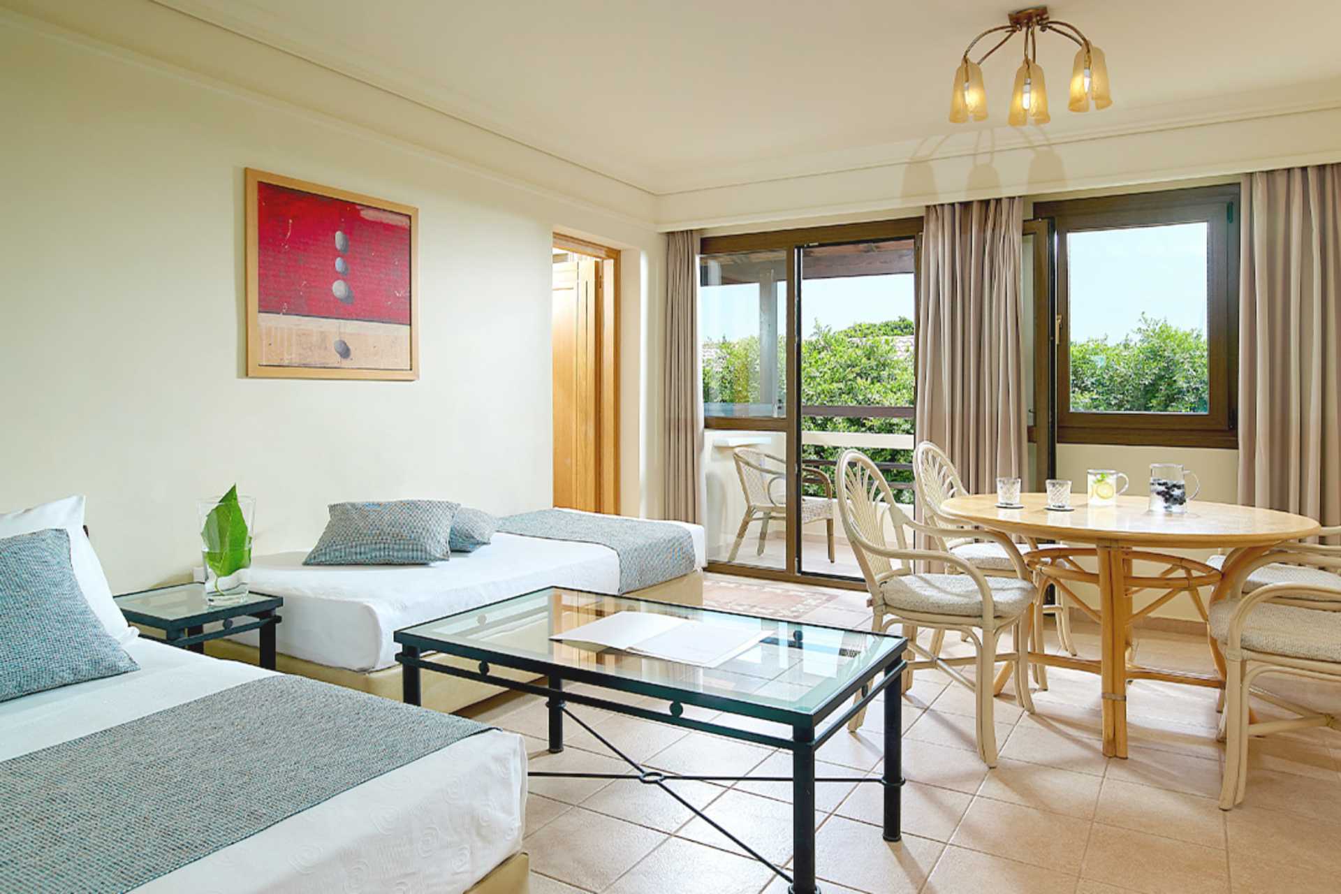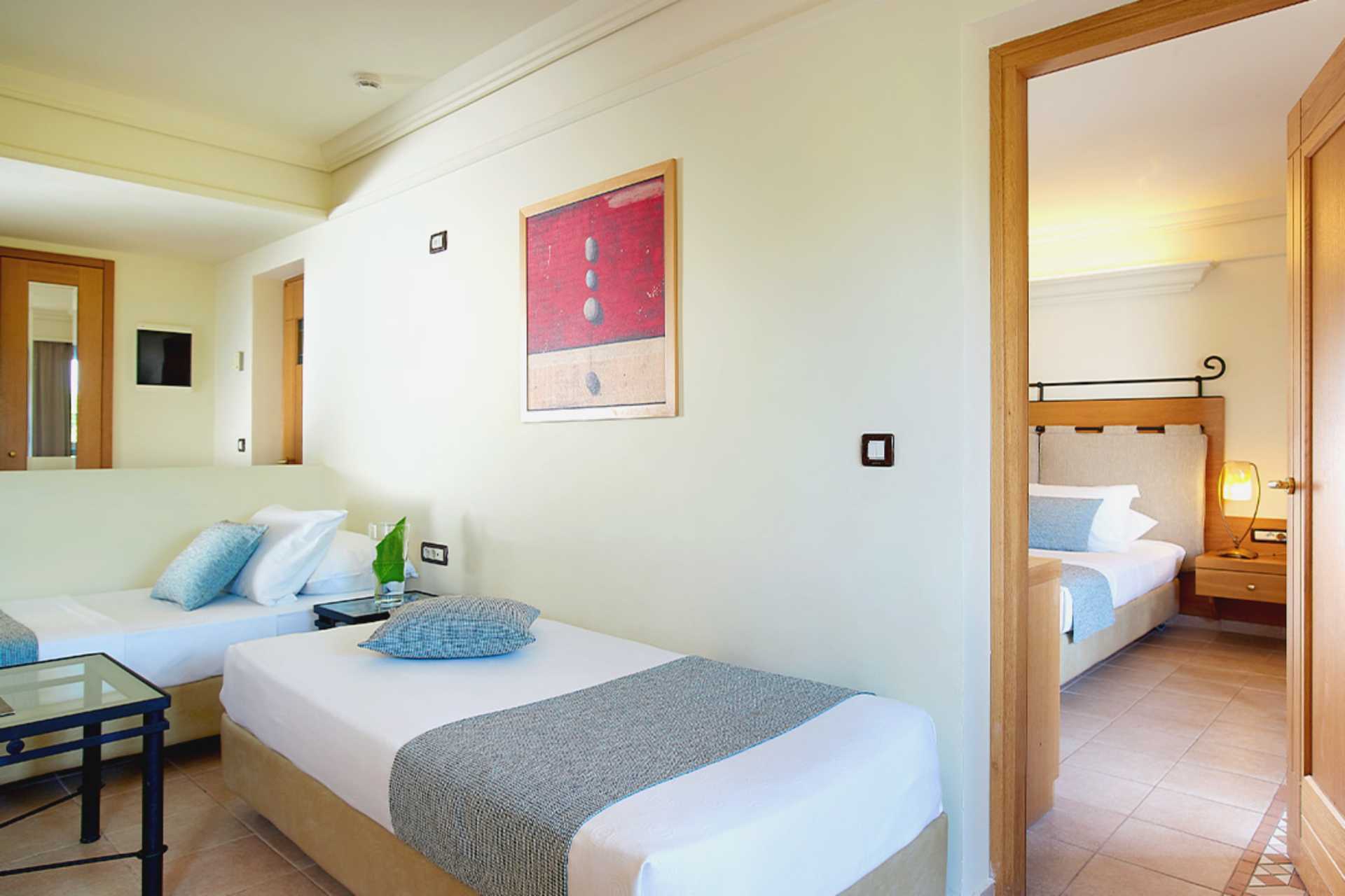 Familiekamer met balkon of terras. De kamer bestaat uit een slaapkamer en een woonkamer. Twee eenpersoonsbedden. Mogelijkheid tot extra bedden in twee slaapbanken. Wifi, airconditioning en kluisje inbegrepen. Koelkast. Waterkoker en koffie en thee. Welkomstpakket met alcoholvrije wijn bij aankomst. Badjassen, slippers en handdoeken voor het zwembad en strand. Föhn. Badkamer met ligbad en apart toilet. Schoonmaak 7 keer/week. Kinderen jonger dan twee jaar zijn inbegrepen in het maximale aantal personen in de kamer.