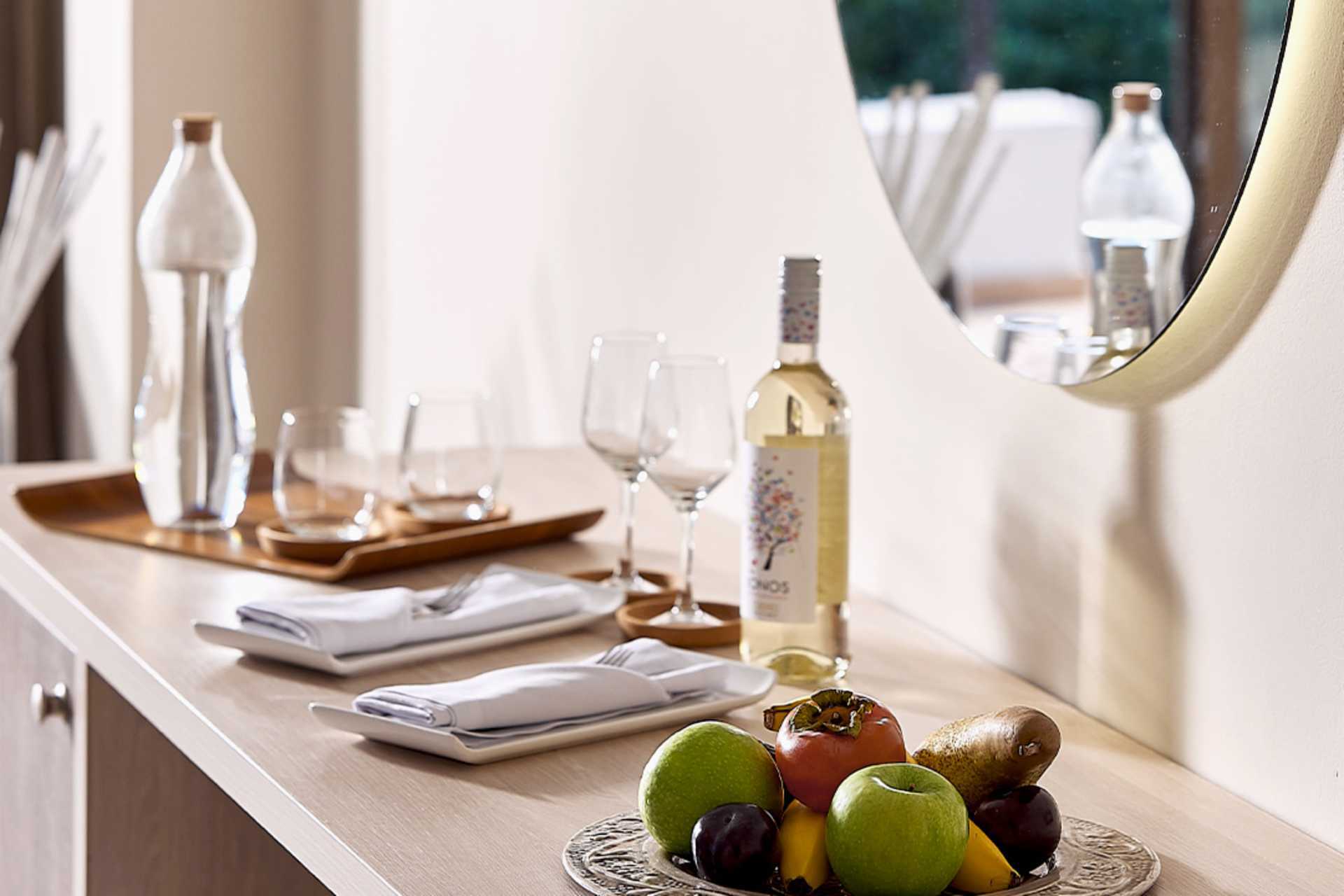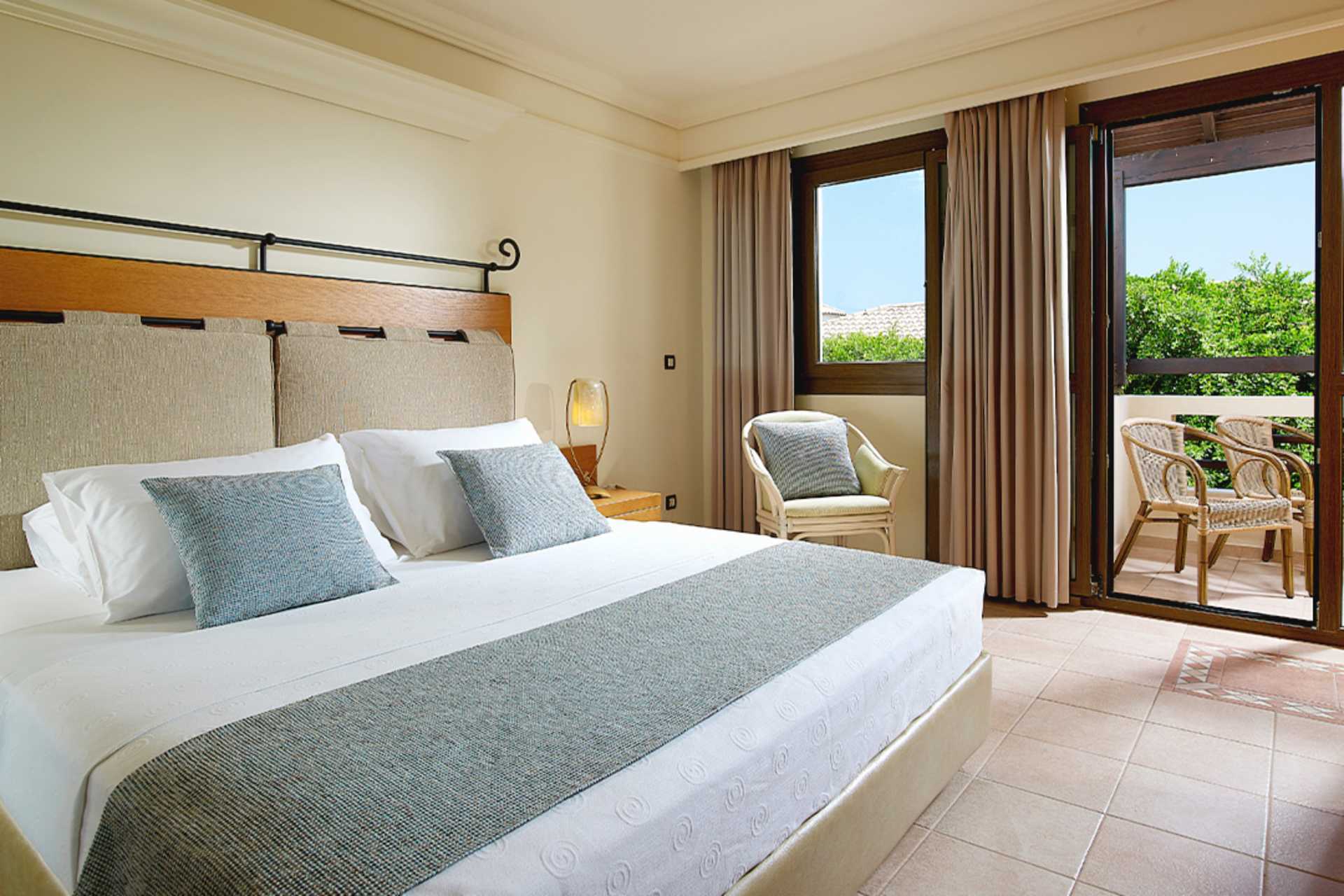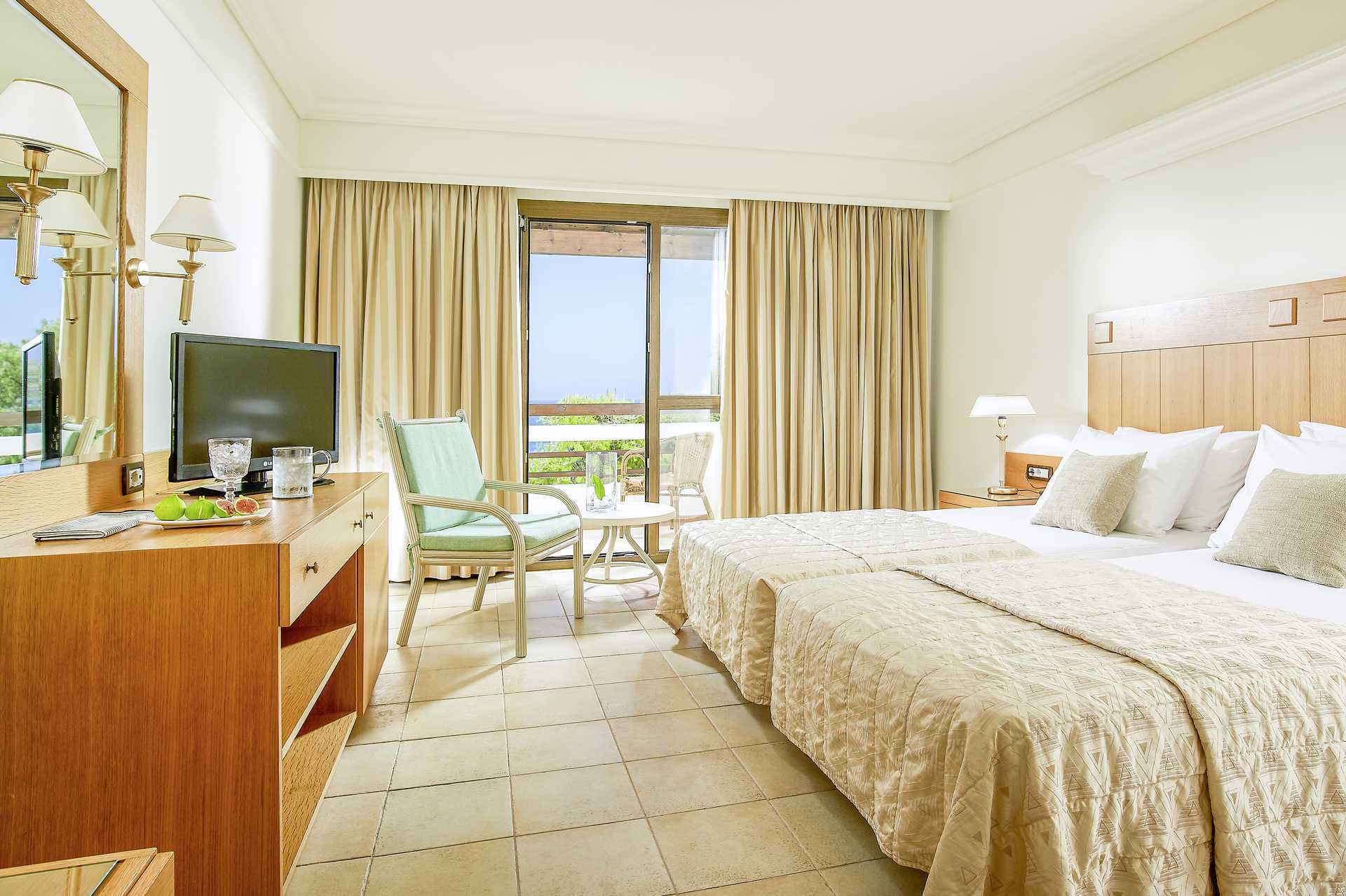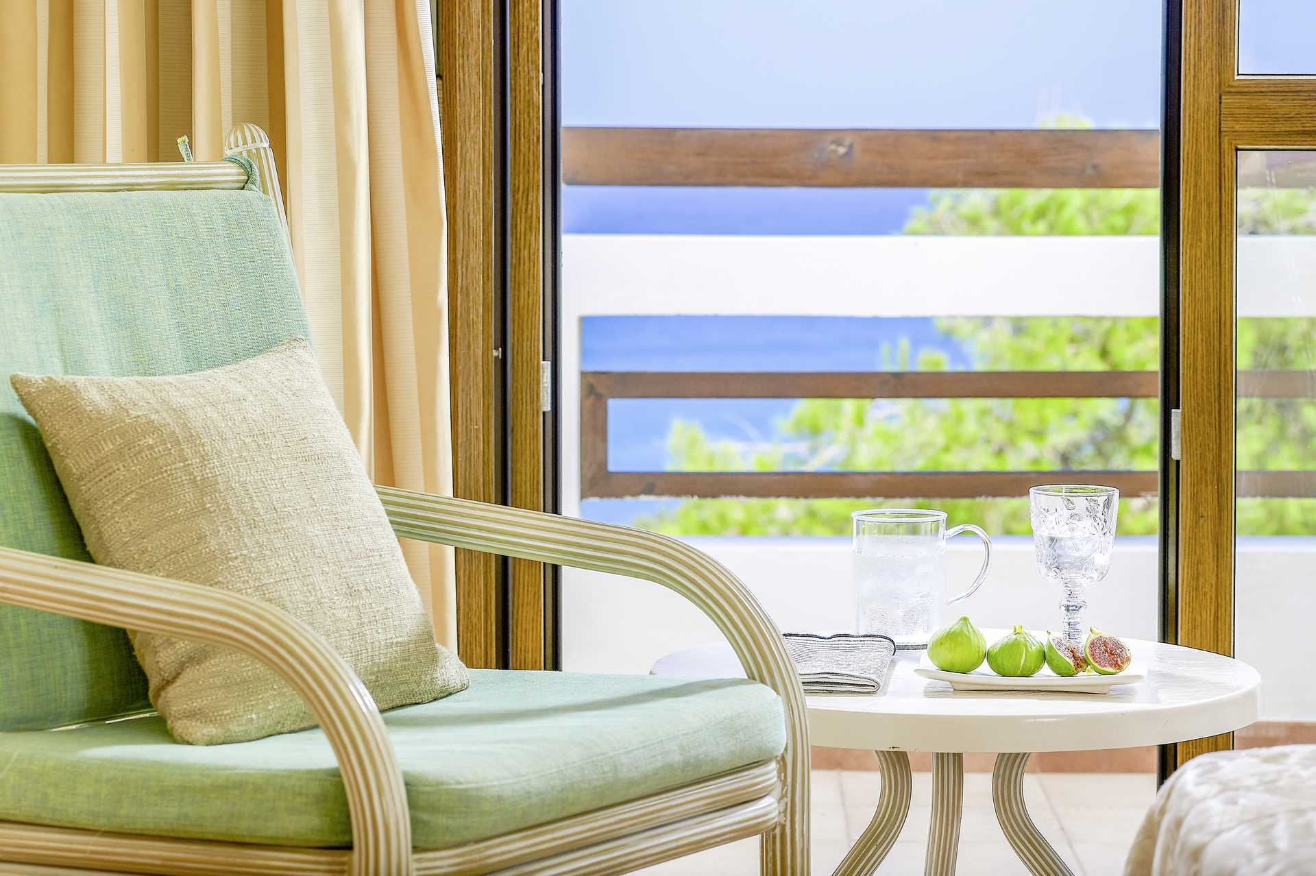 Tweepersoonskamers met balkon of terras, sommige met zeezicht. Een tweepersoonsbed. Mogelijkheid voor een extra bed op slaapbank. Wifi, airconditioning en kluisje inbegrepen. Koelkast. Waterkoker en koffie- en theefaciliteiten. Welkomstpakket met water en wijn bij aankomst. TV met internationale zenders. Föhn. Badjassen en hotelslippers en zwembad- en strandlakens. Badkamer met bad en toilet. 7 keer/week schoonmaak. Kinderen jonger dan 2 jaar zijn inbegrepen in het maximum aantal personen in de kamer.