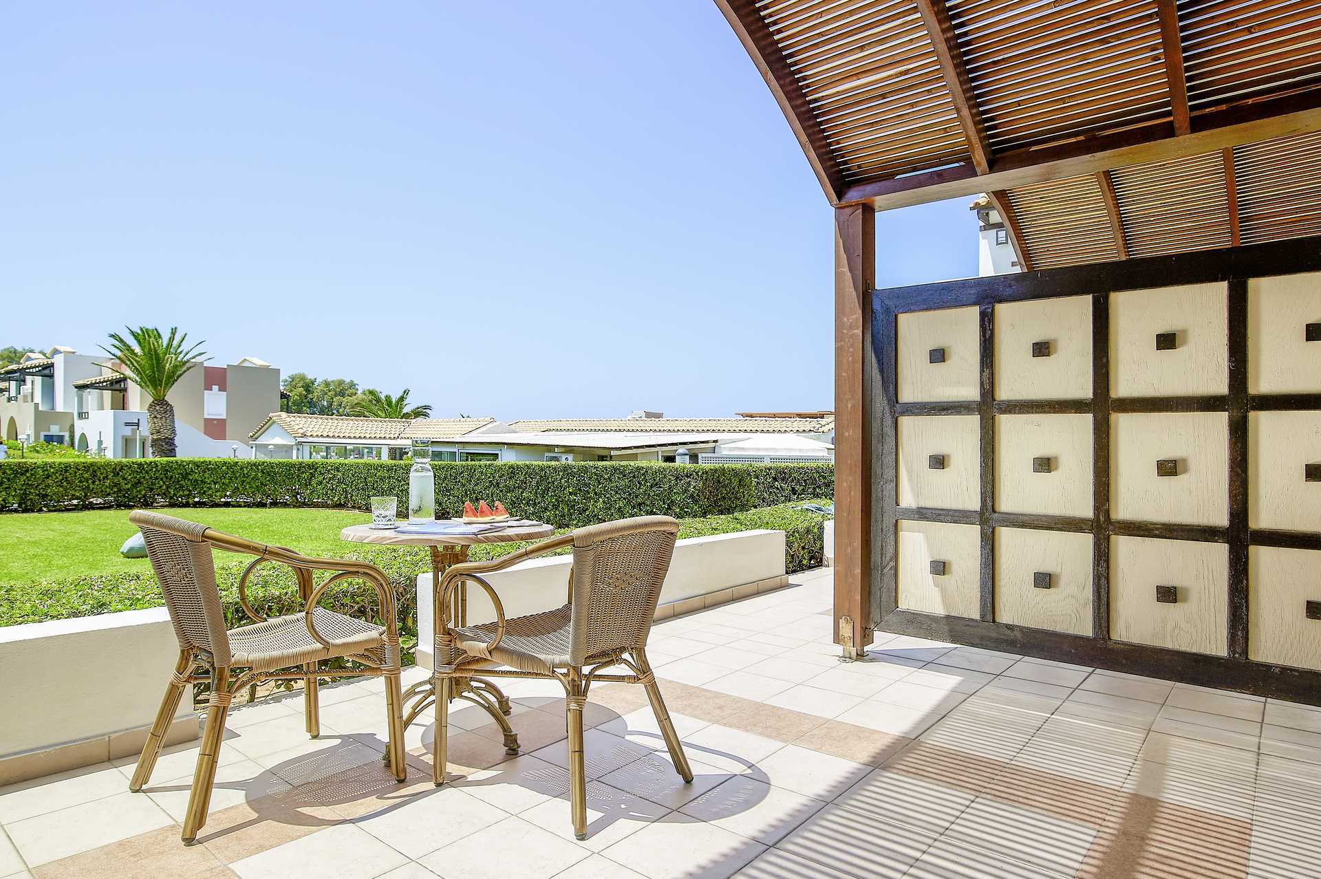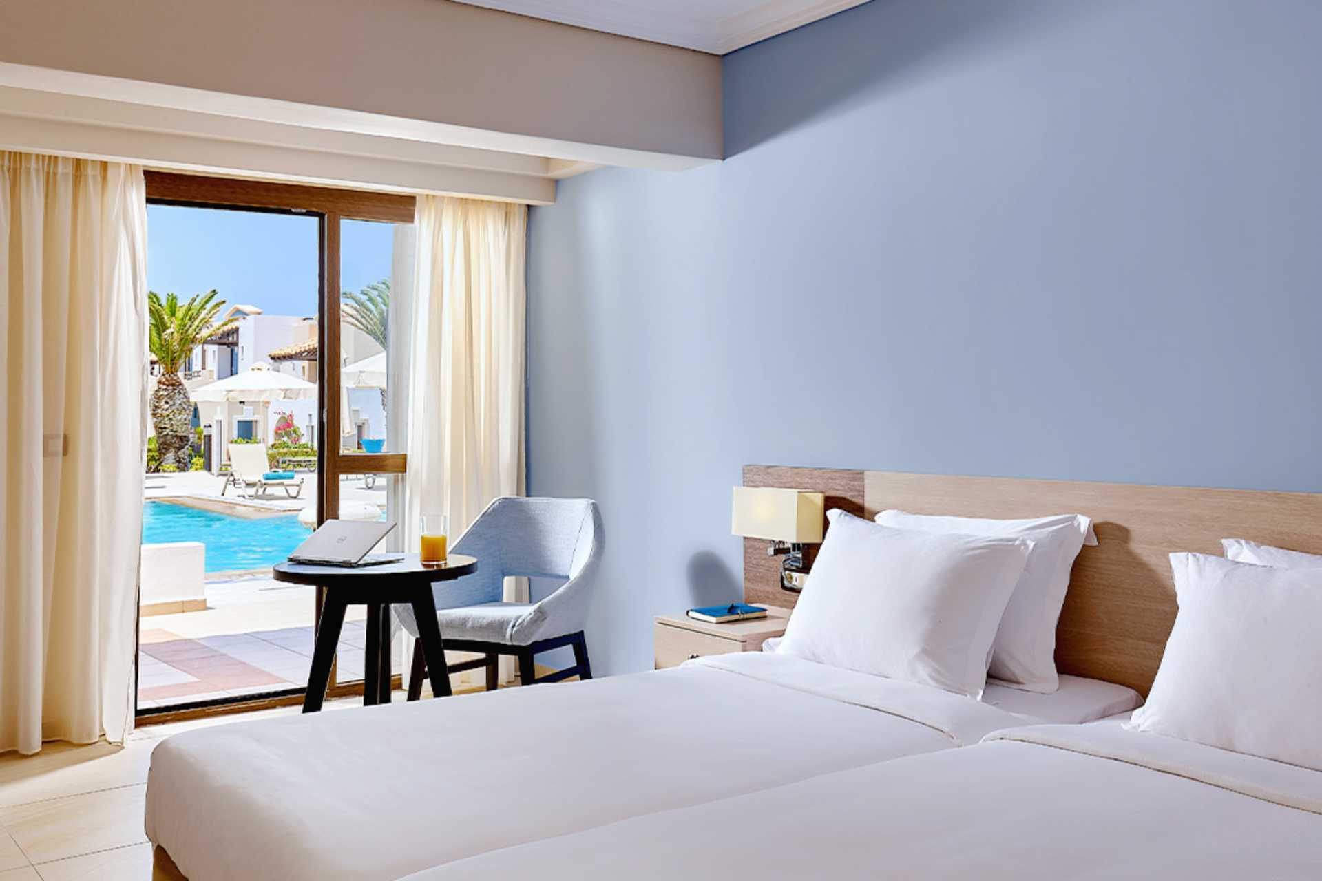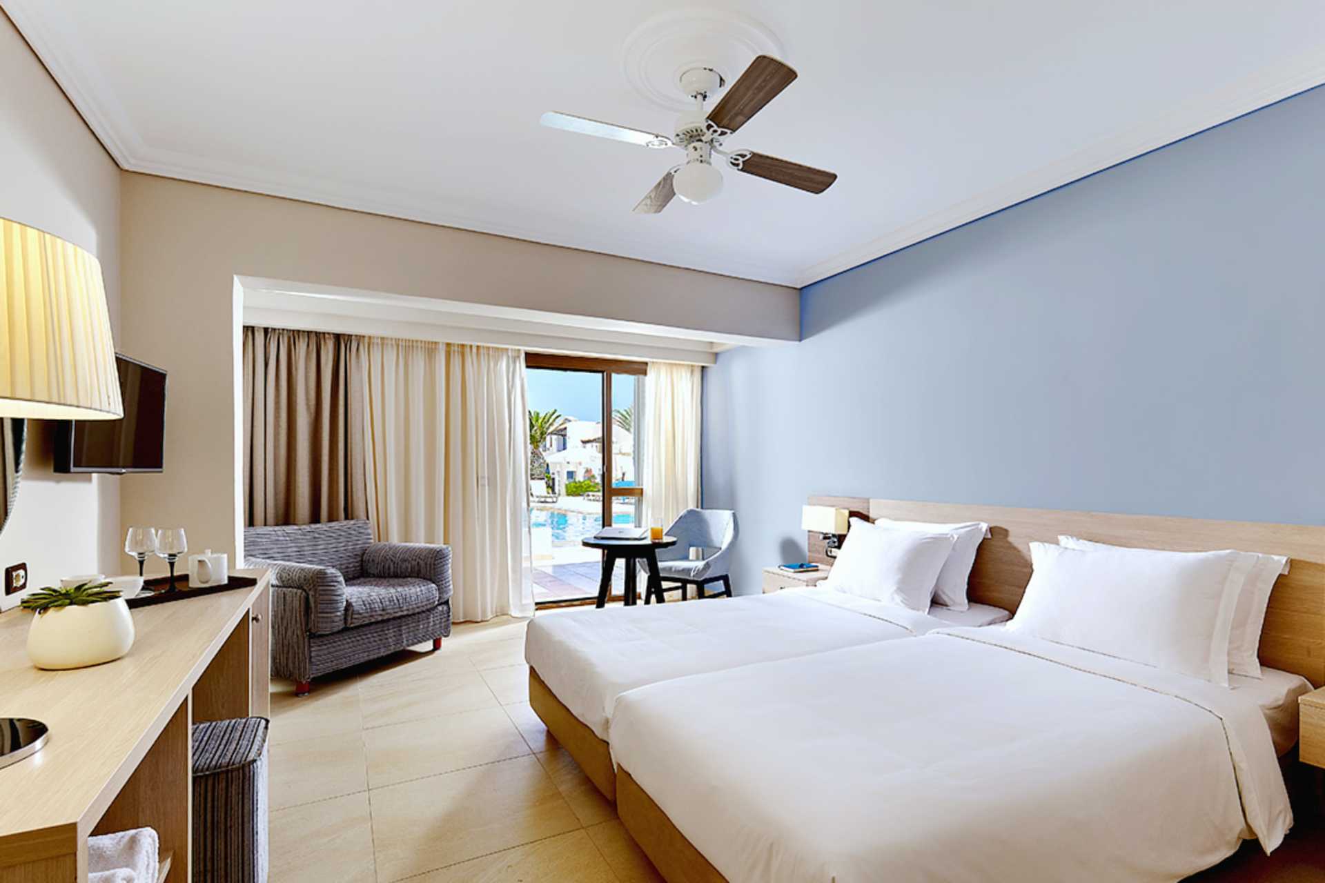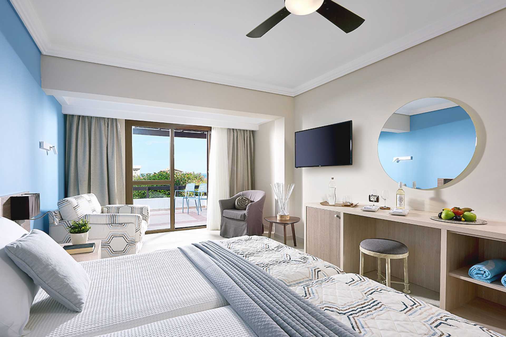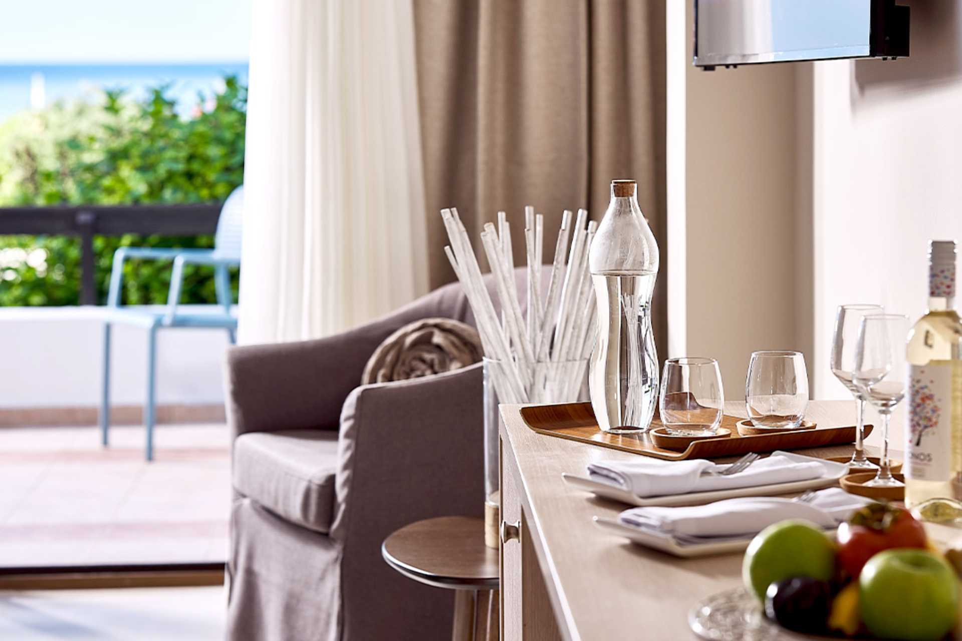 Superior kamers met terras aan zeezijde, en een gedeeld zwembad. De kamers bevinden zich in de gebouwen die het dichtst bij de zee liggen. Twee eenpersoonsbedden. Mogelijkheid tot een extra bed op de slaapbank. Wifi, airconditioning en kluisje inbegrepen. Koelkast. Waterkoker en koffie en thee. Welkomstpakket met water en alcoholvrije wijn bij aankomst. Tv met internationale zenders. Föhn. Badjassen, slippers en handdoeken voor het zwembad en strand. Badkamer met douche en wc. Schoonmaak 7 keer/week. Kinderen jonger dan twee jaar zijn inbegrepen in het maximale aantal personen in de kamer.