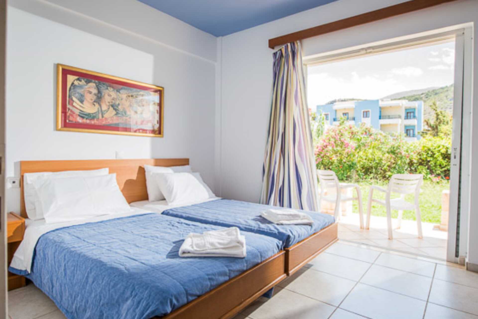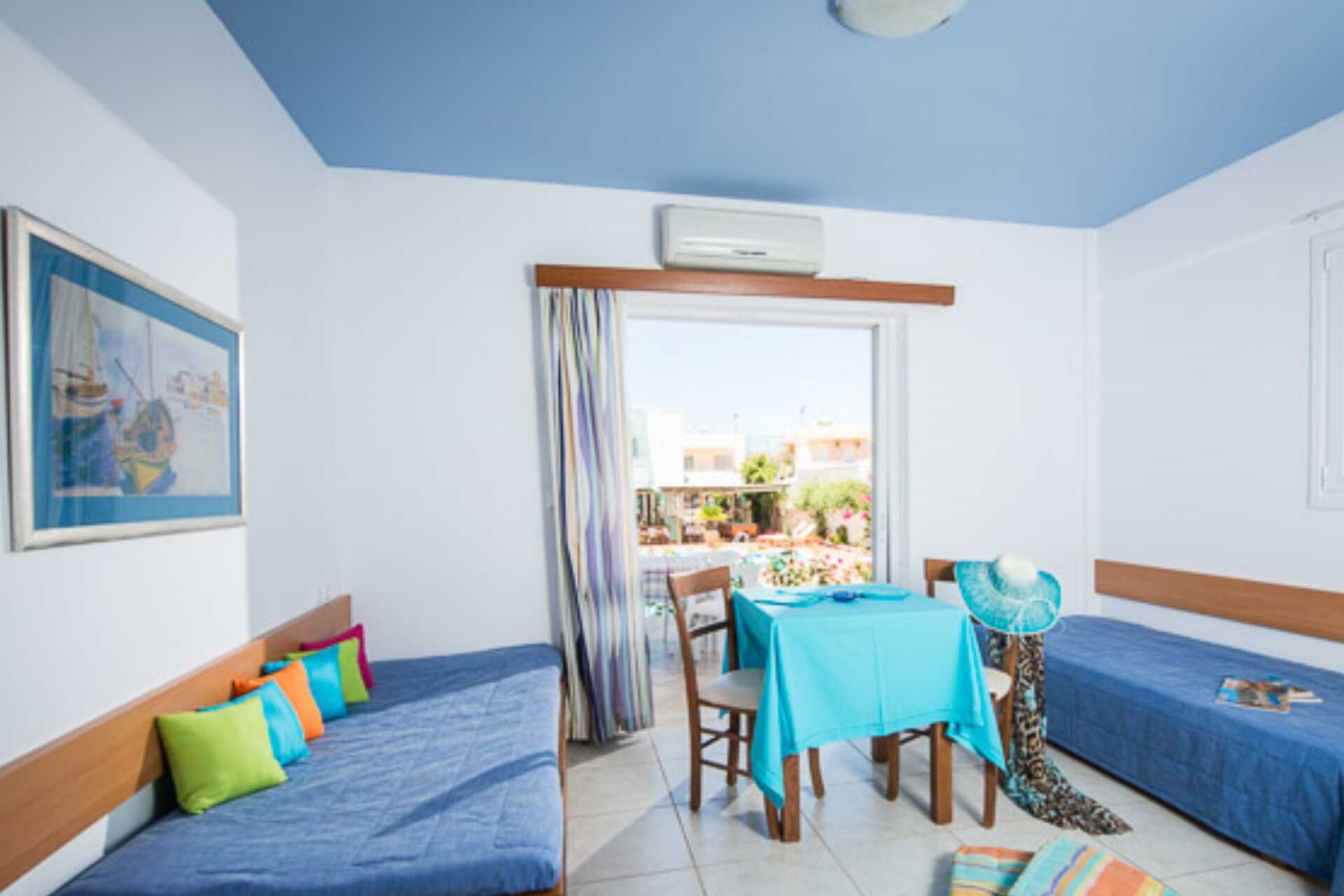 Tweekamerappartement met balkon of terras. Slaapkamer en gecombineerde woonkamer met minikeuken. Twee eenpersoonsbedden. Mogelijkheid voor twee extra bedden in de vorm van twee eenpersoonsbedden. Minikeuken met kookplaten, koelkast, koffiezetapparaat, waterkoker, koffie en thee, broodrooster en basiskeukengerei. Wifi en kluisje inbegrepen. Airconditioning tegen betaling. Tv met internationale zenders. Föhn. Badkamer met douche en toilet. Schoonmaak 7 keer / week.